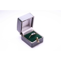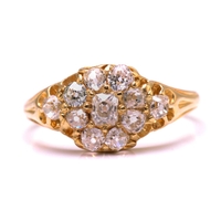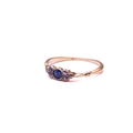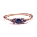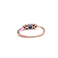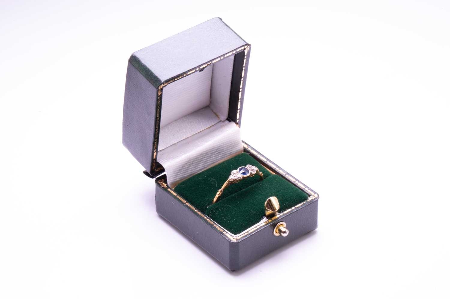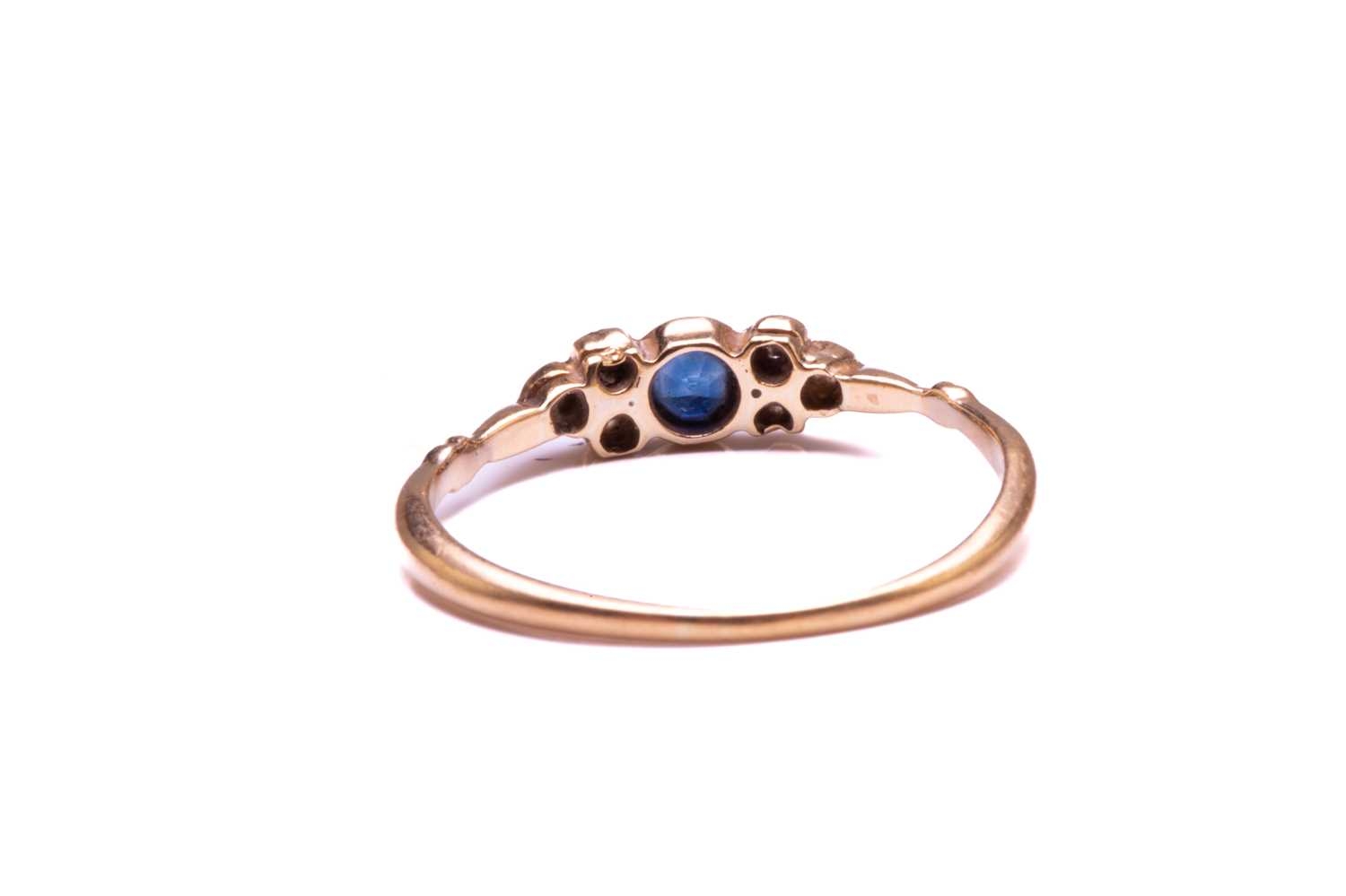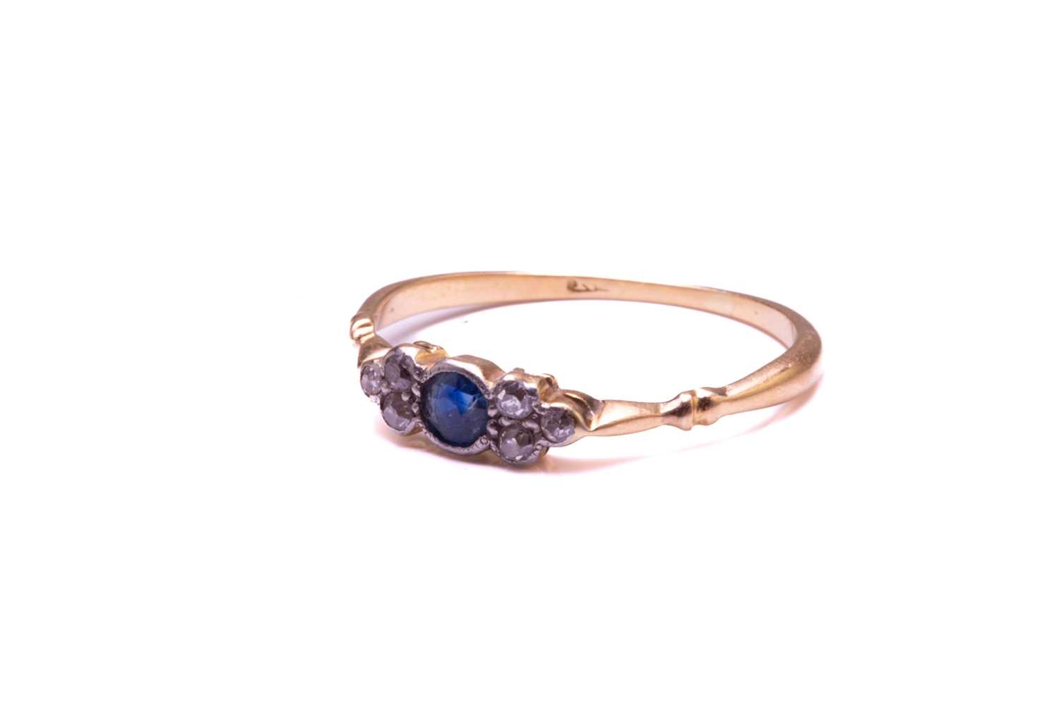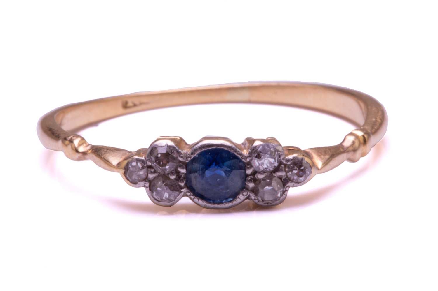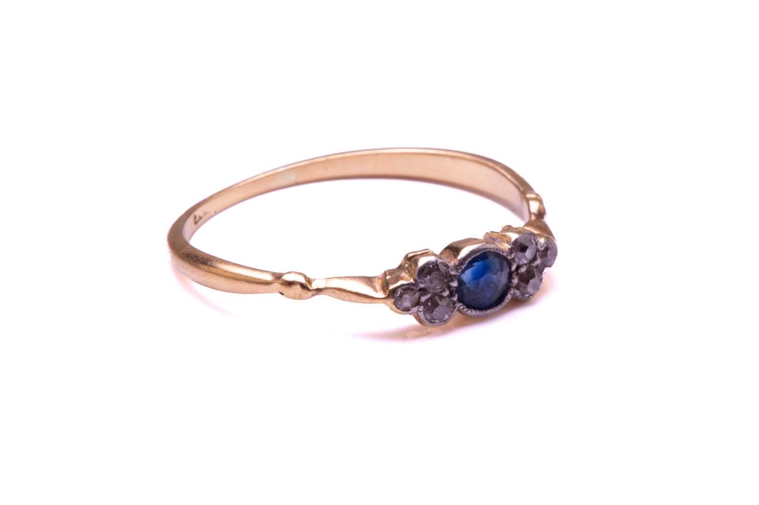 A diamond and sapphire ring, comprises a round sapphire in the centre, flanked by single-cut diamonds in trefoil design, collet set on bi-coloured mount to tapered shank, metal unmarked, size P½, total weight of item 1.7 grams.