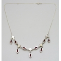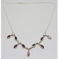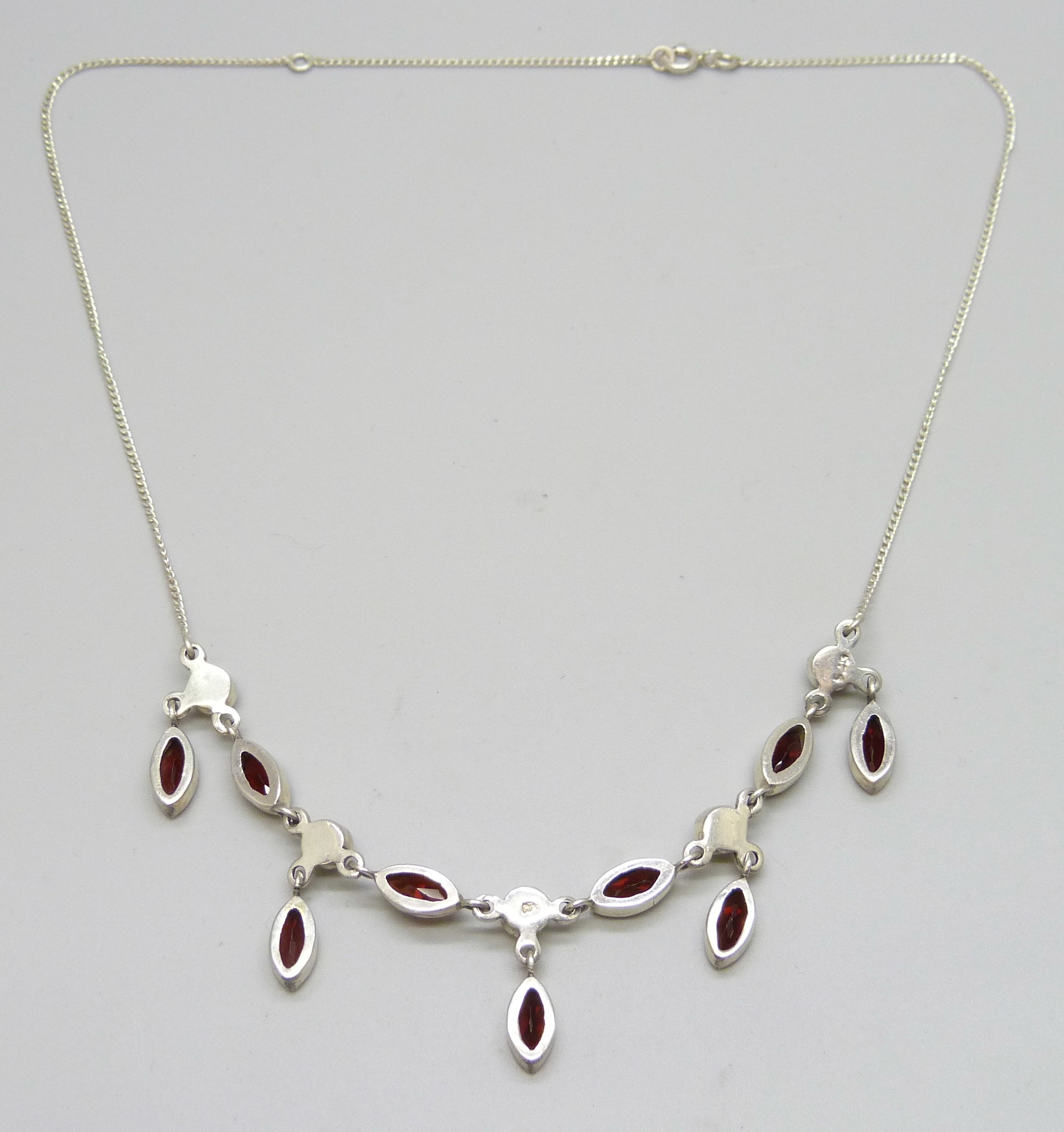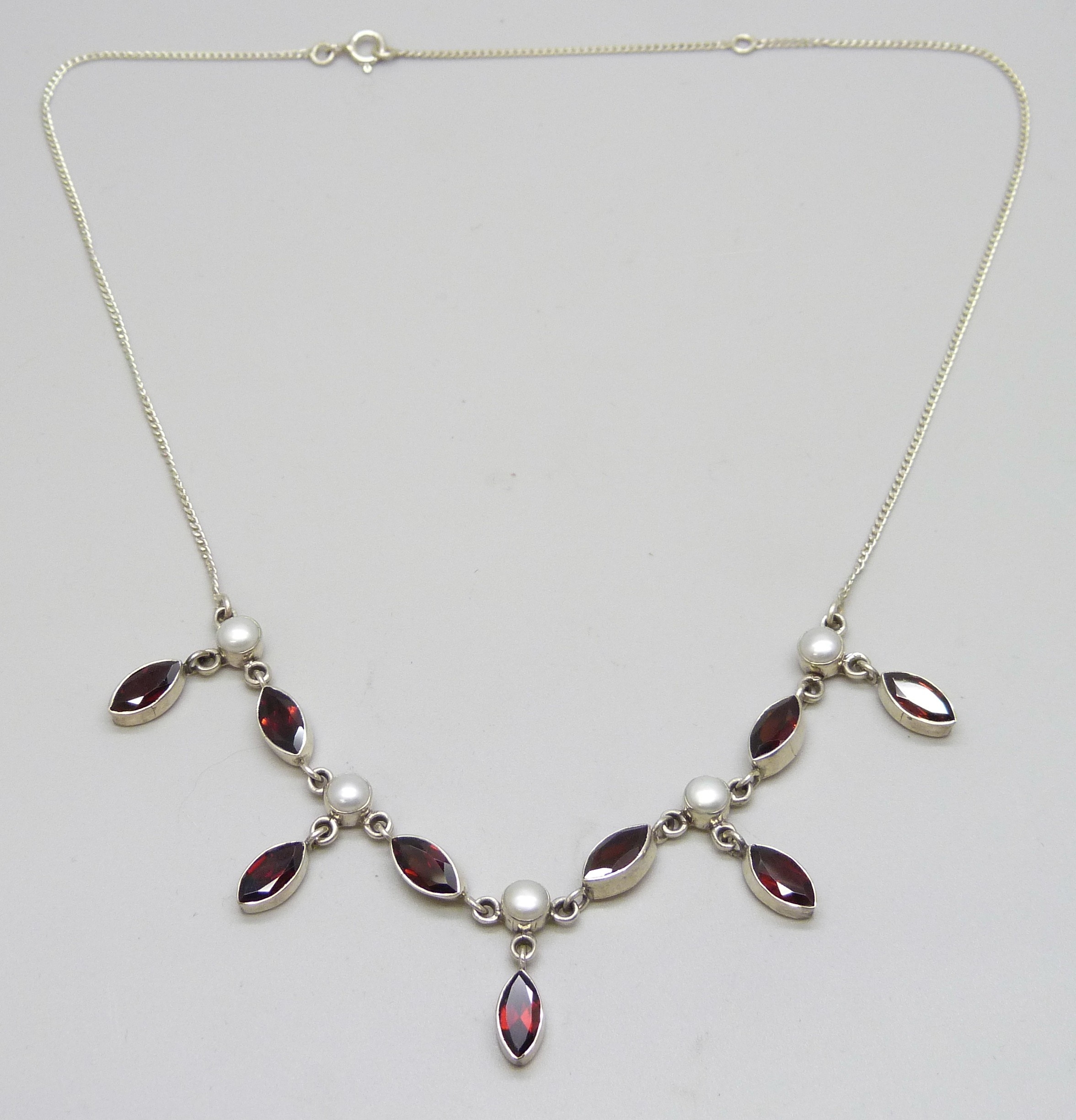 A silver, garnet and pearl necklace, 45cm, 11g
