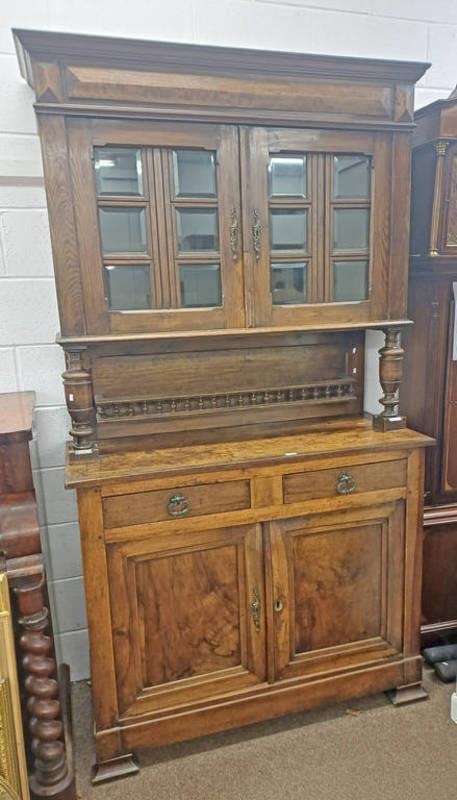 19TH CENTURY PINE & BEECH DRESSER WITH 2 GLAZED PANEL DOORS OVER BASE OF 2 DRAWERS OVER 2 PANEL DOORS - 220 CM TALL