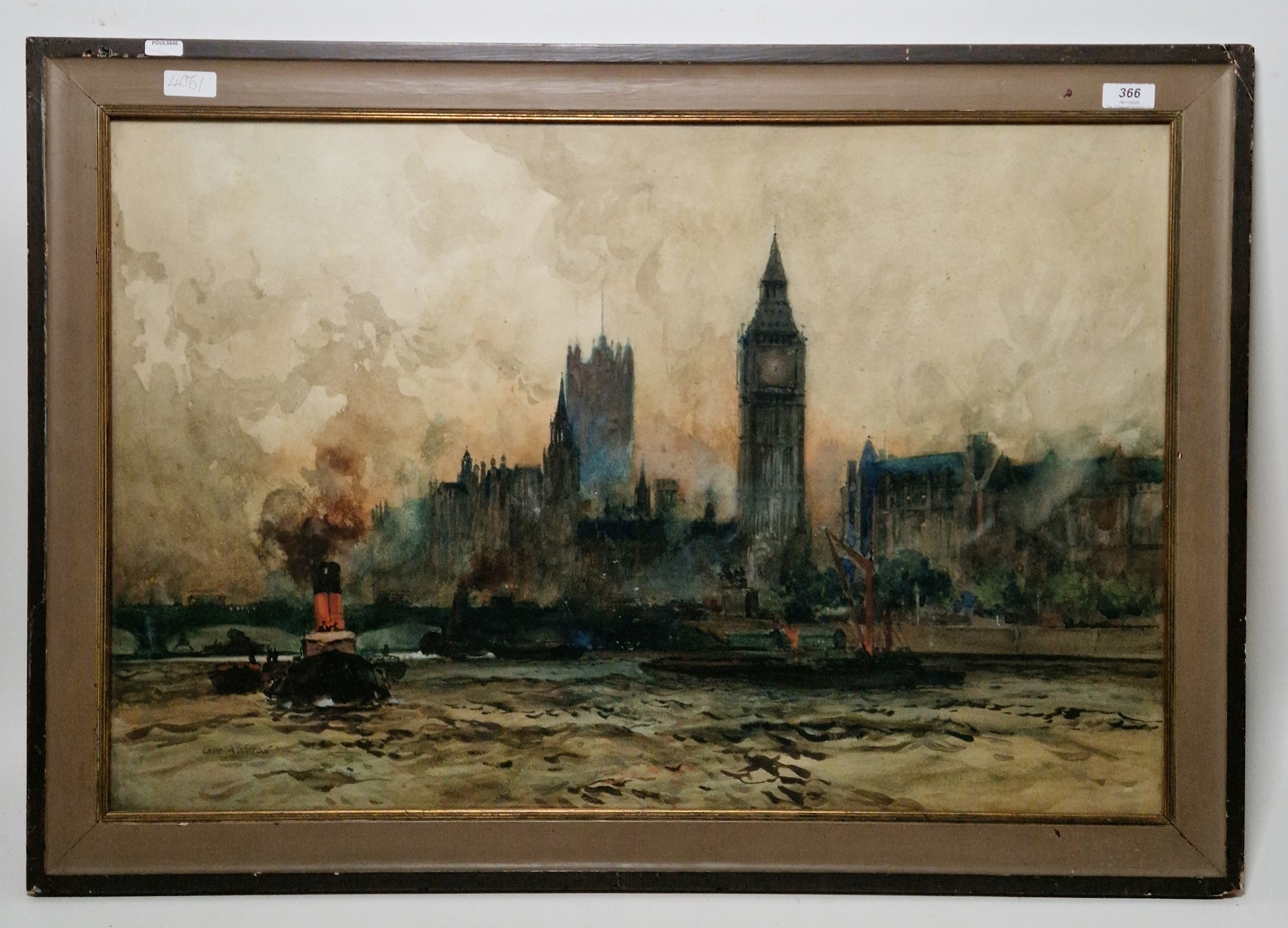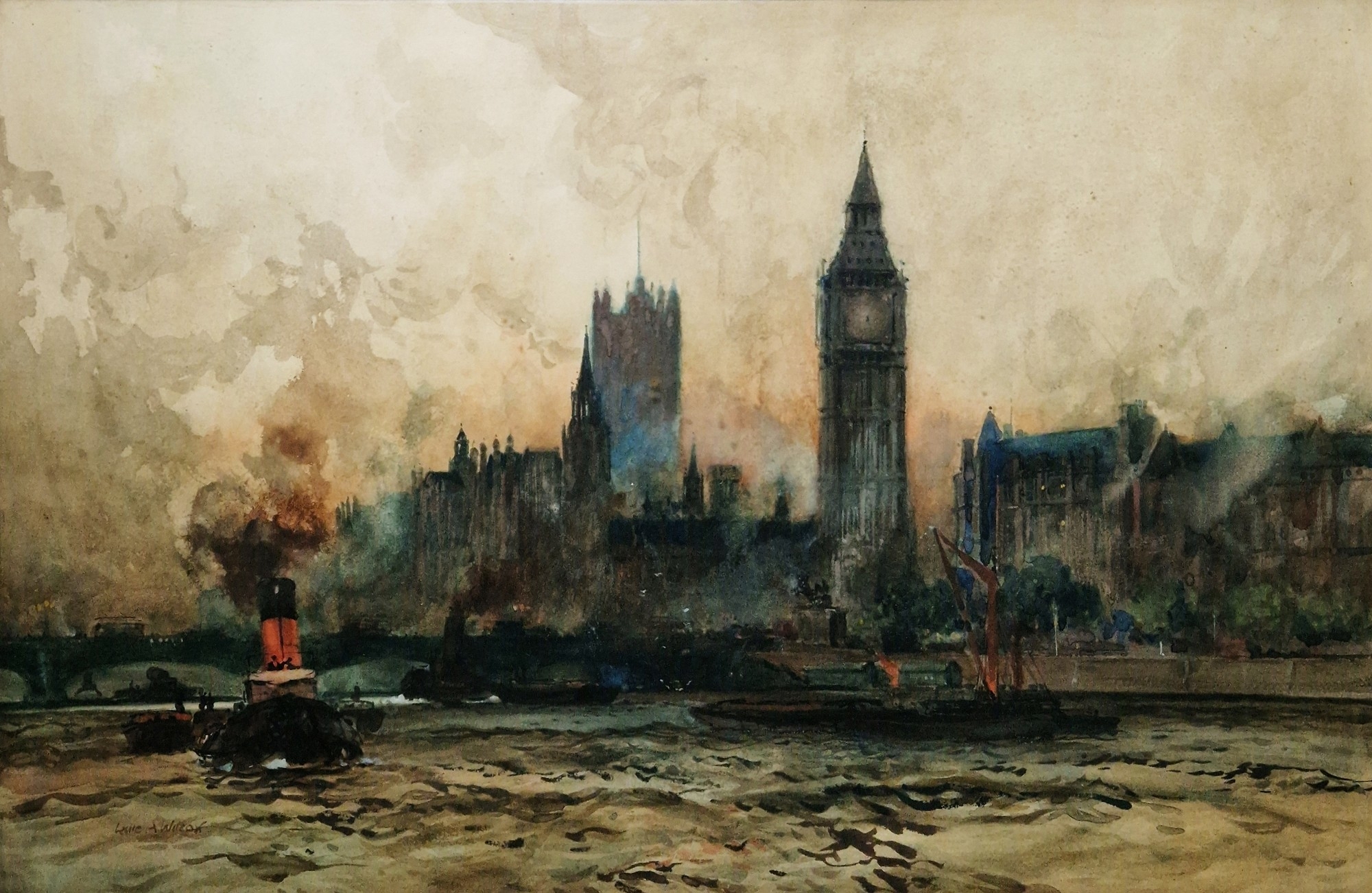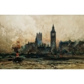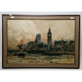 View of Houses of Parliament and Westminster Bridge, overlooking the Thames with steam tug and boats on river, signed lower left, framed and glazed, image size 48.5cm x 74cm