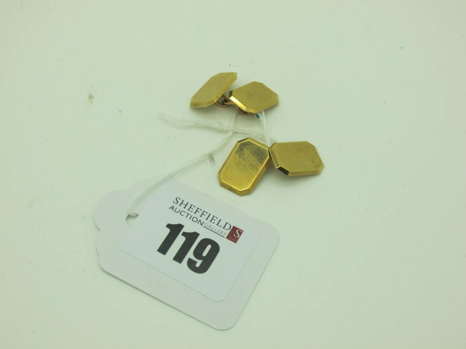 A Pair of 9ct Gold Cufflinks, the plain bevelled rectangular panels on chain connections (total weight 8.5grams).