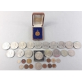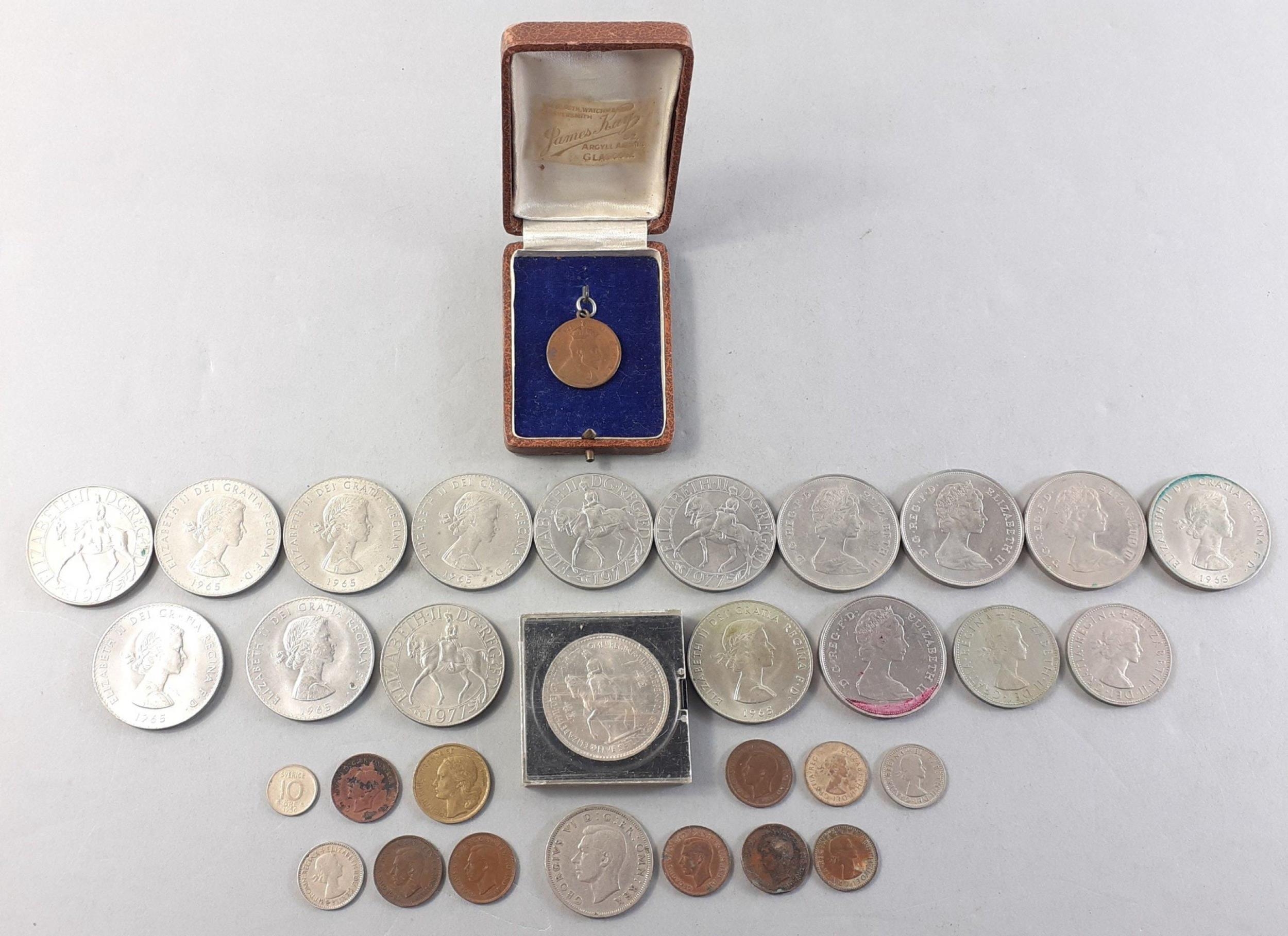 Small collection of coinage of interest to include several modern Crowns, 1902 Coronation medal, farthings etc.