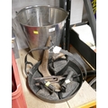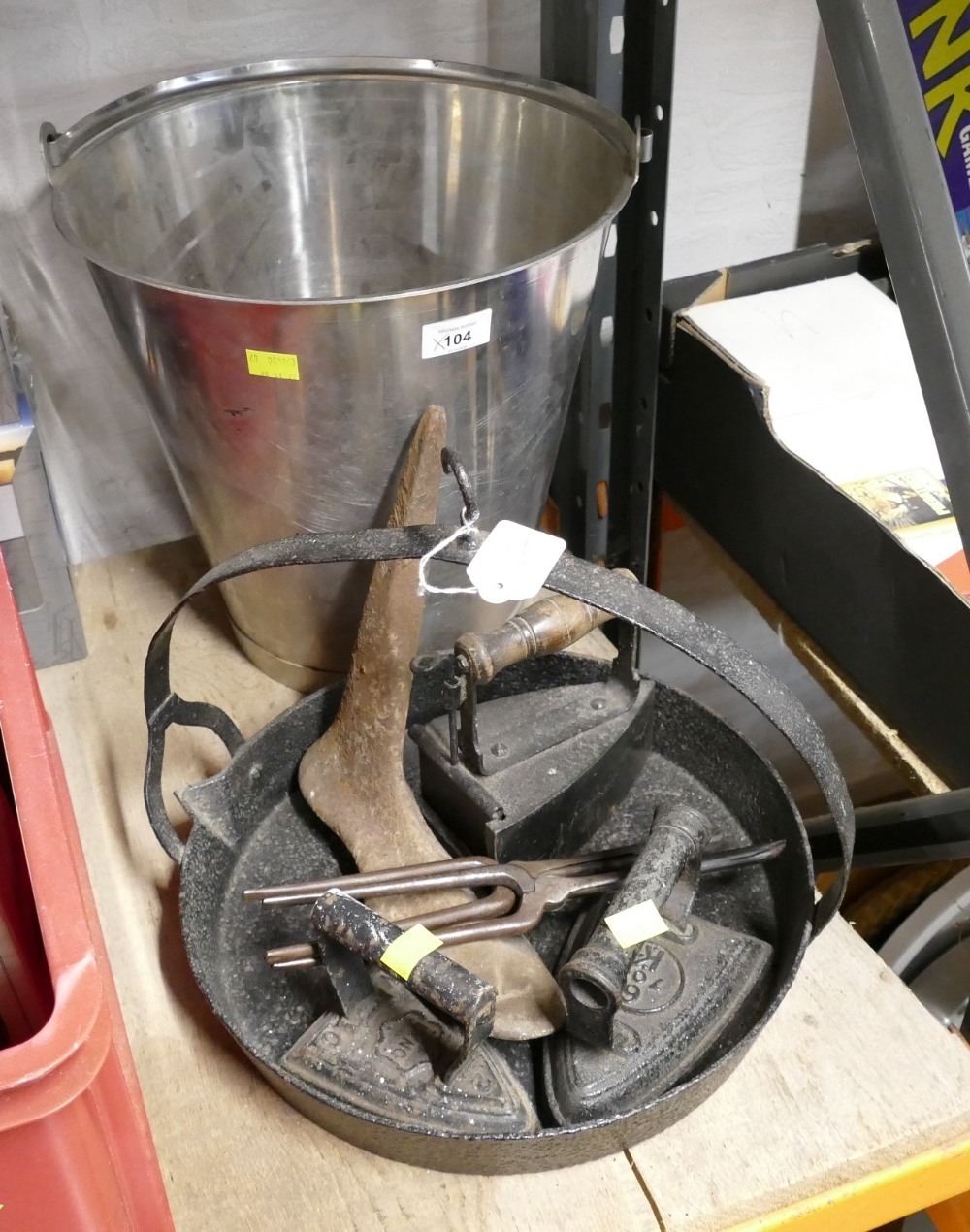 Stainless steel bucket, cast iron pan, shoe last, metalware