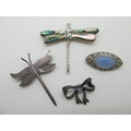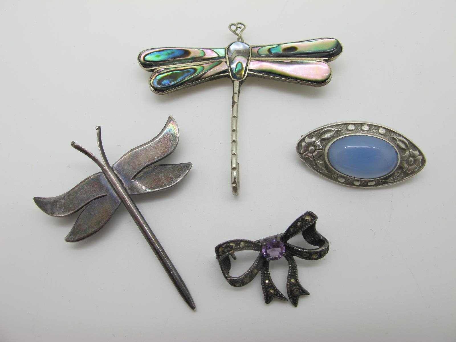 Alpaca Mexico Shell Inset Dragonfly Brooch, together with a hallmarked silver dragonfly brooch, an Arts & Crafts oval brooch, marcasite set bow brooch. (4)