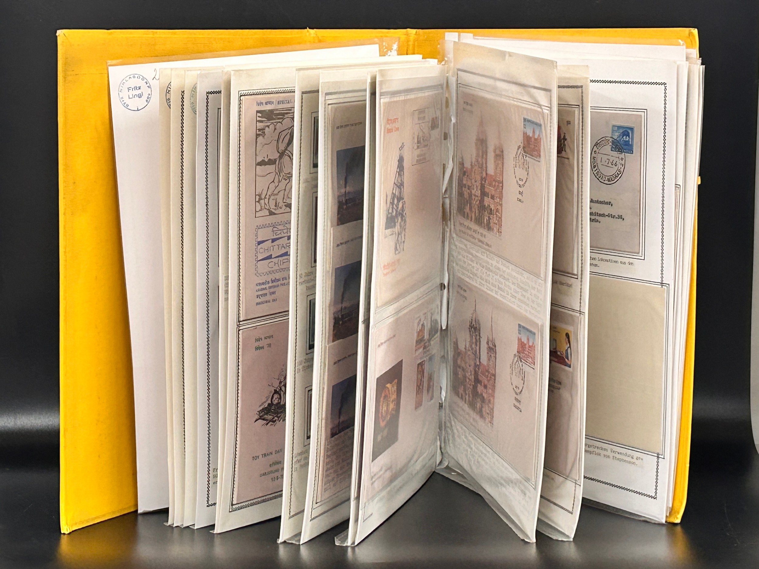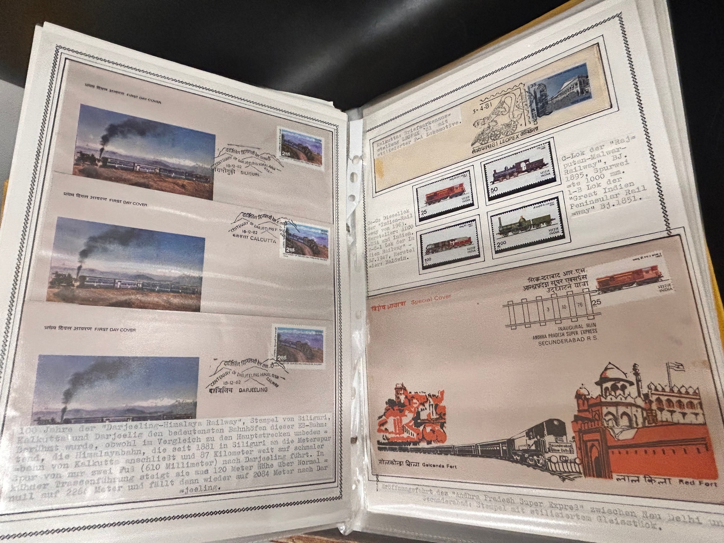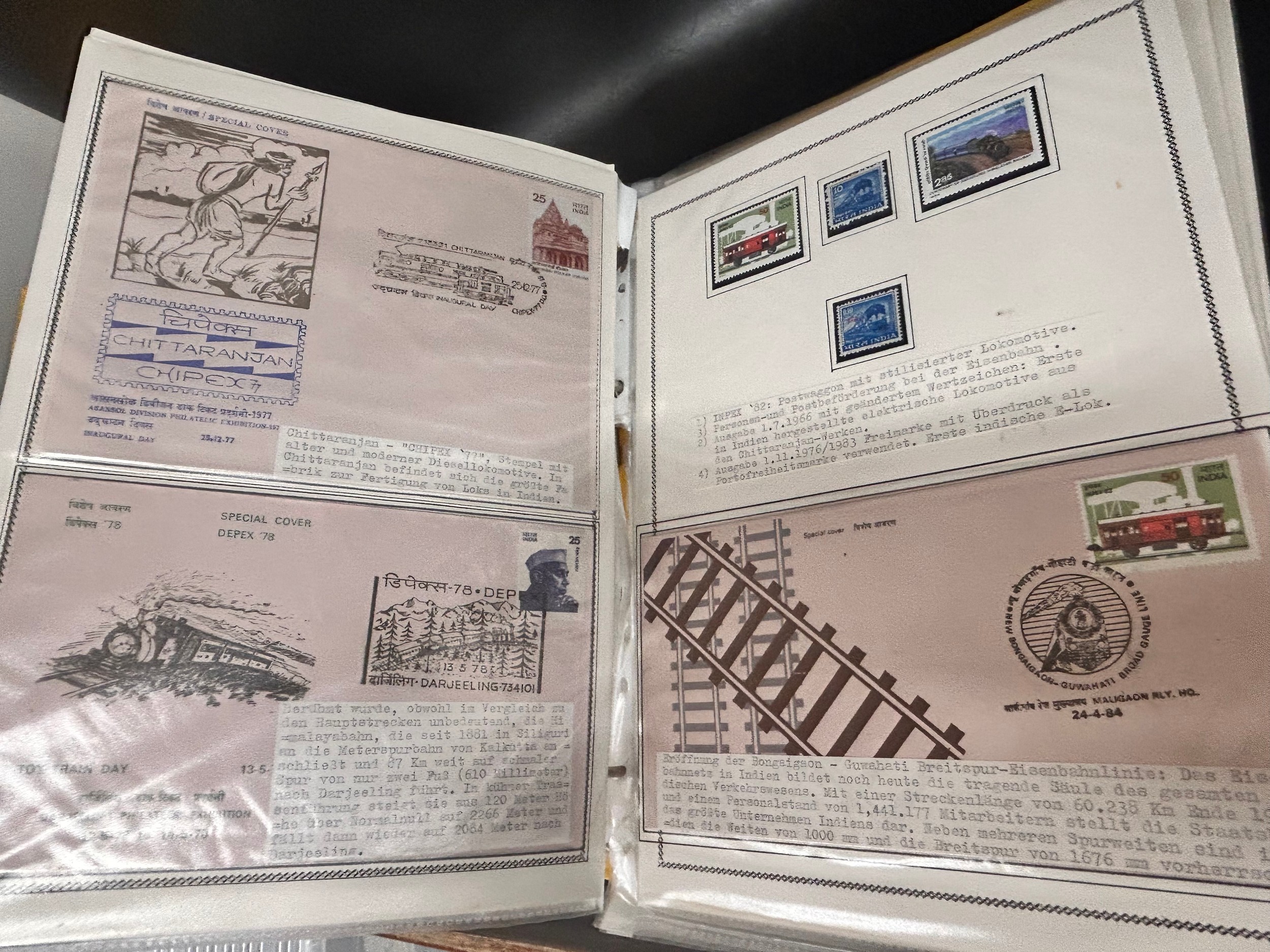 Stamps; India and area stamps in large binder housing a range of covers and stamps all with a thematic 'Train' theme, many first day covers along with commercial mail by rail, mainly 1940s to 1990s