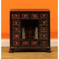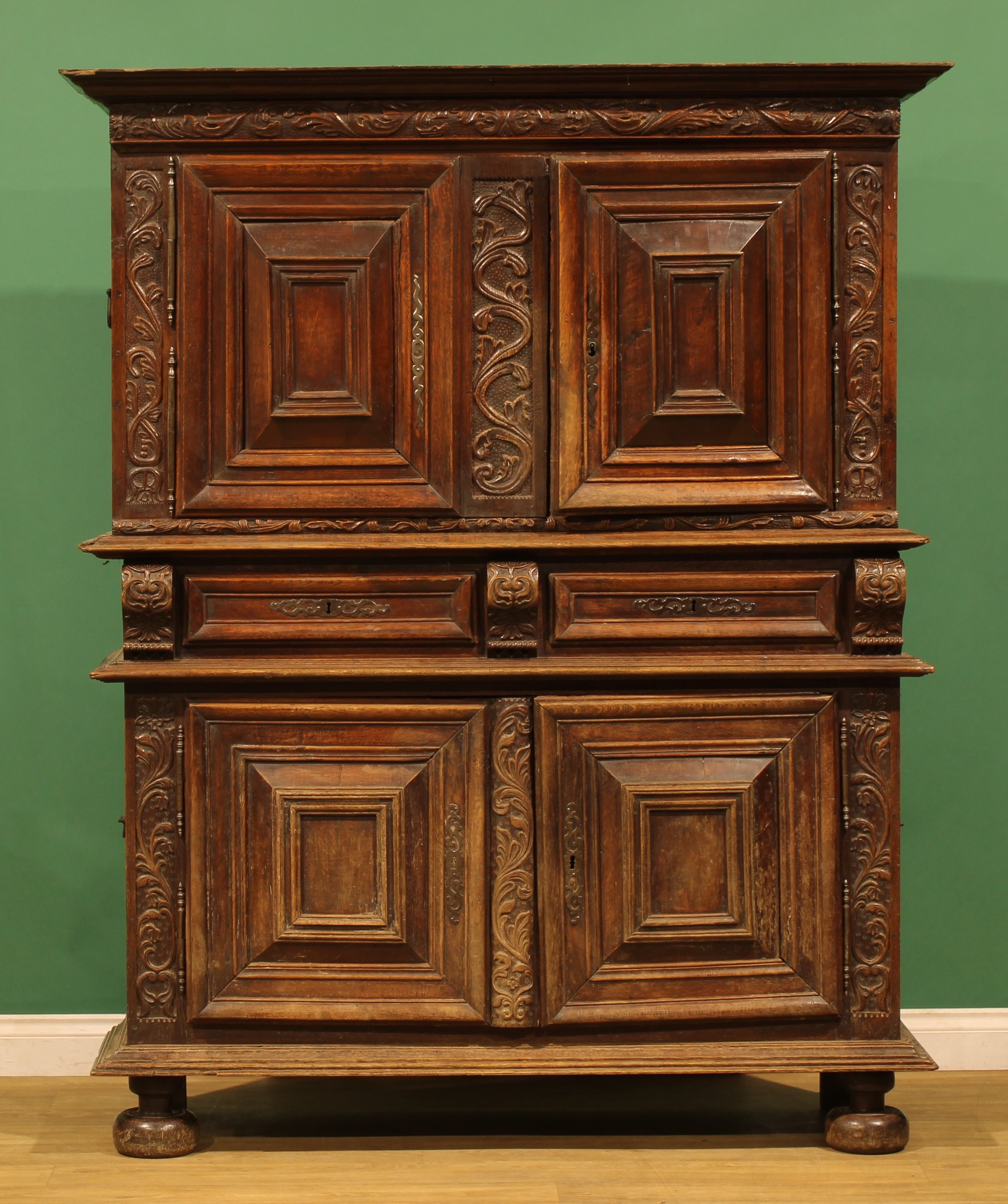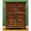 An 18th century French Provincial oak buffet, possibly Montbéliard, moulded cornice above two doors, the base with two drawers and two further doors, bun forefeet, 190cm high, 154cm wide, 50cm deep
