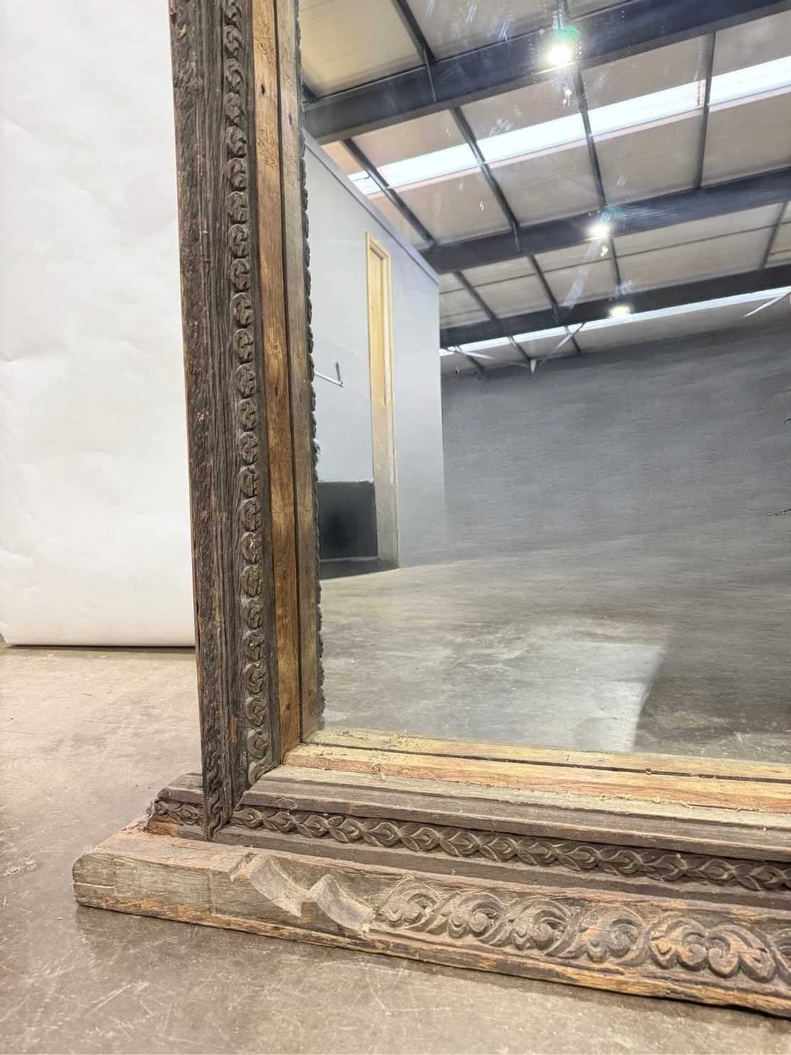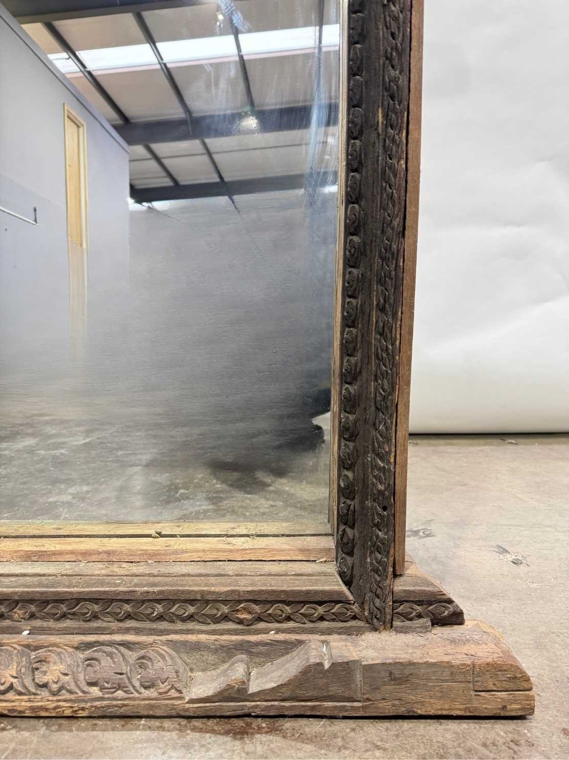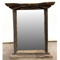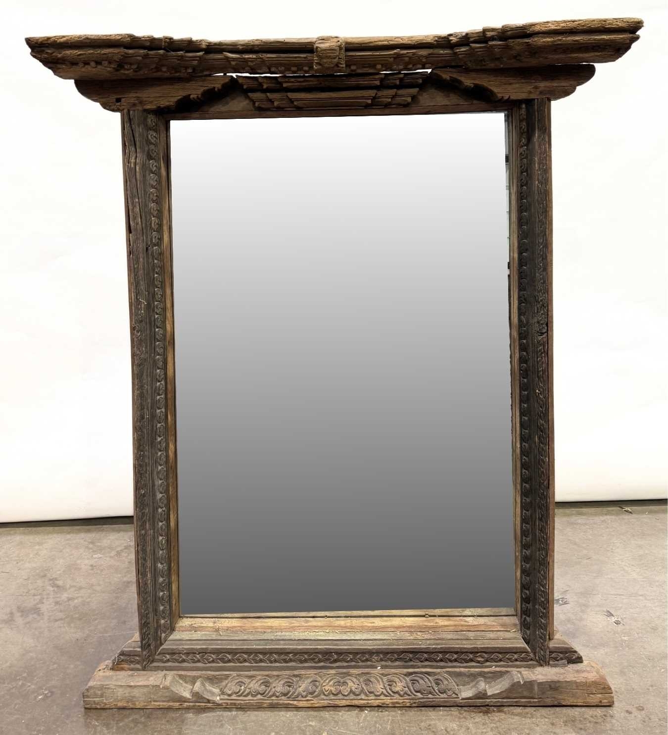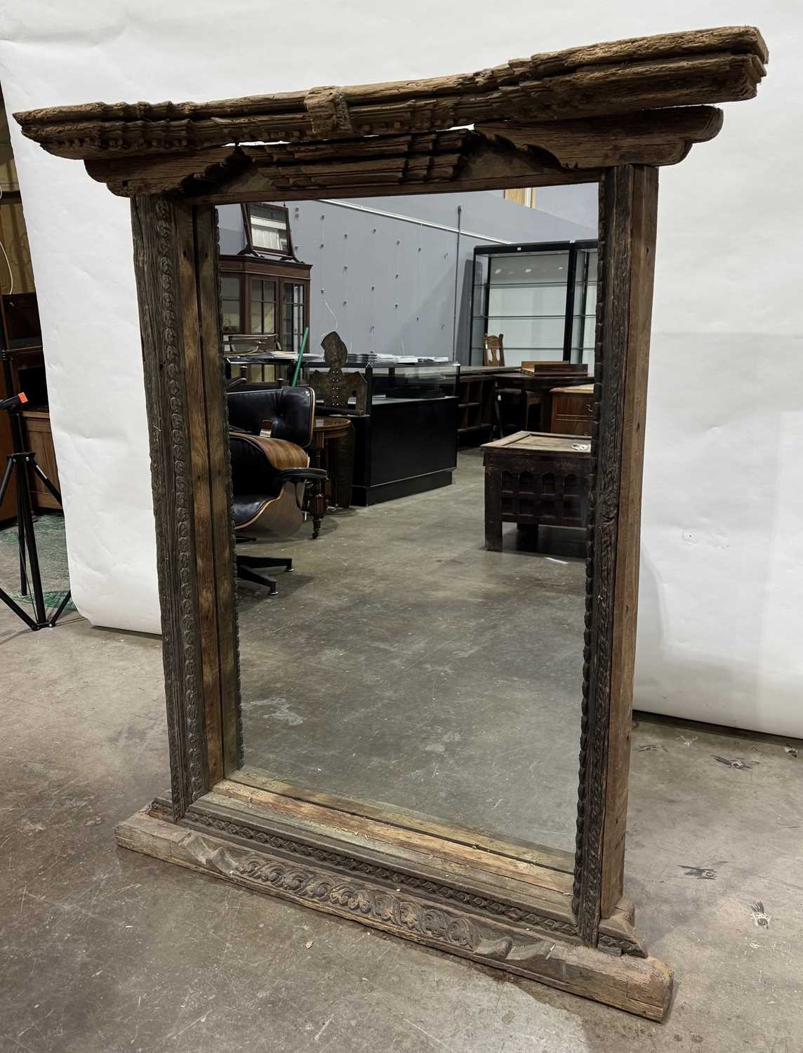 A Nepalese carved wooden window frame salvaged from a noble or royal palace, Kathmandu Valley, 17th century or earlier, later adapted as a mirror, stepped head with central weathered mask, the side and lower rails carved with undulating floriate designs, 142 by 124cm