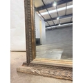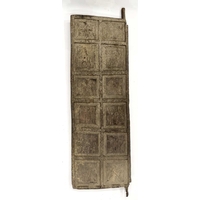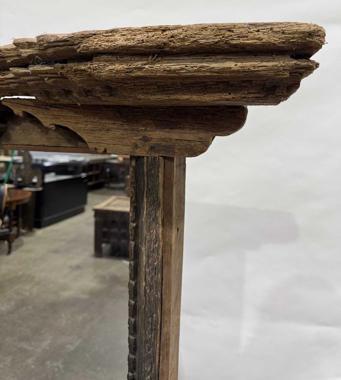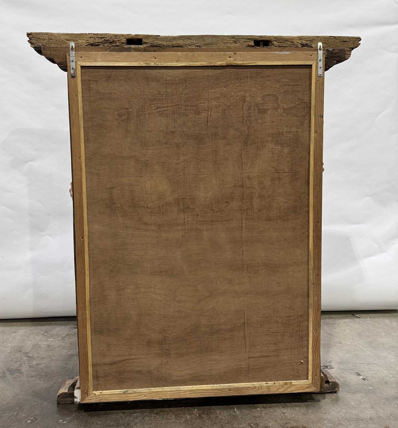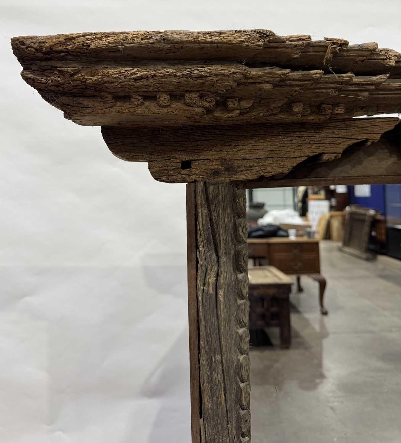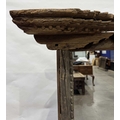 A Nepalese carved wooden window frame salvaged from a noble or royal palace, Kathmandu Valley, 17th century or earlier, later adapted as a mirror, stepped head with central weathered mask, the side and lower rails carved with undulating floriate designs, 142 by 124cm