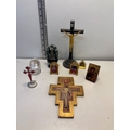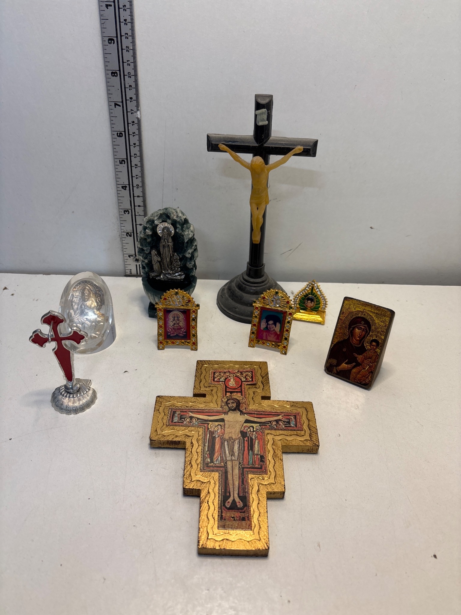 Religious icons including crosses and images with varied designs, sizes, and materials. Includes a crucifix, a wooden cross, and small framed icons.