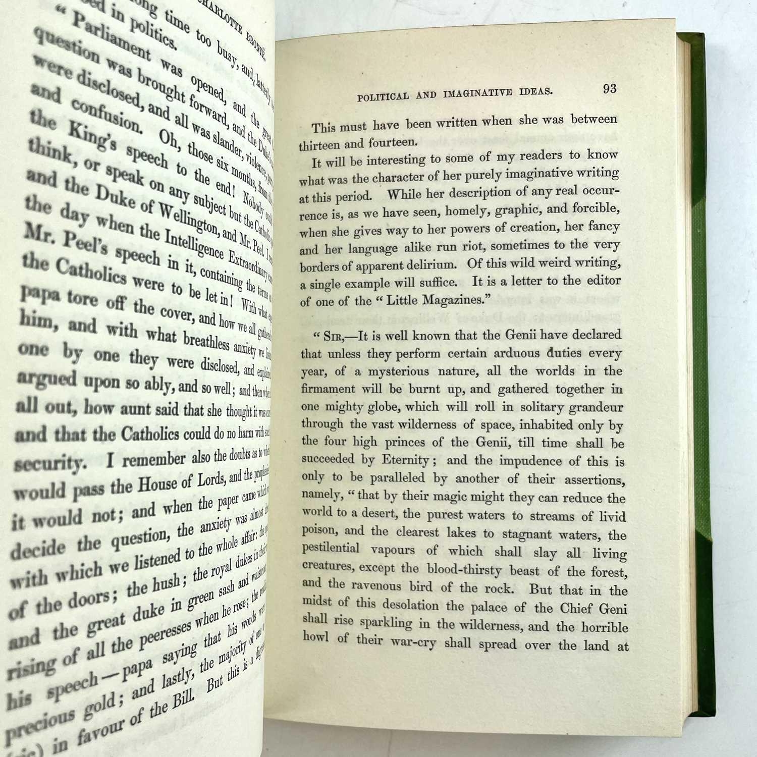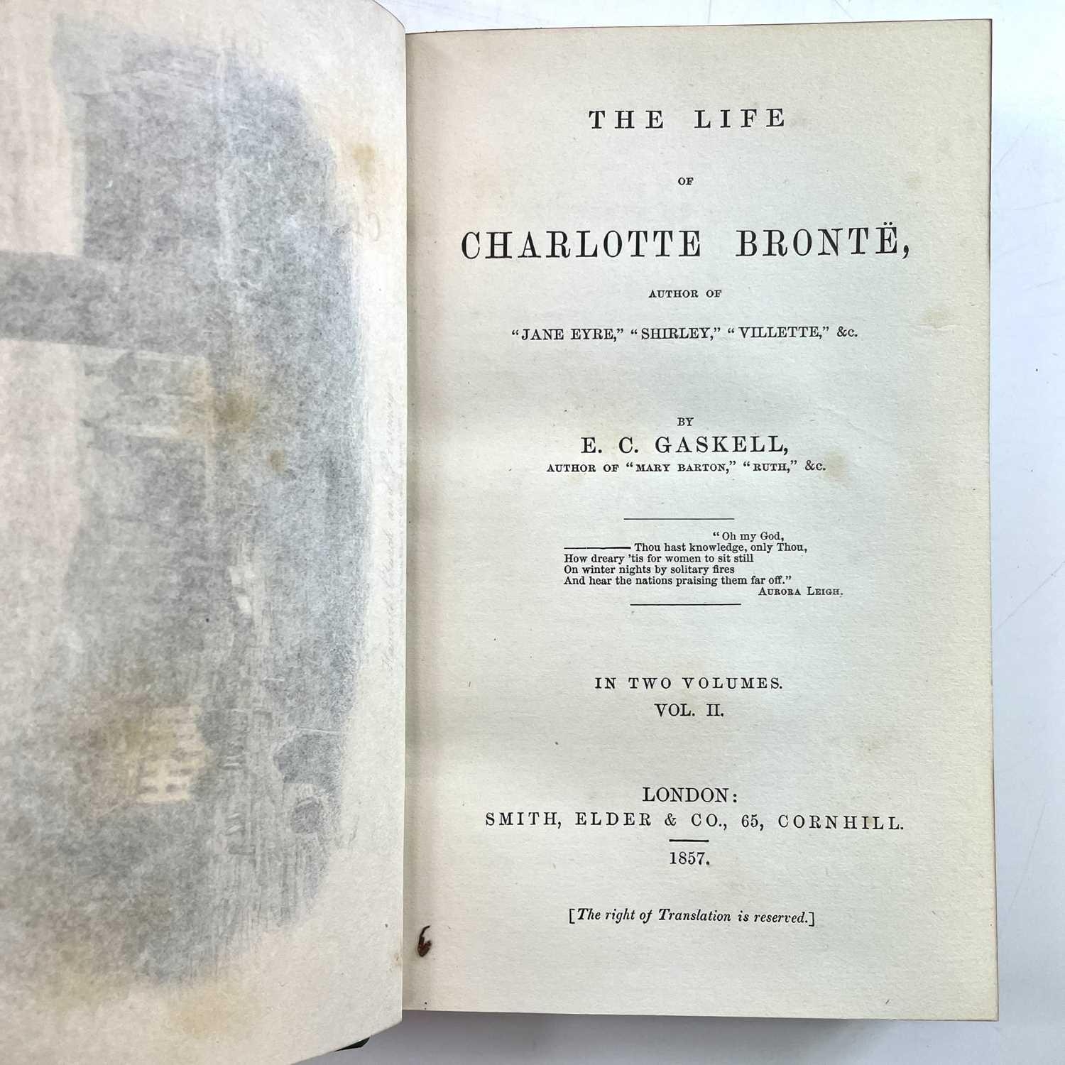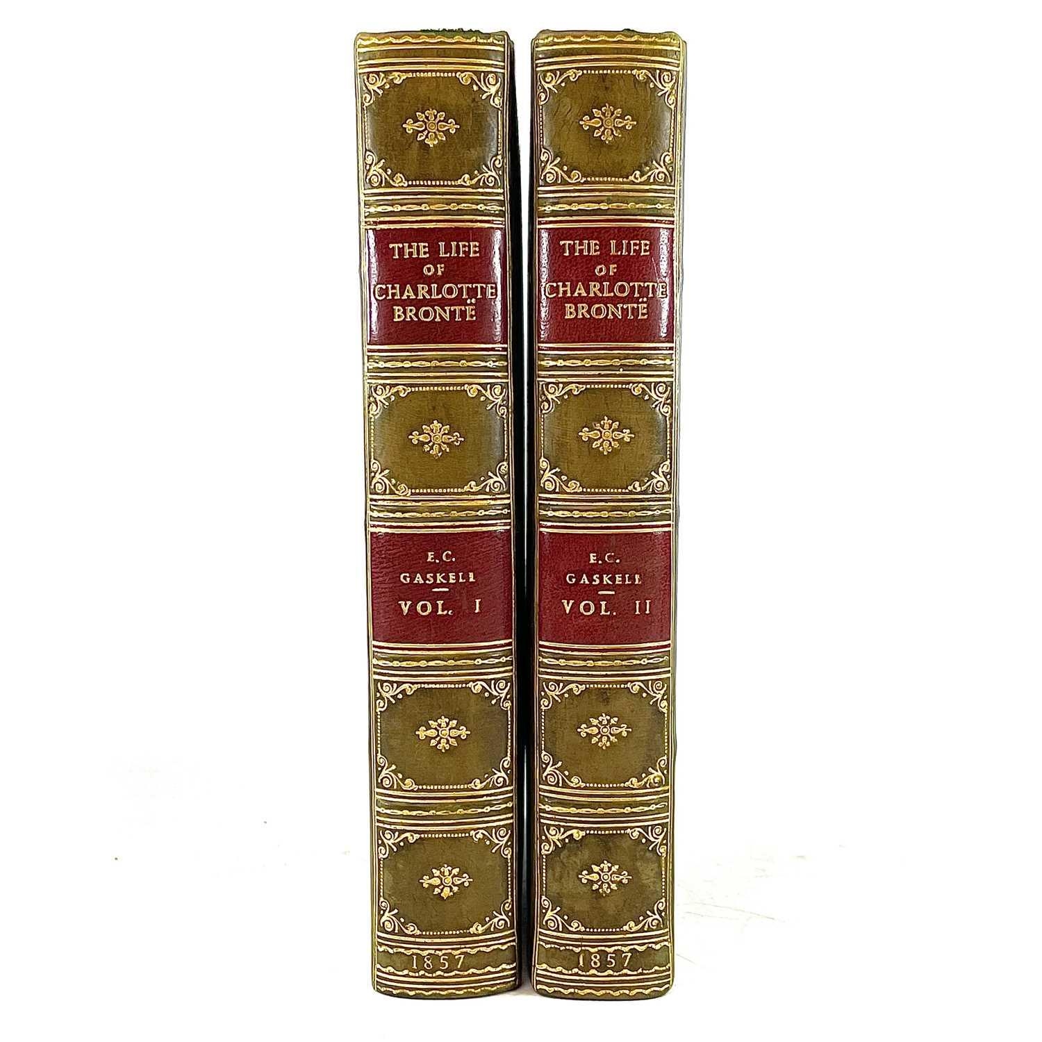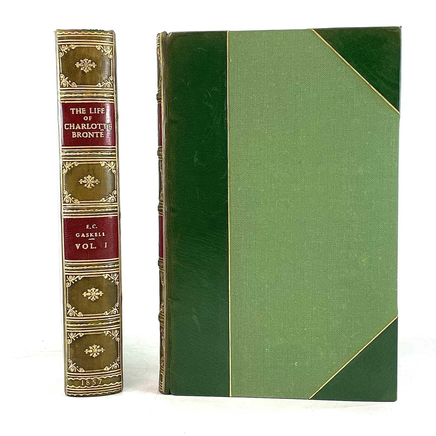 E. C. G. GASKELL. 'The Life of Charlotte Bronte,' first edition, two vols, half green leather with compartmentalized spines and red leather lables, ex libris plate to pastedown, engraved frontis, fine, Smith, Elder & Co, 1857. (2)