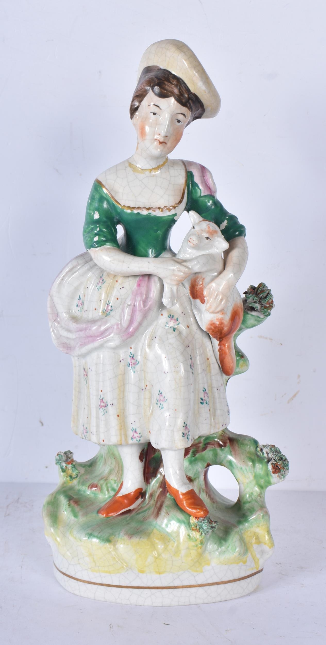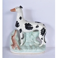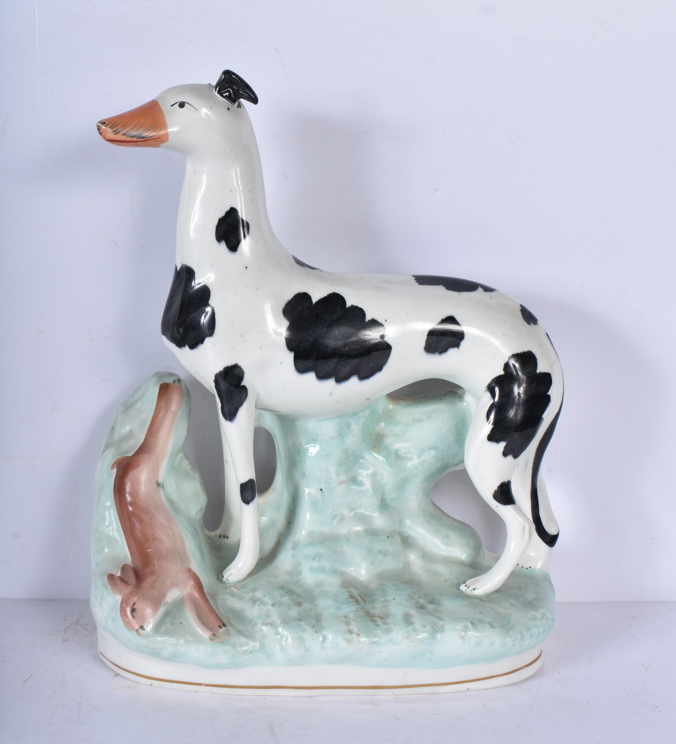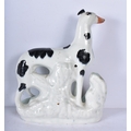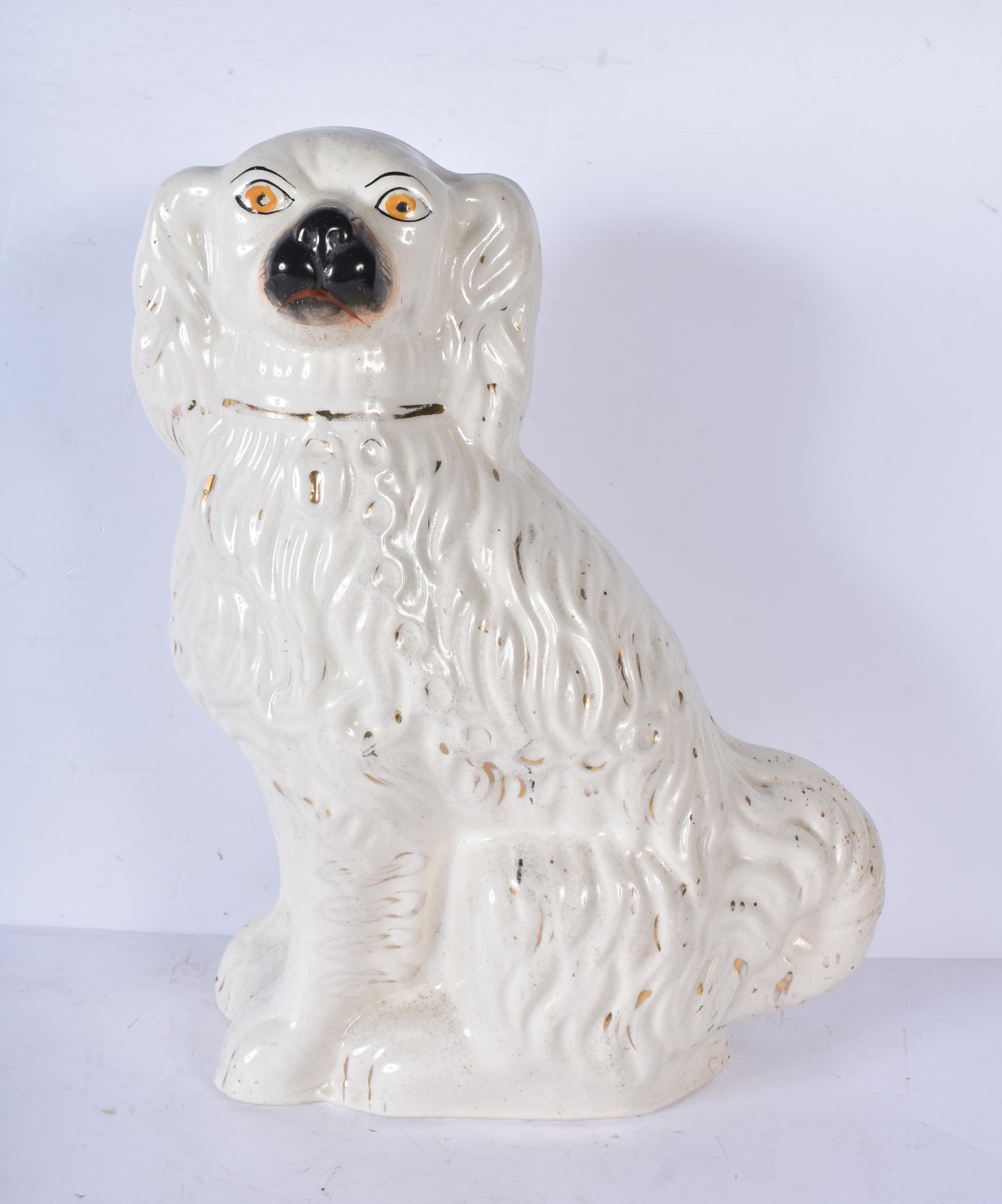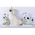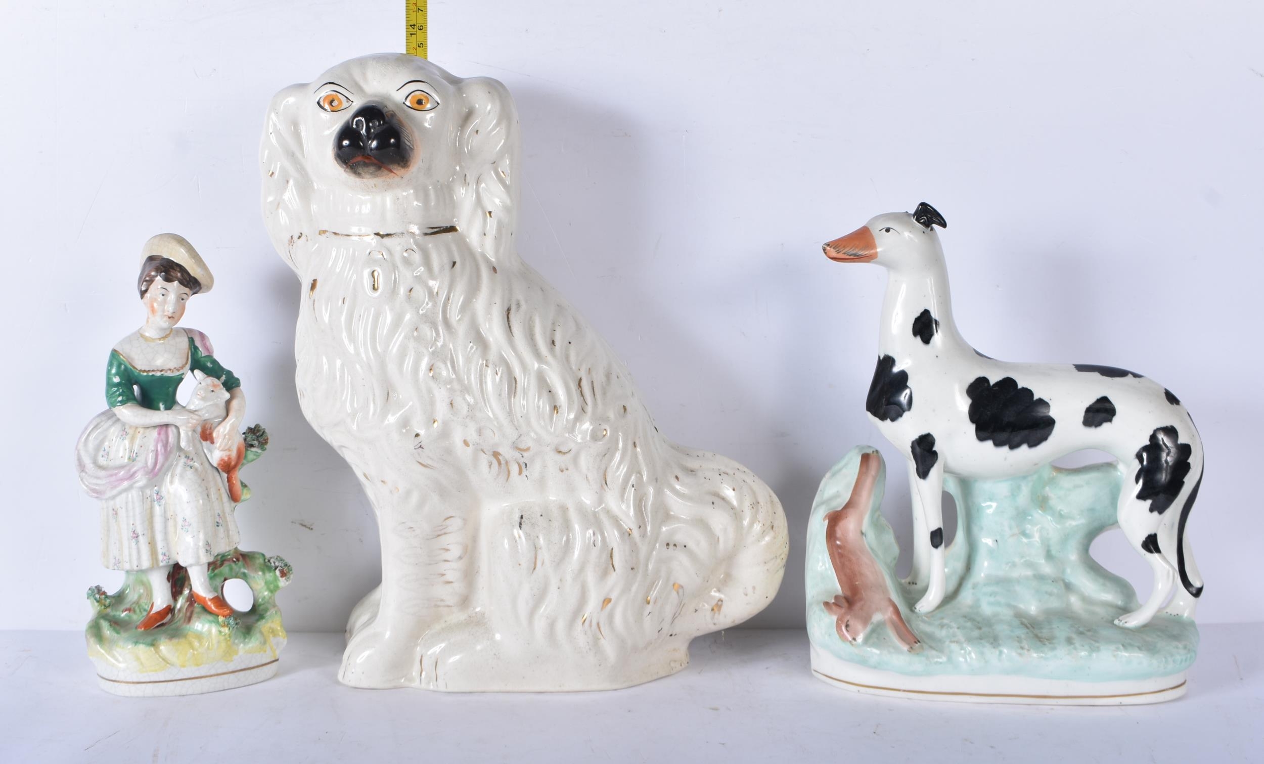 A large 19th Century Staffordshire porcelain Dog together with another dog and a shepherdess 35cm ,