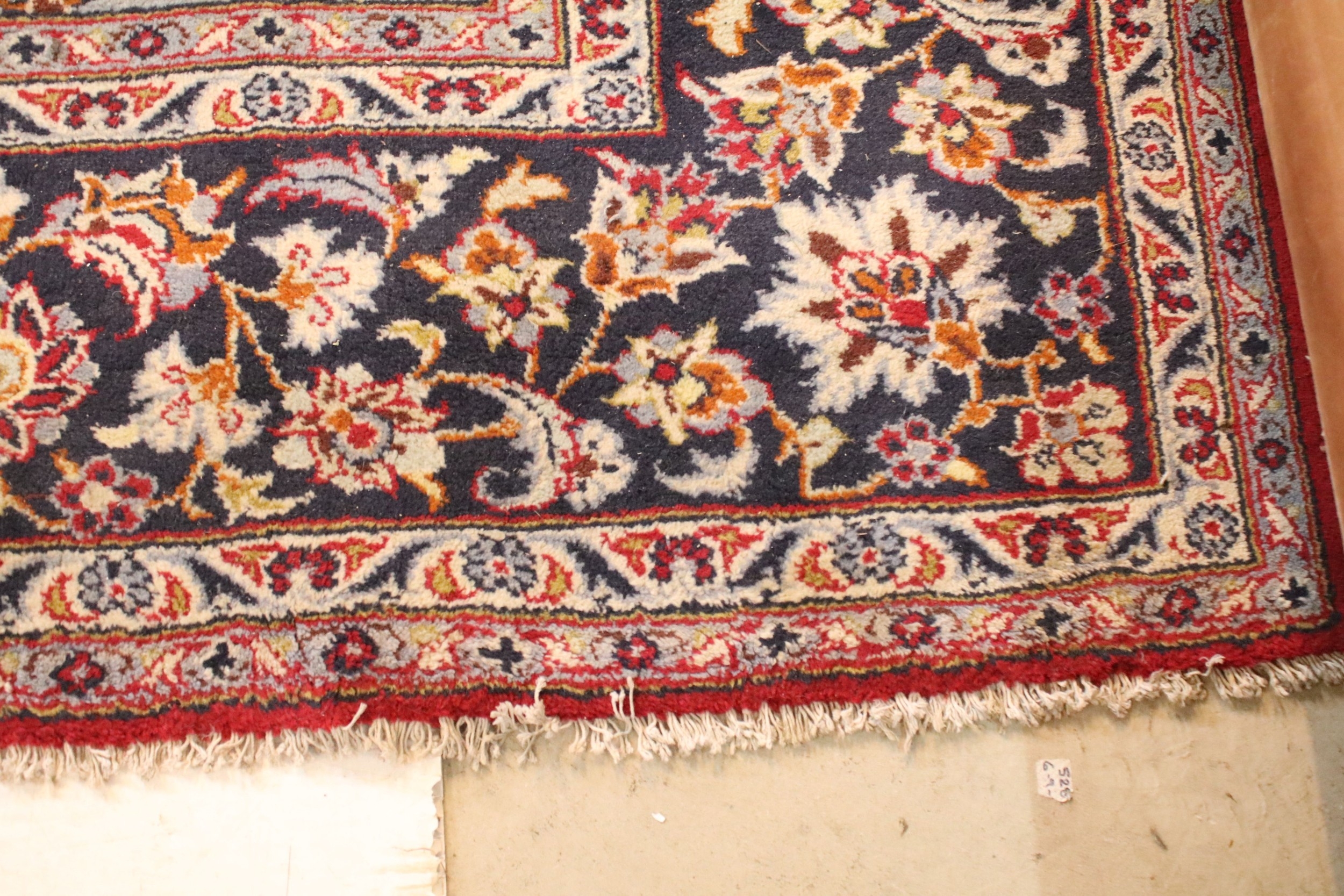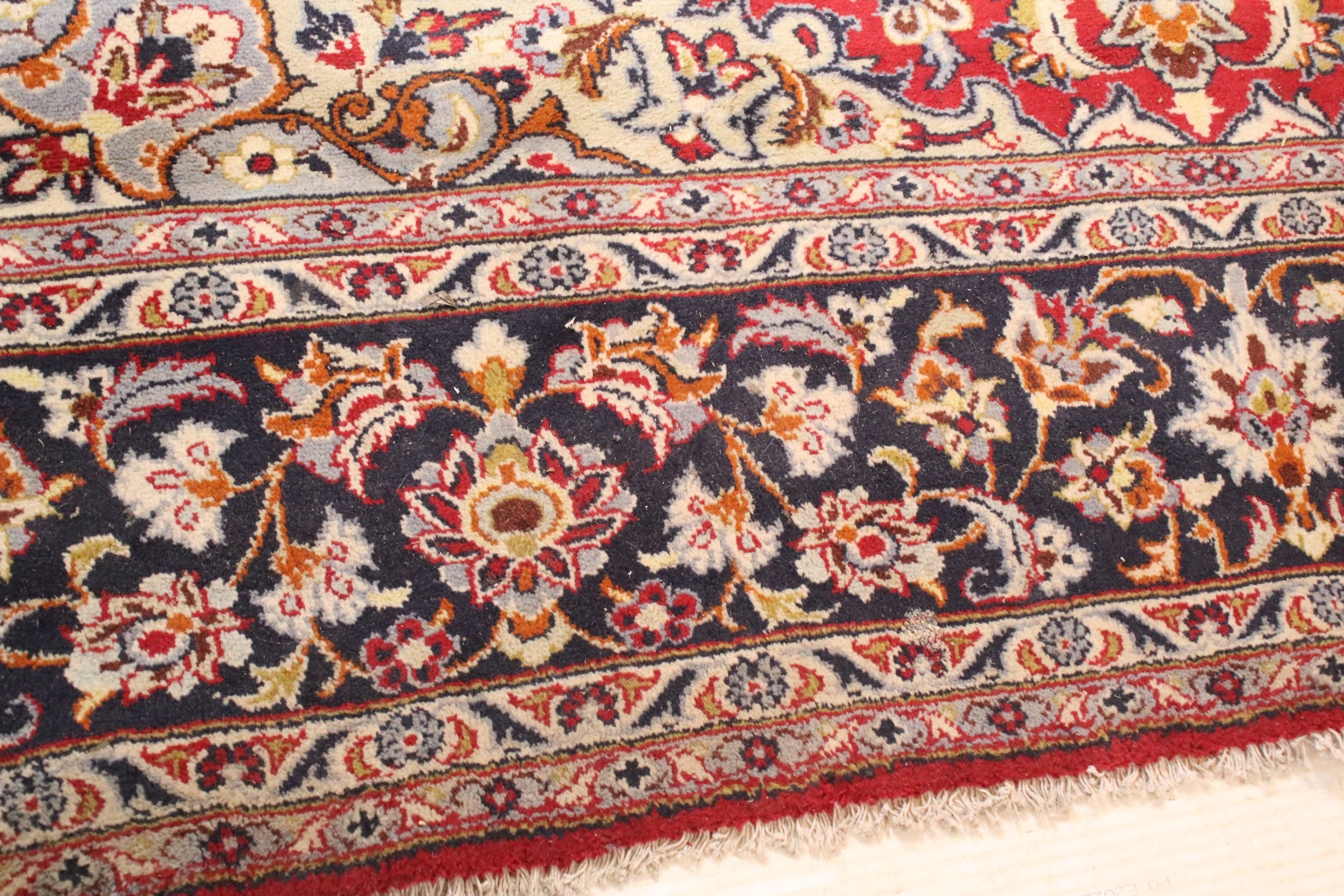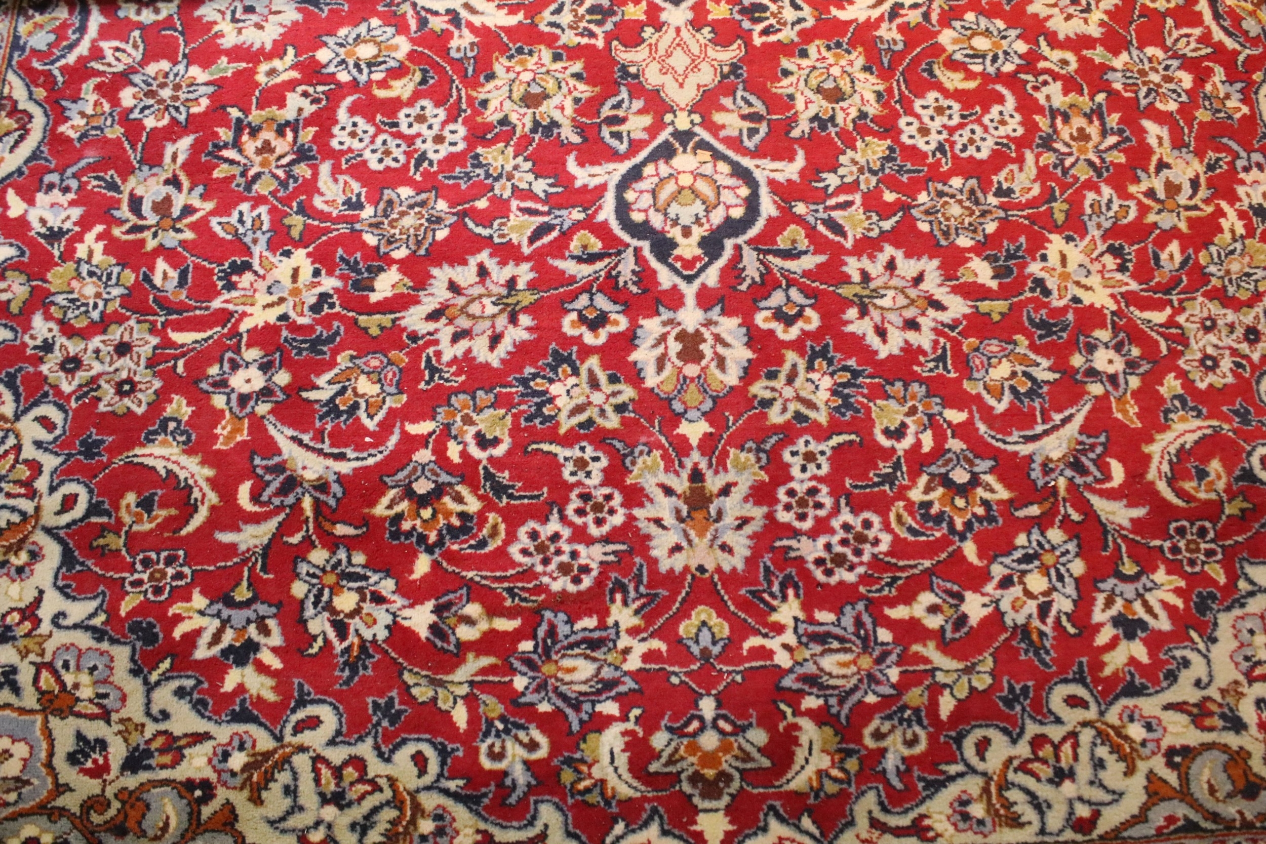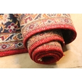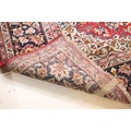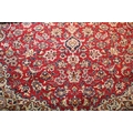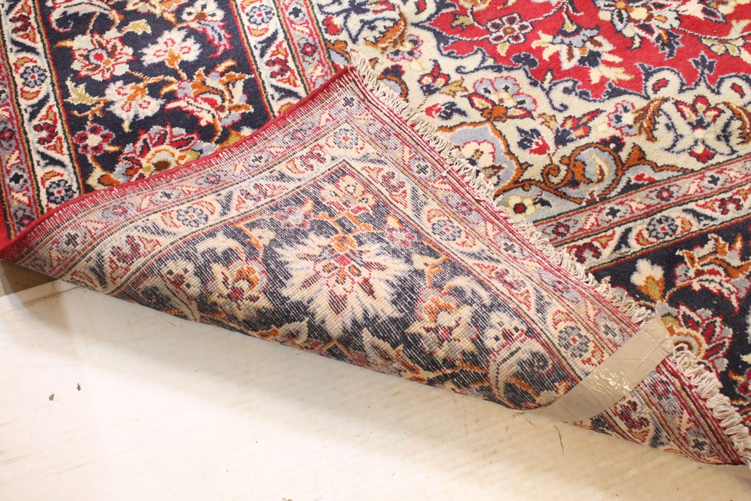 Persian Isfahan rug, of large proportions, of red ground with intertwining swags, within blue border, 395 x 292cm