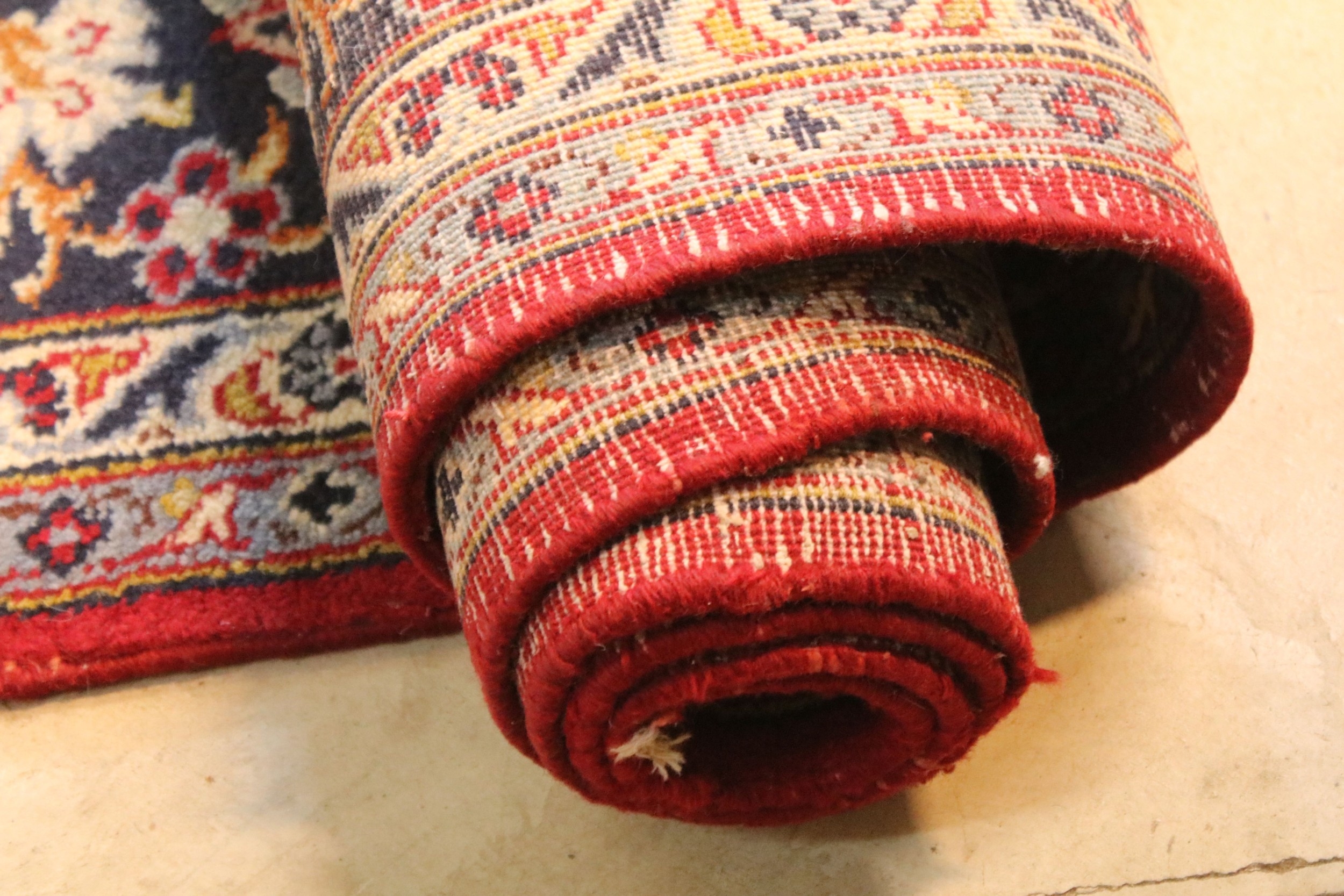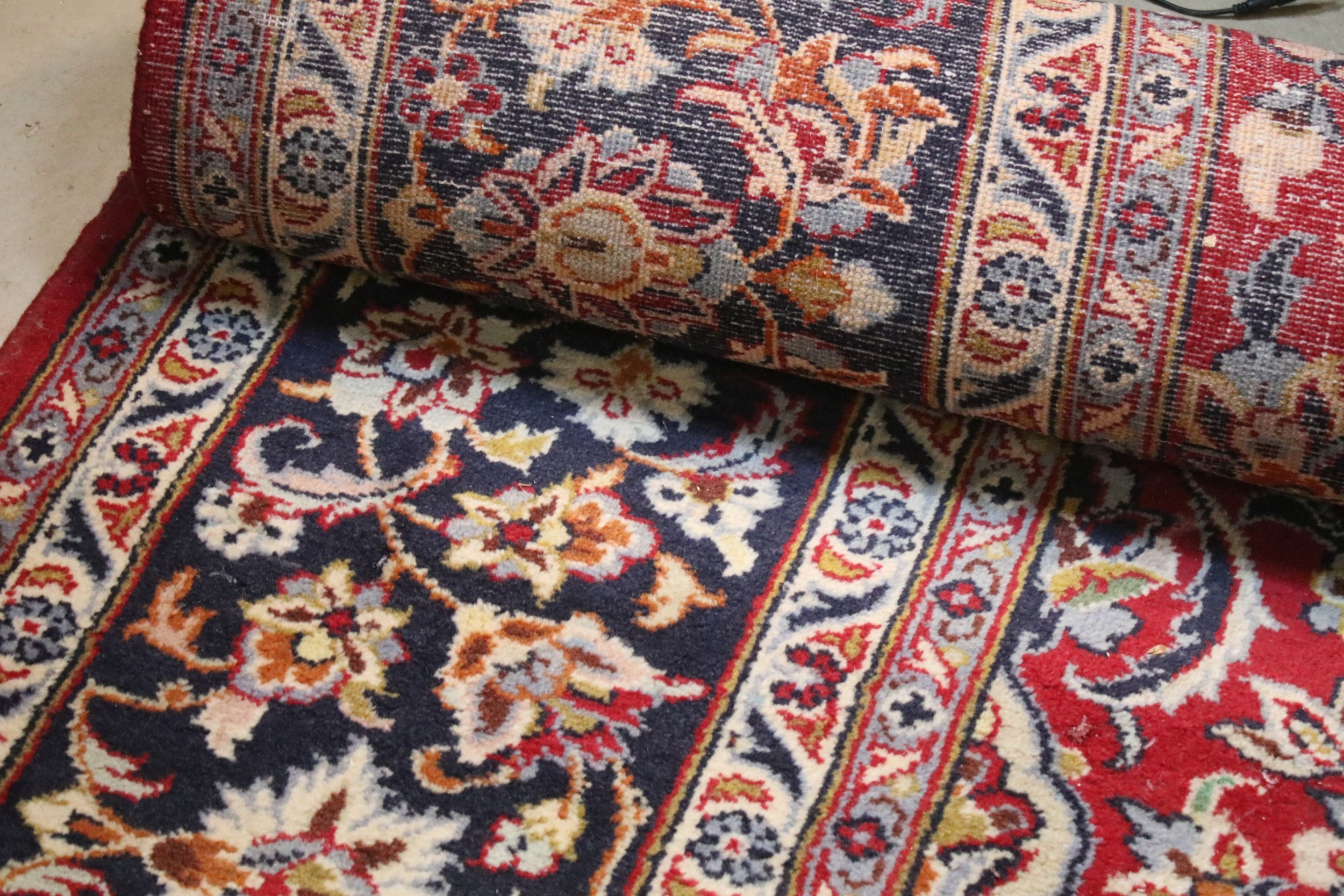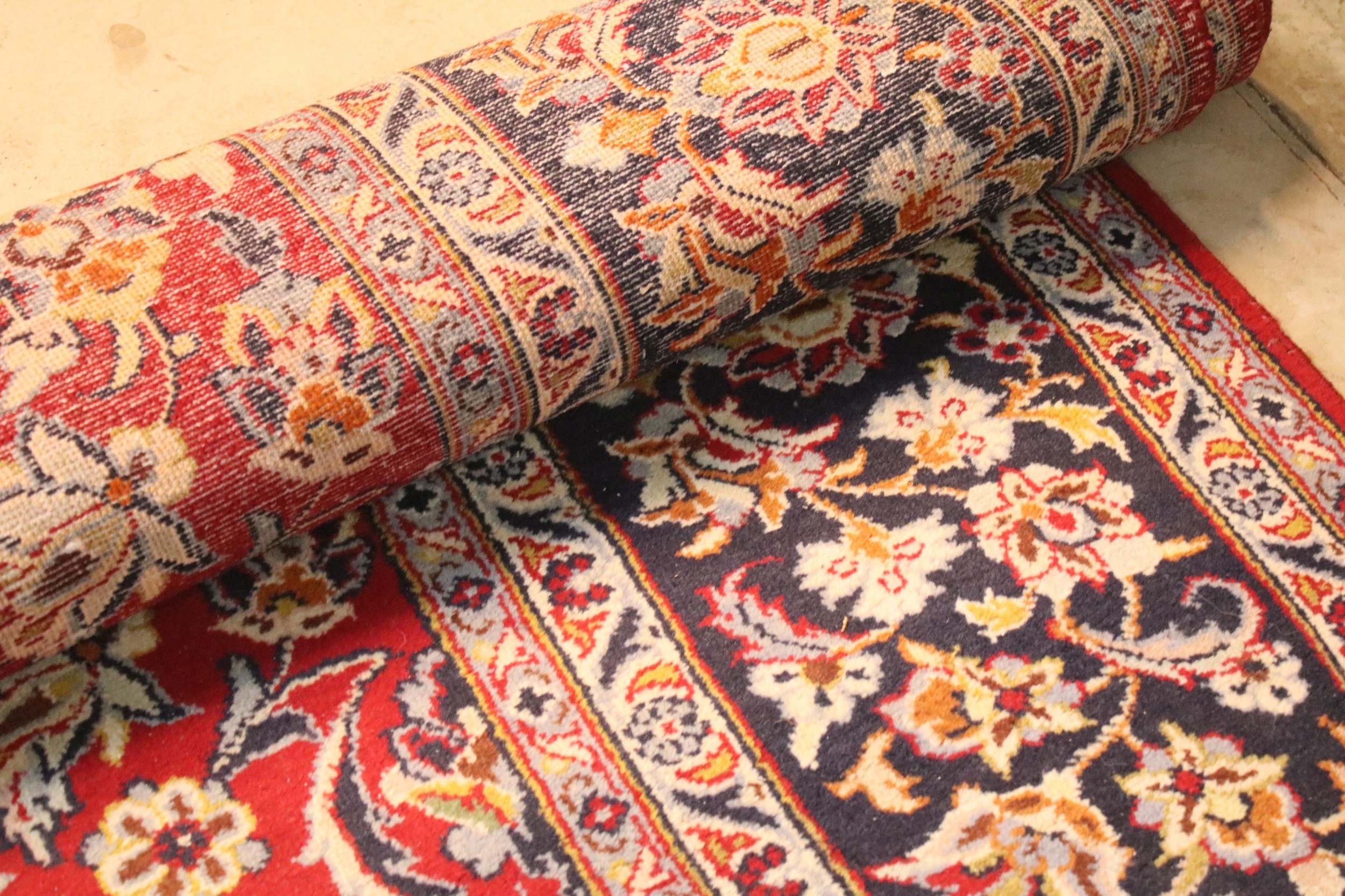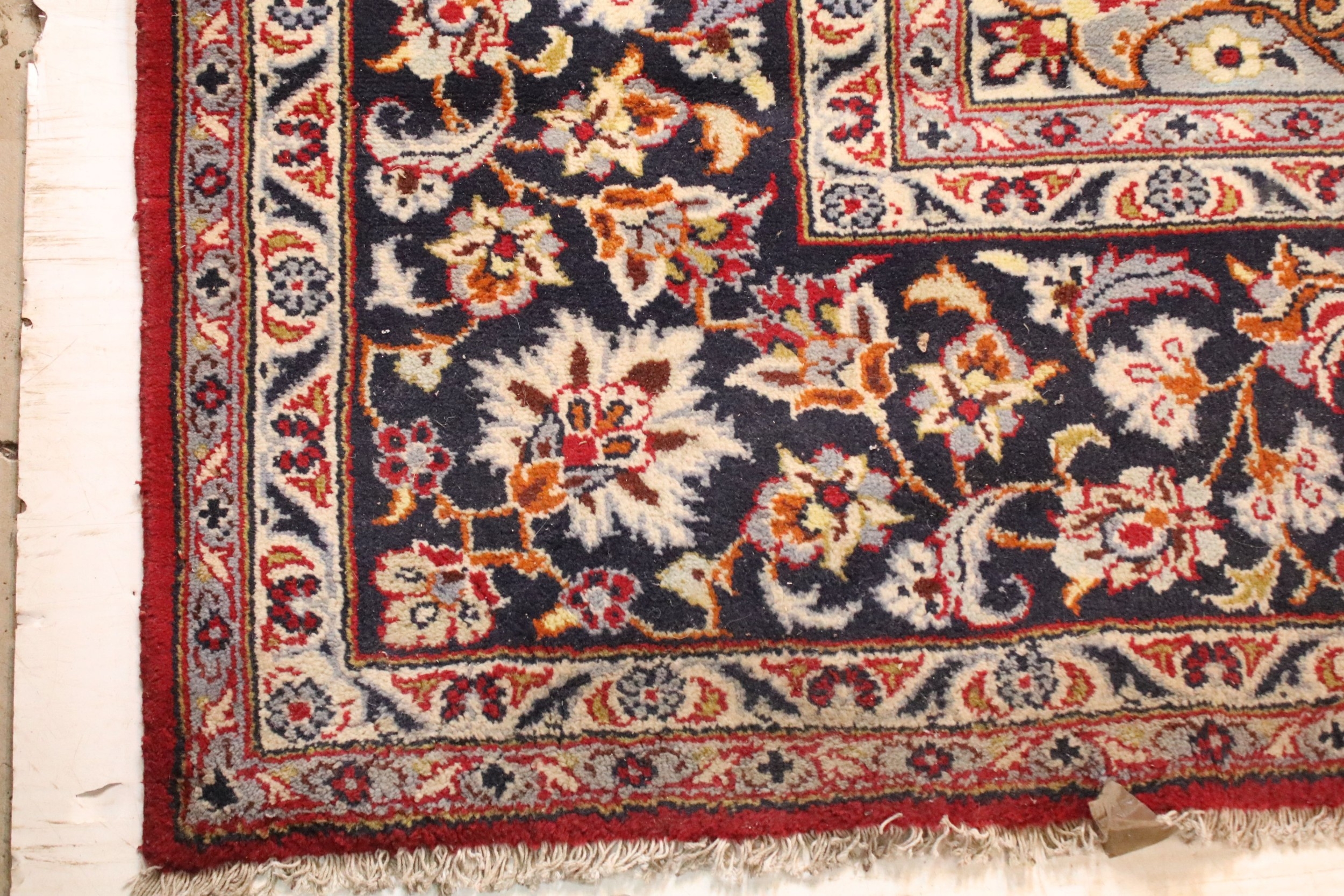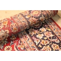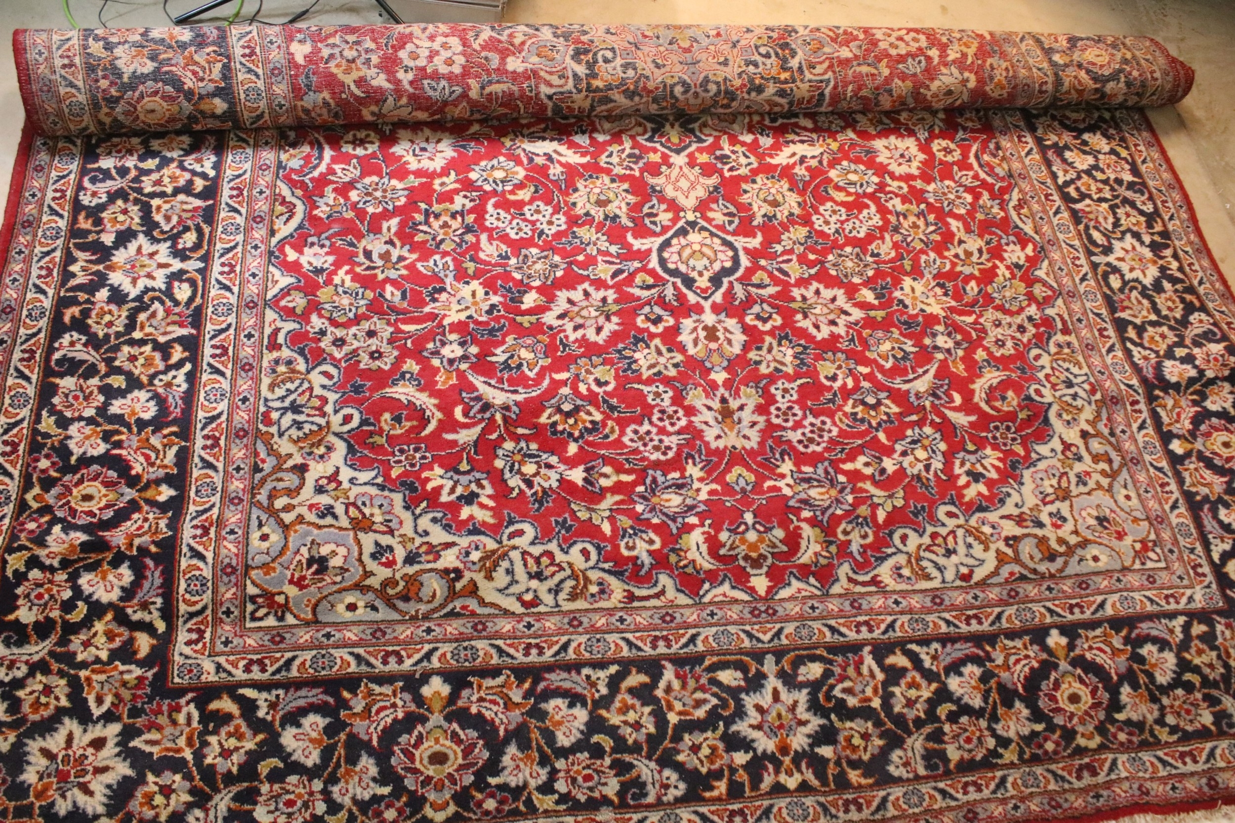Persian Isfahan rug, of large proportions, of red ground with intertwining swags, within blue border, 395 x 292cm