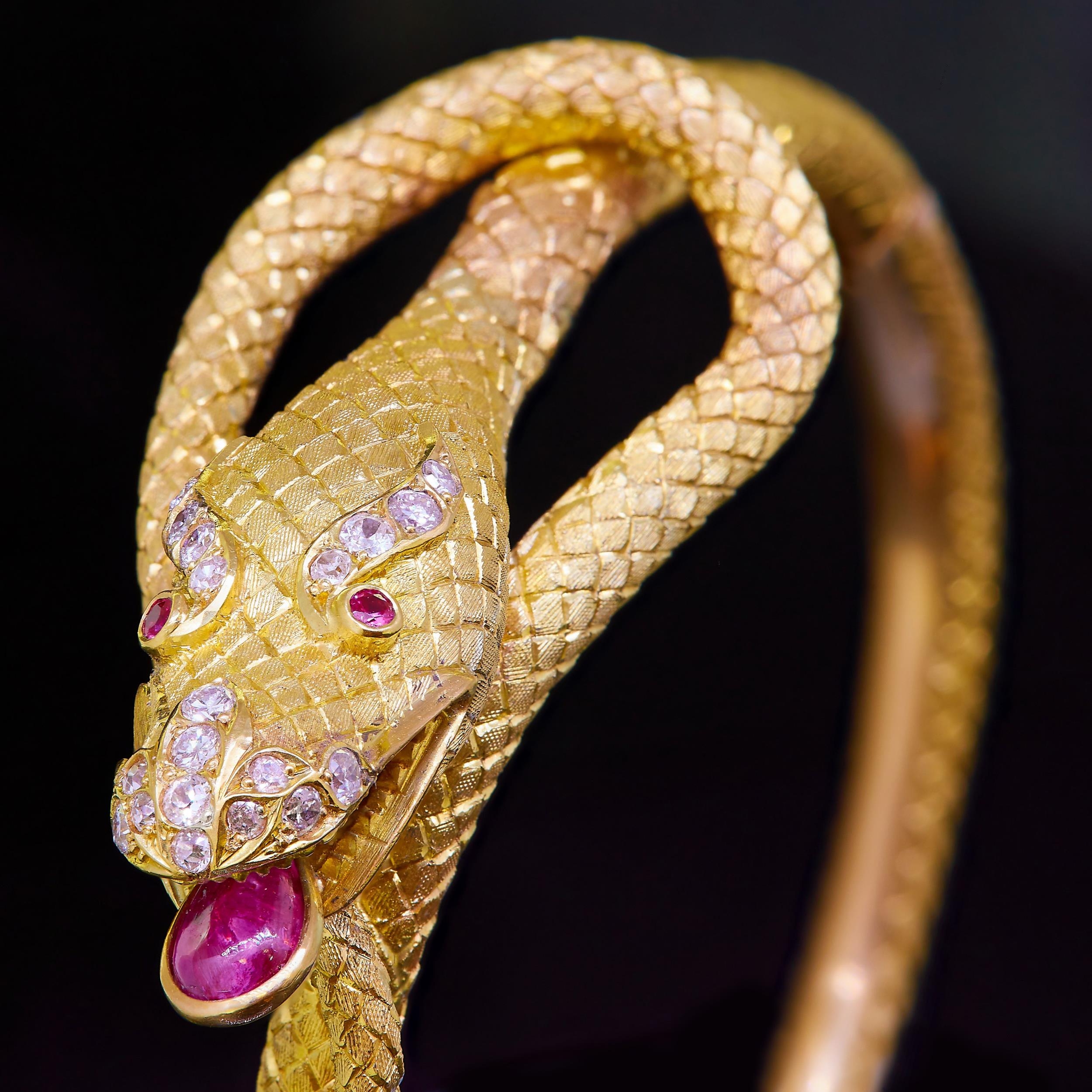 A 19th CENTURY CHINEASE DRAGON BANGLE, in yellow precious metal. The tongue set with a ruby of 1.29 ct. and diamond accents on the nose and eyes. The bangle overall with dragon skin pattern. Inner diam. 6.3 cm. 66.7 grams.