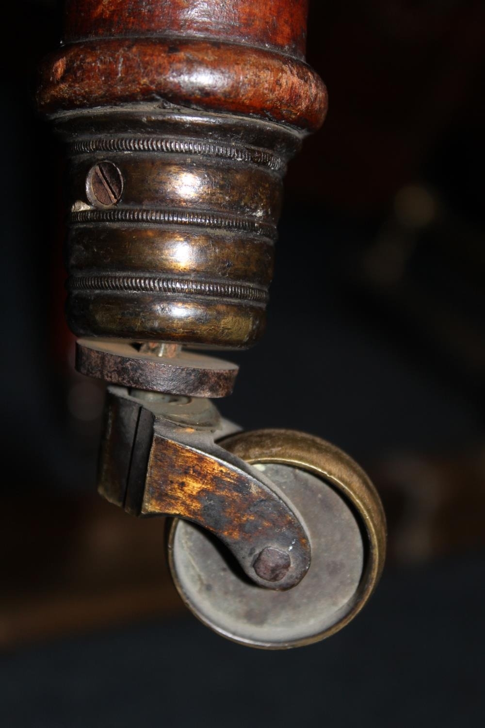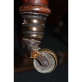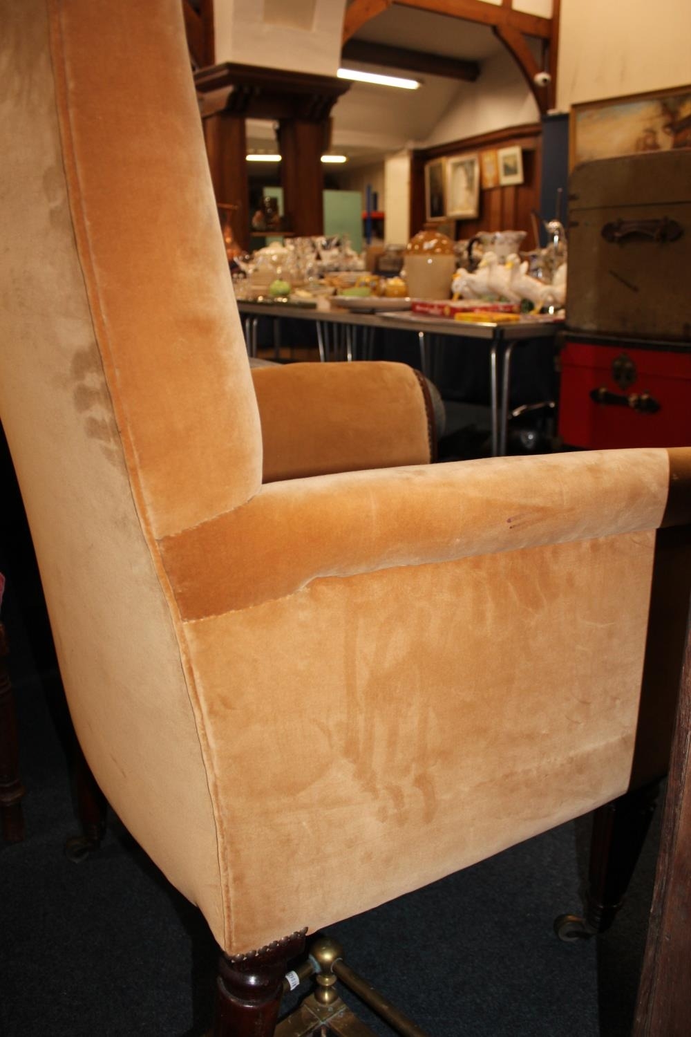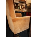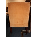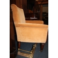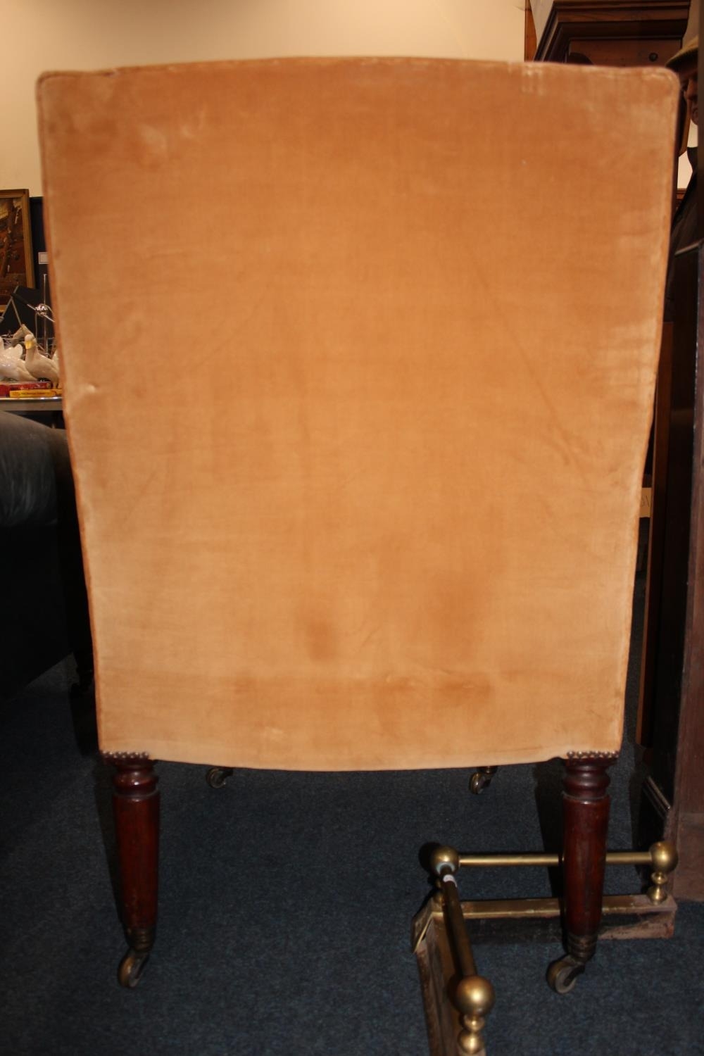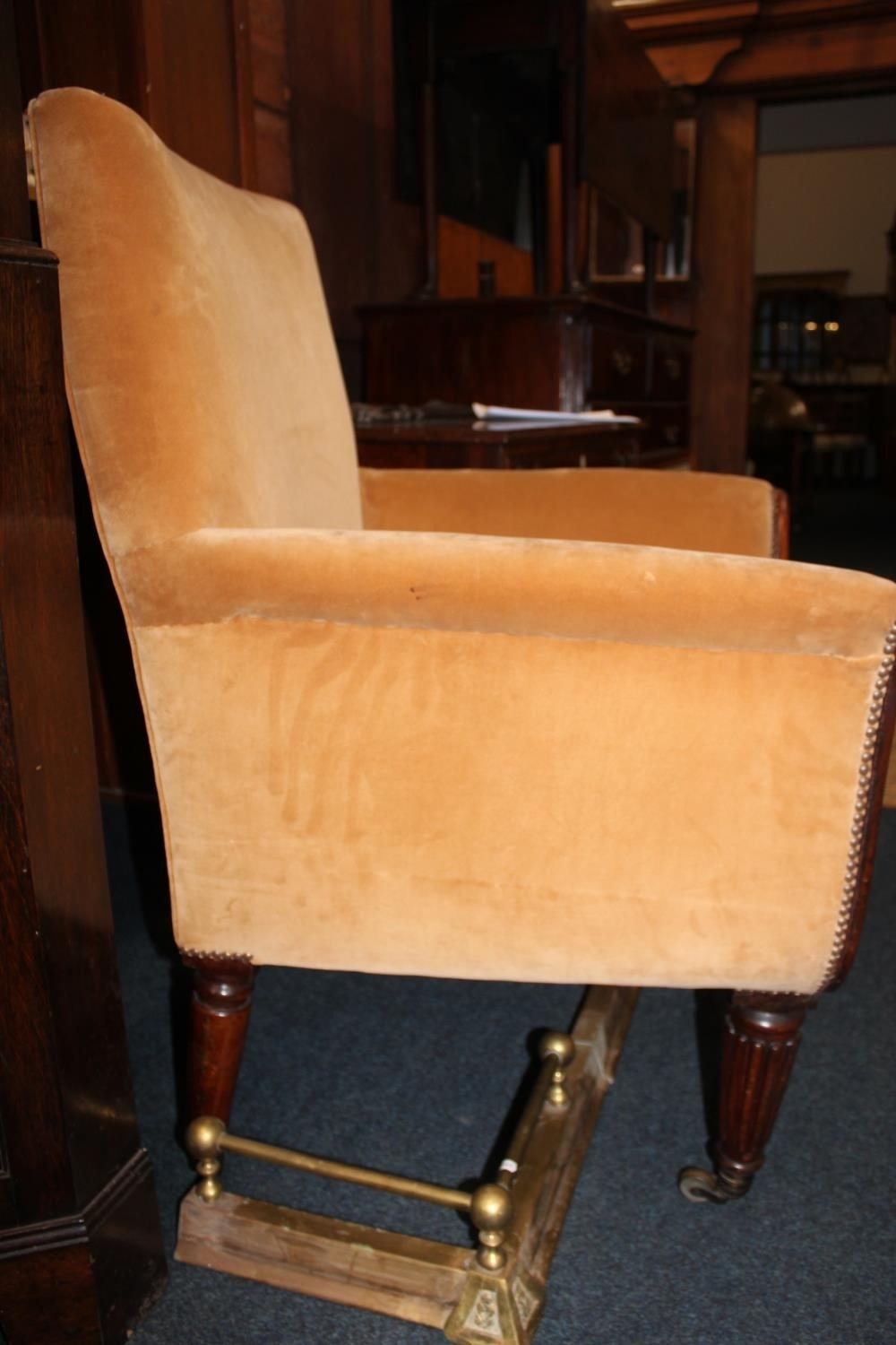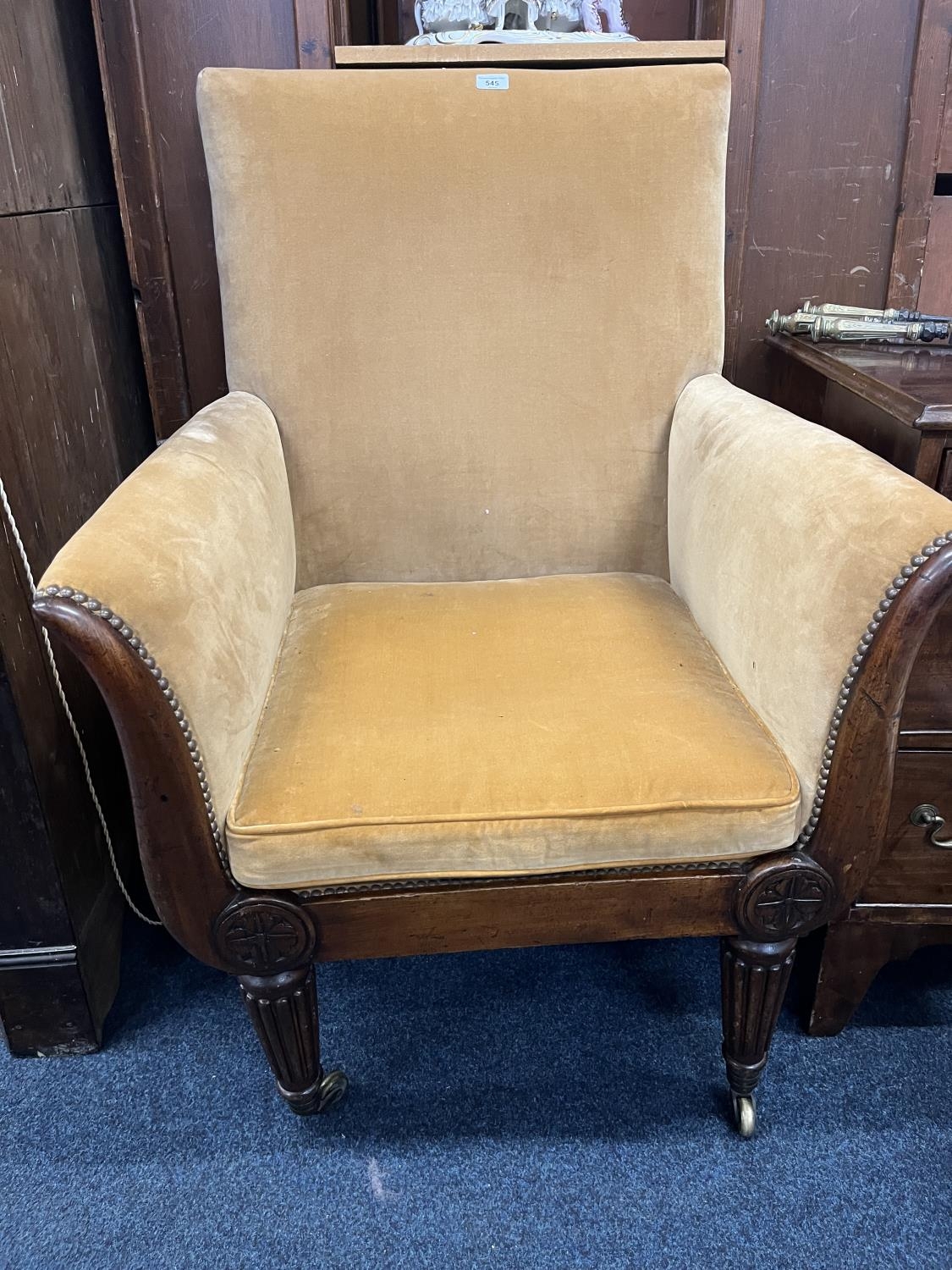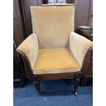 Antique mahogany armchair, raised on fluted supports with brass castors.