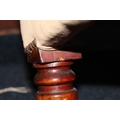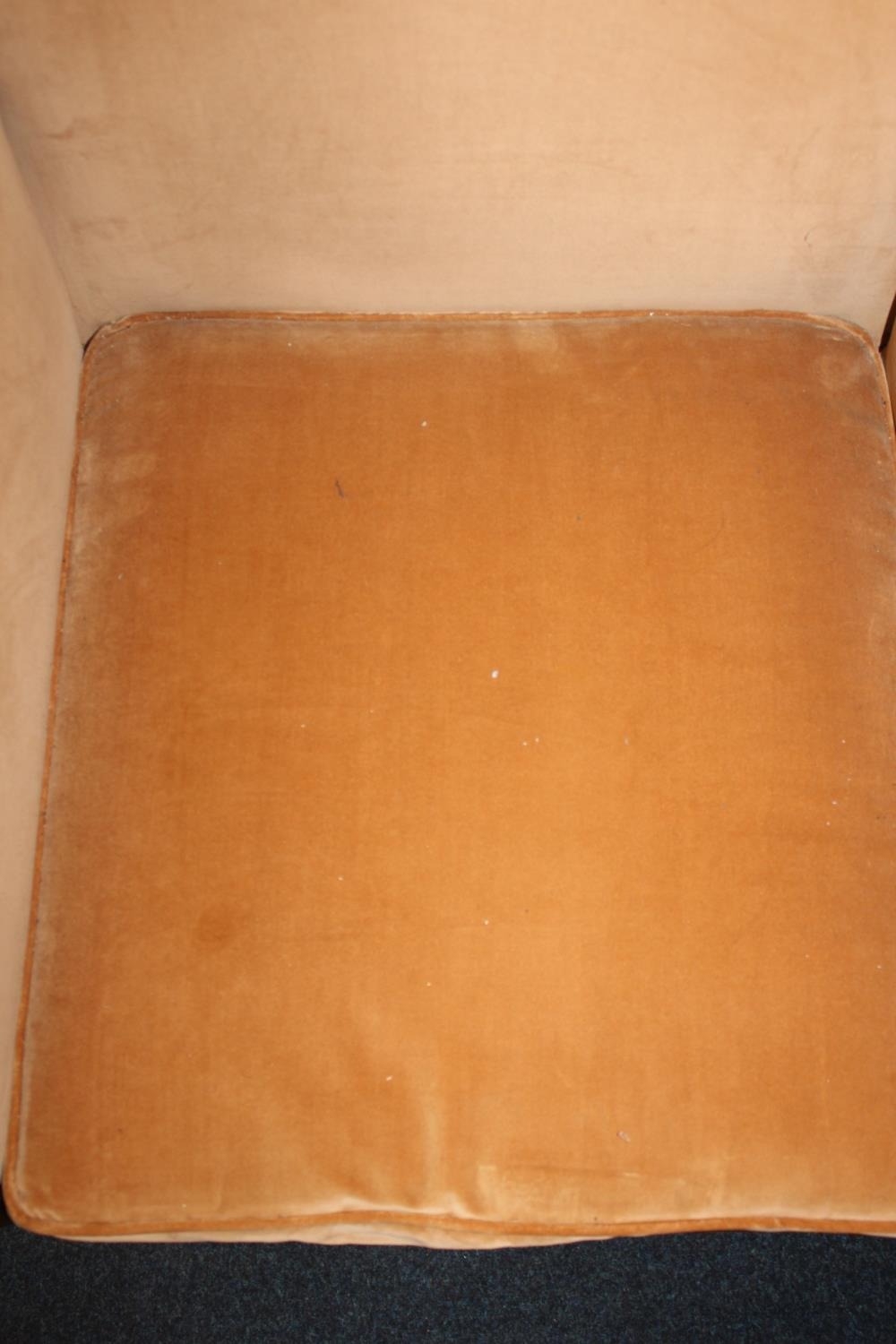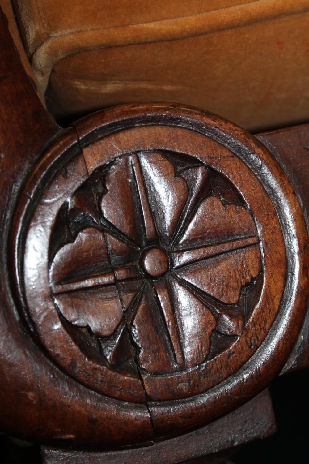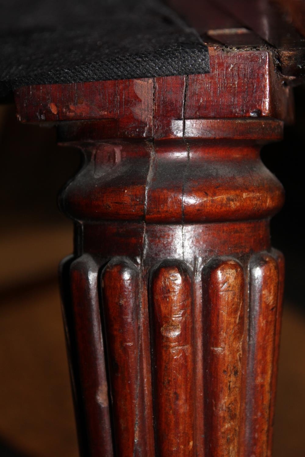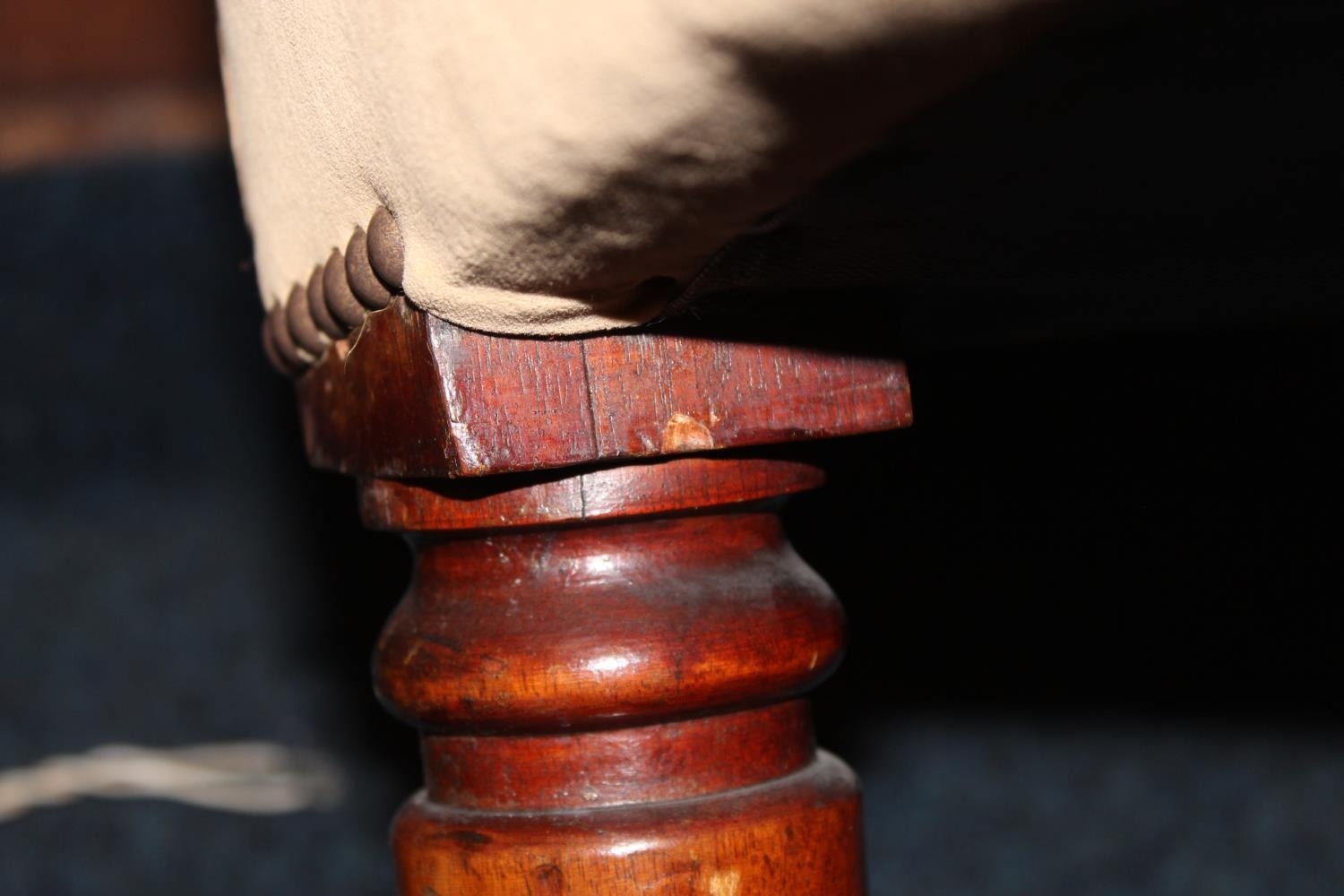 There is some splitting to the woodwork, as shown in additional images. Little signs of wear to the upholstery.