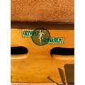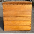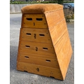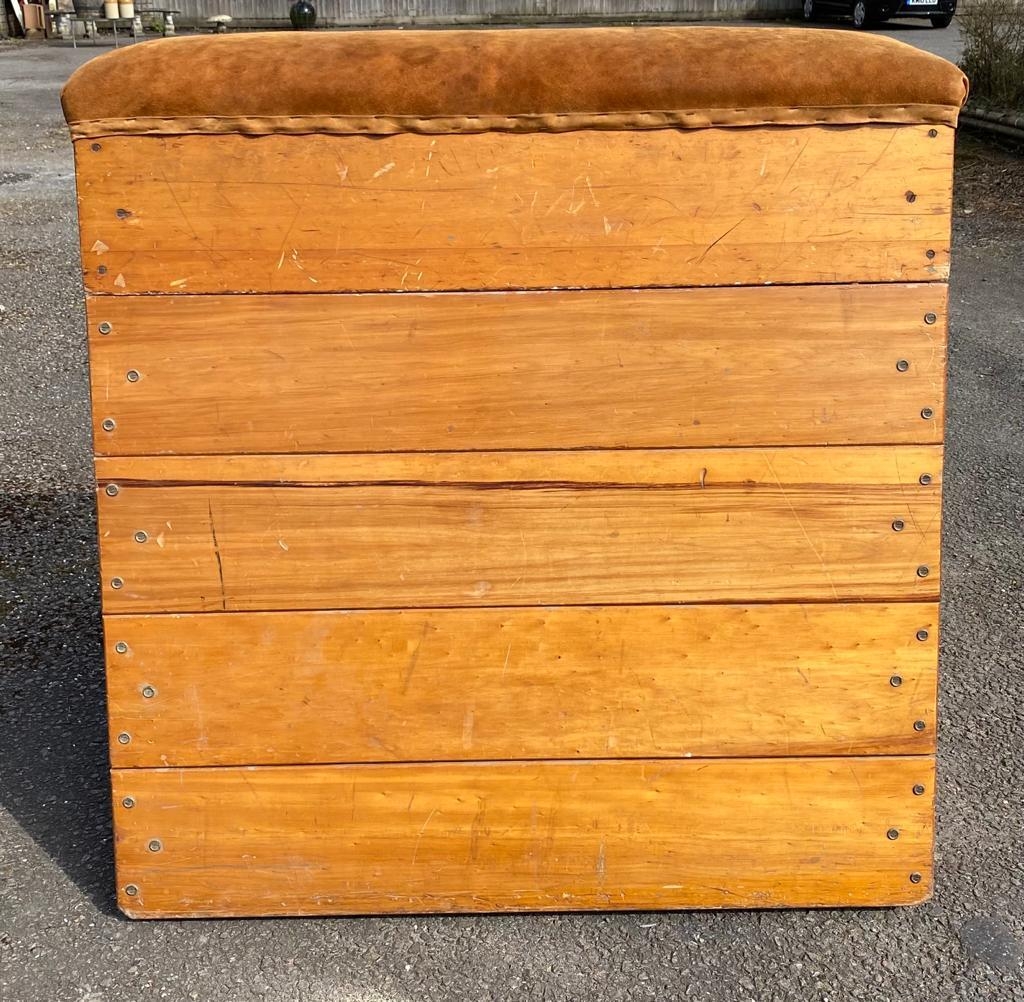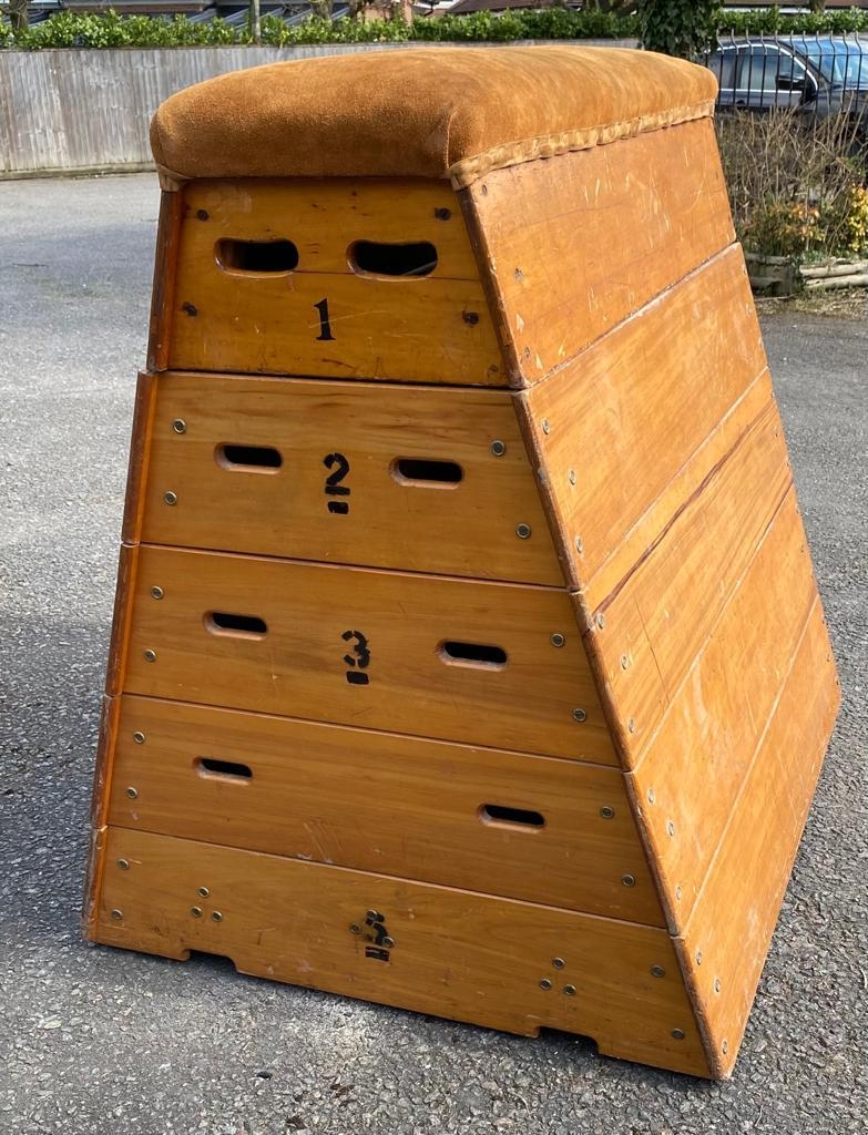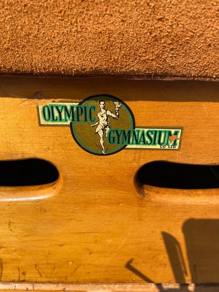 A VINTAGE GYMNASTICS SUEDE LEATHER AND PINE VAULTING HORSE .