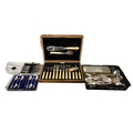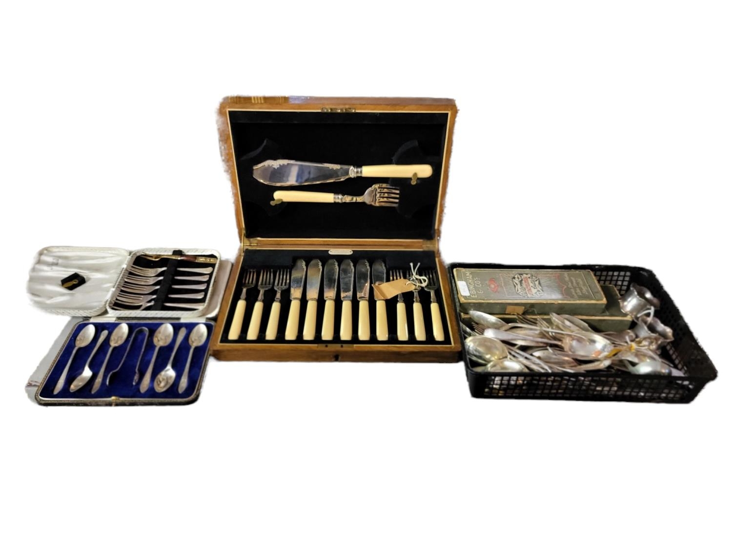 Scrolled border, hallmarked Birmingham, 1909, together with a set of six white metal and hardstone teaspoons, a four piece tea set and a cased set of silver plated fish knives and forks with silver ferrules, hallmarked Sheffield, 1925, a cased set of teaspoons and a collection of loose silver plated cutlery.