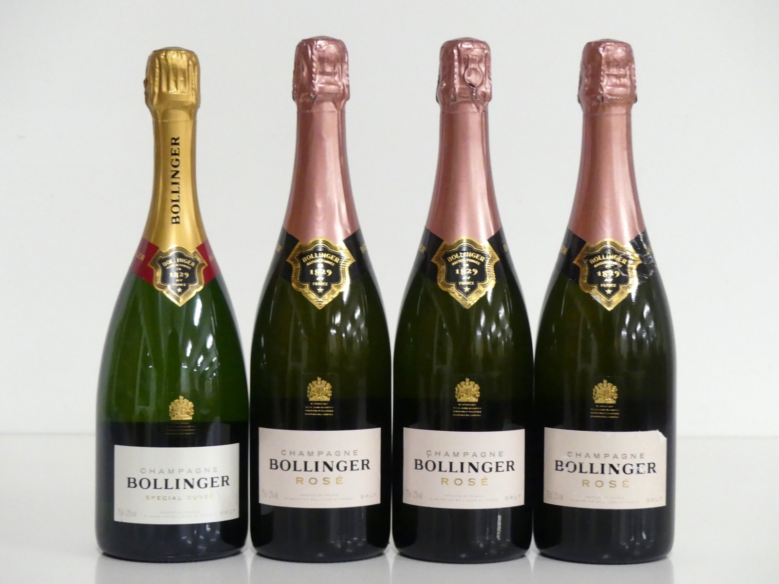 1 bt Bollinger Special Cuvée Brut NV Champagne 3 bts Bollinger Brut Rosé NV Champagne 1 vsl scuffed label Above 4 bottles