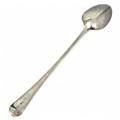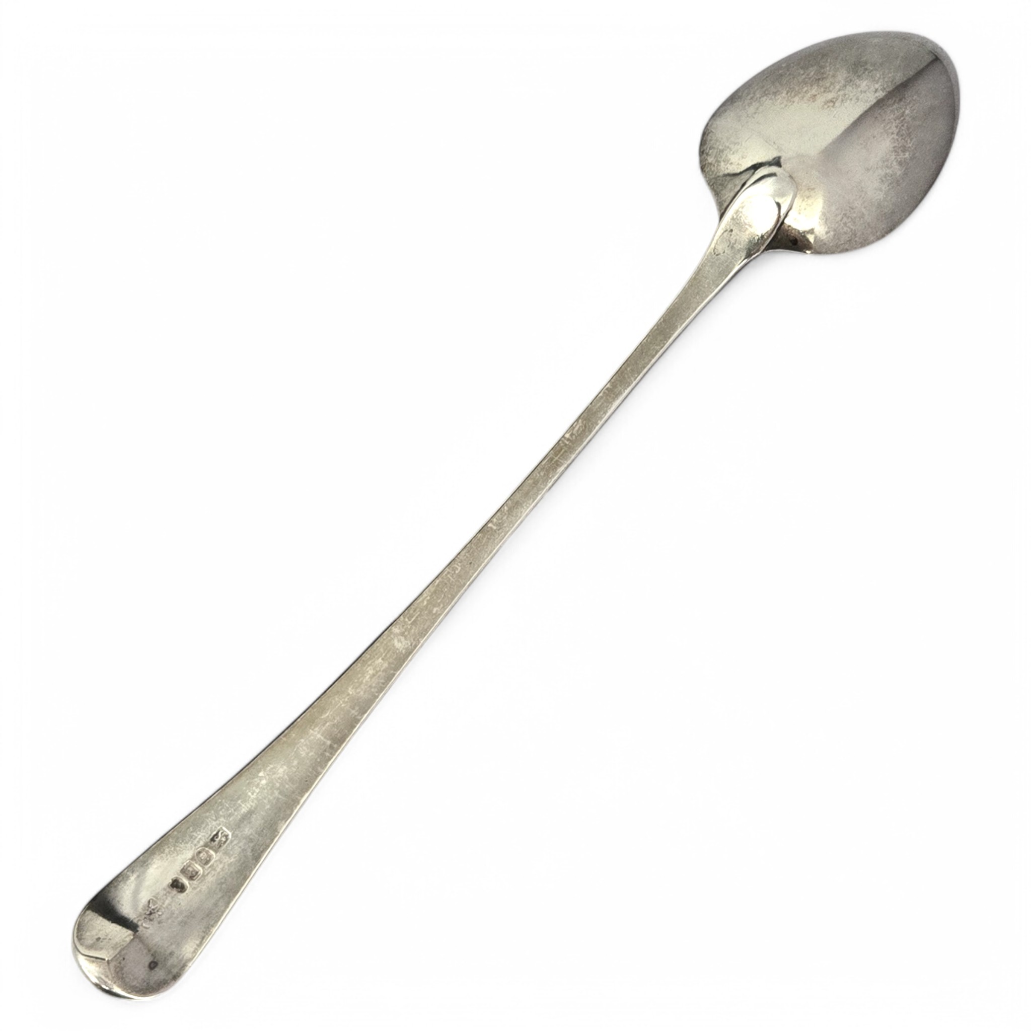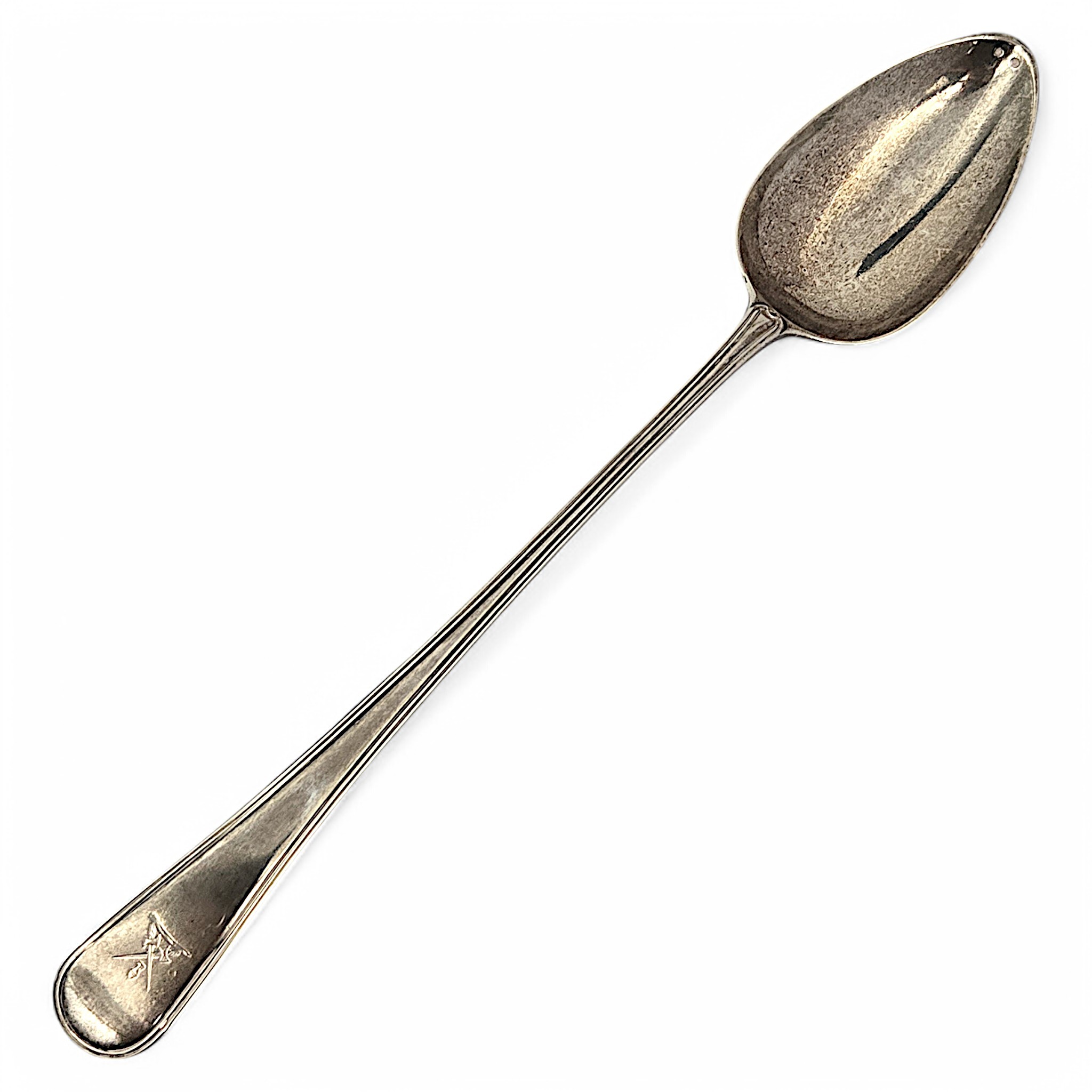 Georgian silver basting/stuffing spoon London assayed 31cm long with engraved crest. 117.4gms. Shipping group (A).