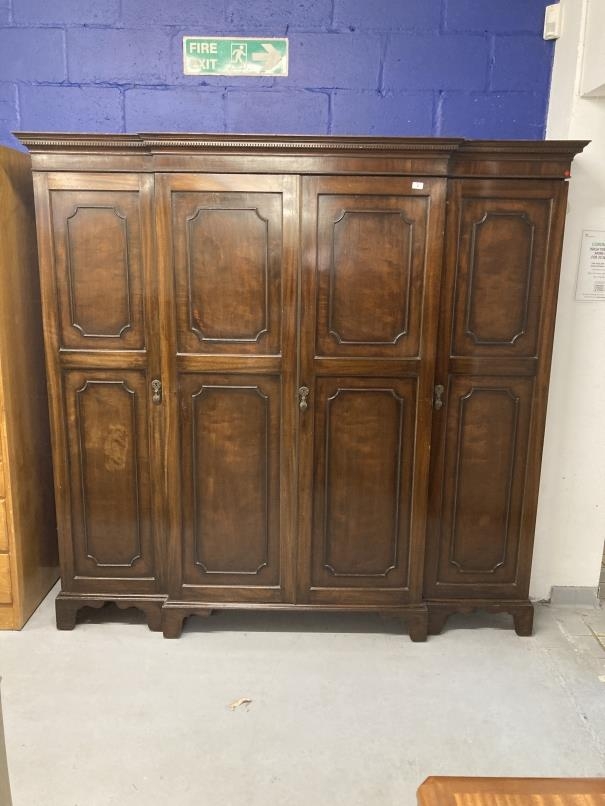 1920s mahogany break front wardrobe with castellated pelmet over four doors decorated with applied mouldings on bracket supports. 80ins. x 23ins. x 80ins.