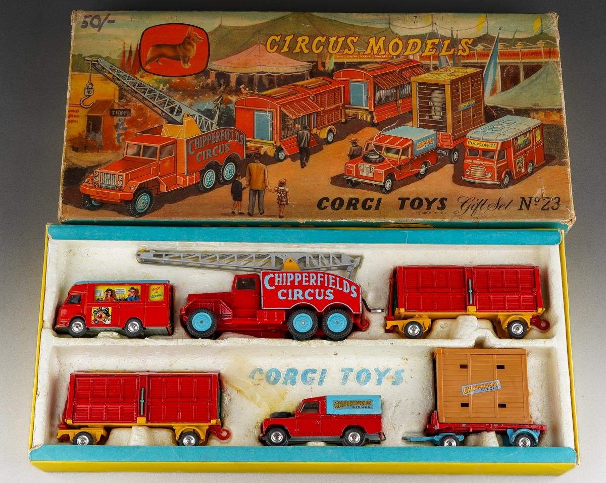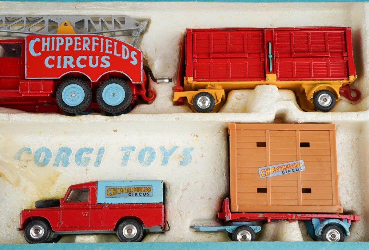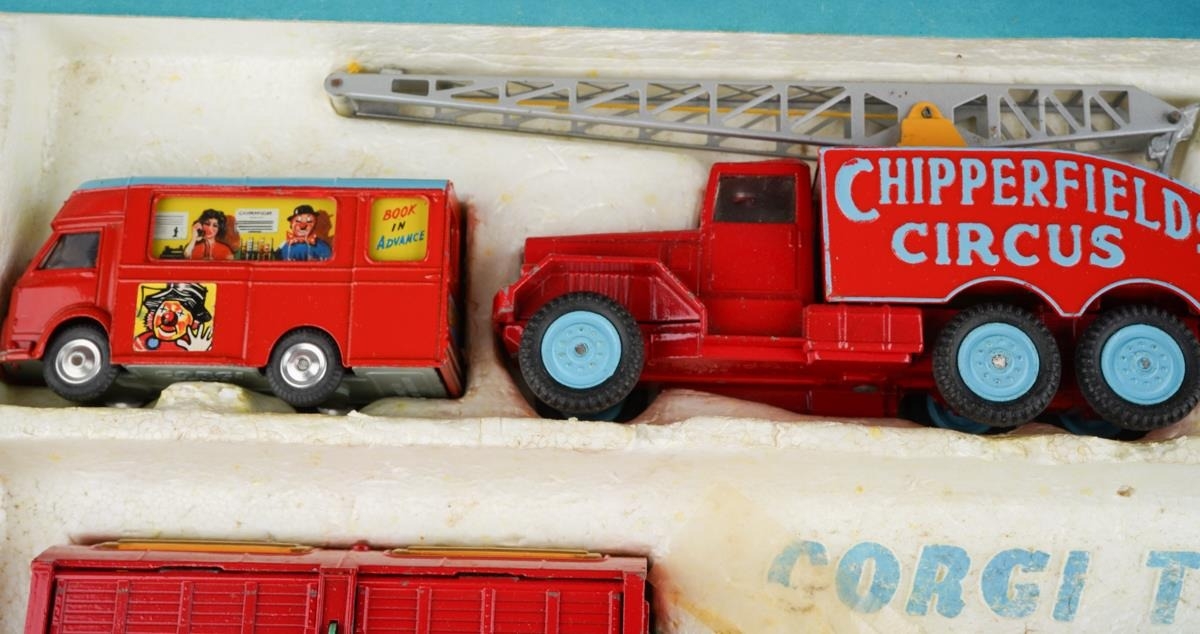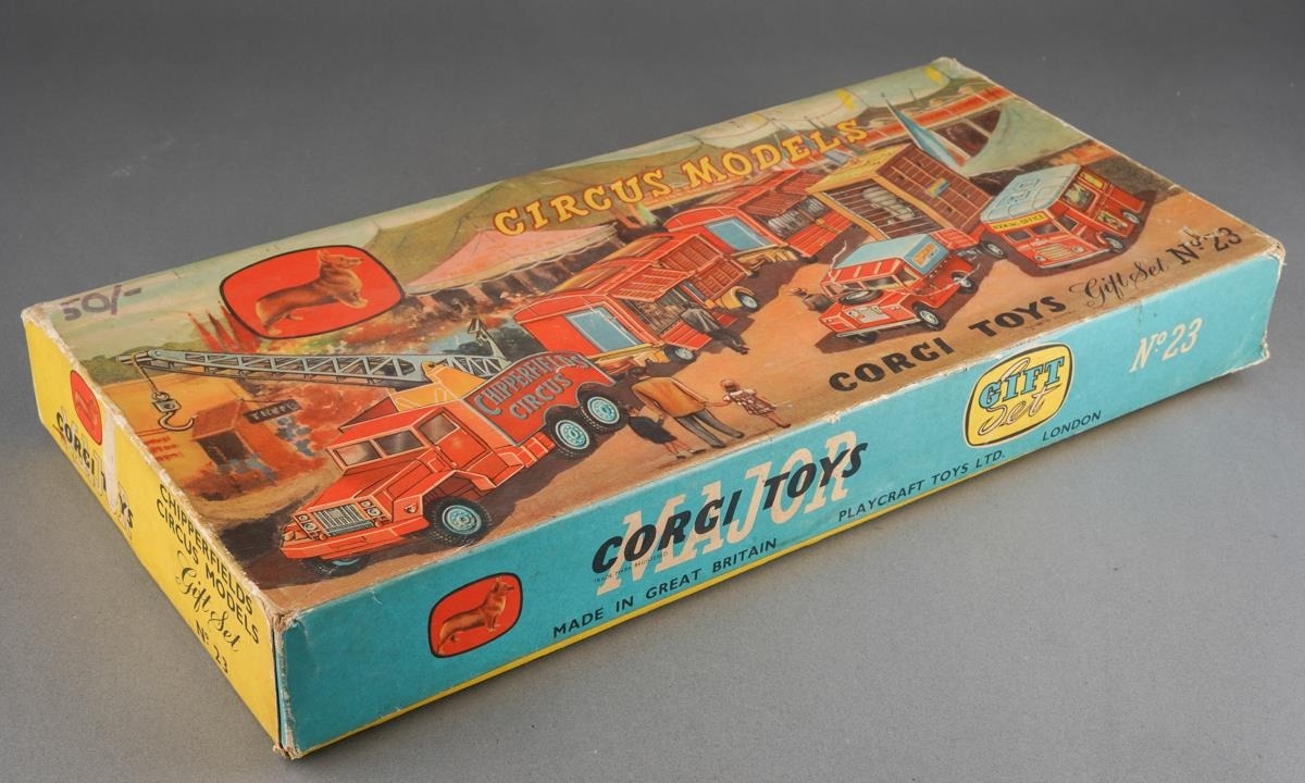 A boxed Corgi Major Chipperfields Circus Models Gift Set No. 23 comprising booking office, crane, two animal trailers, Land Rover and elephant trailer [1] some wear to box