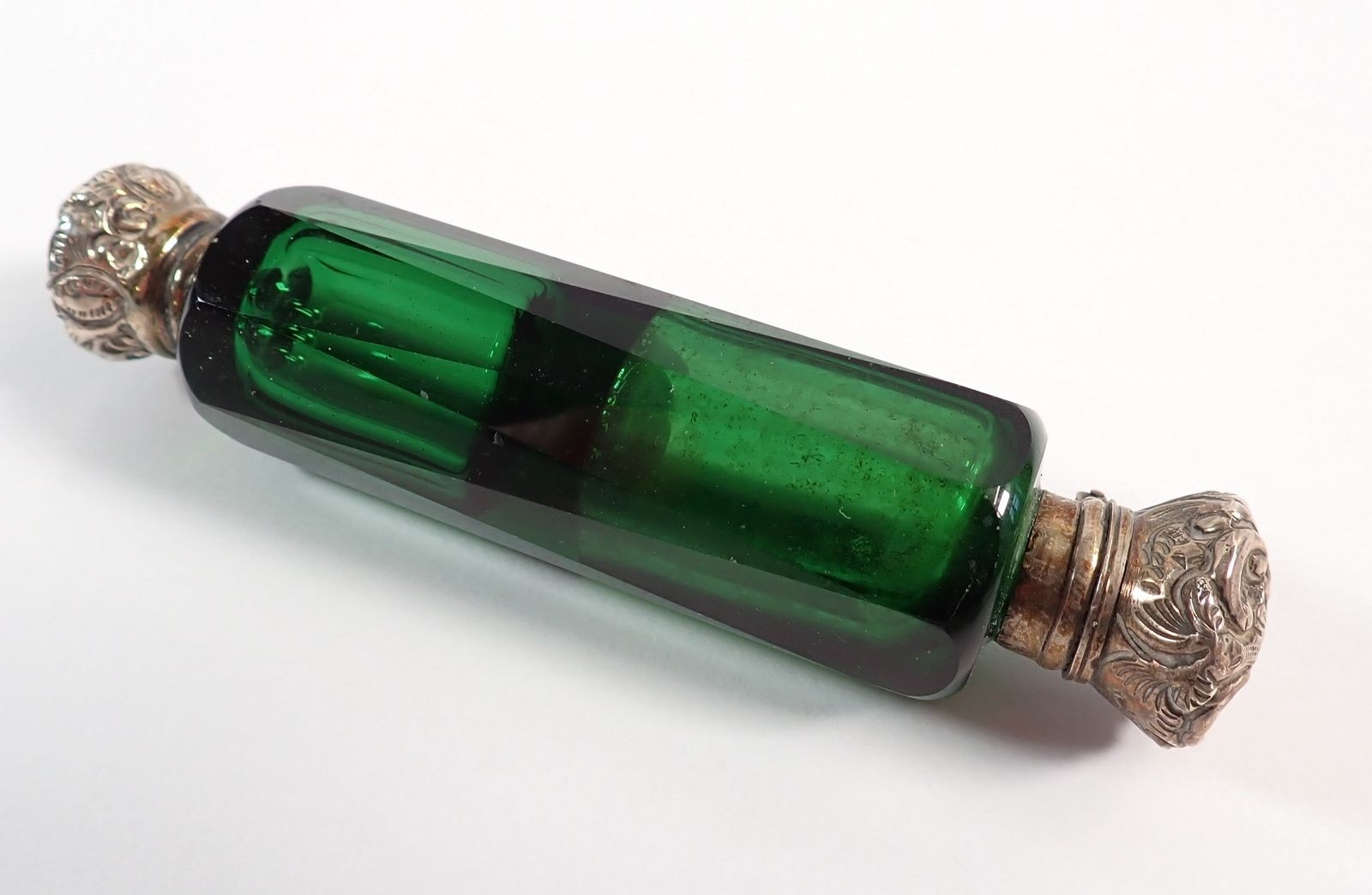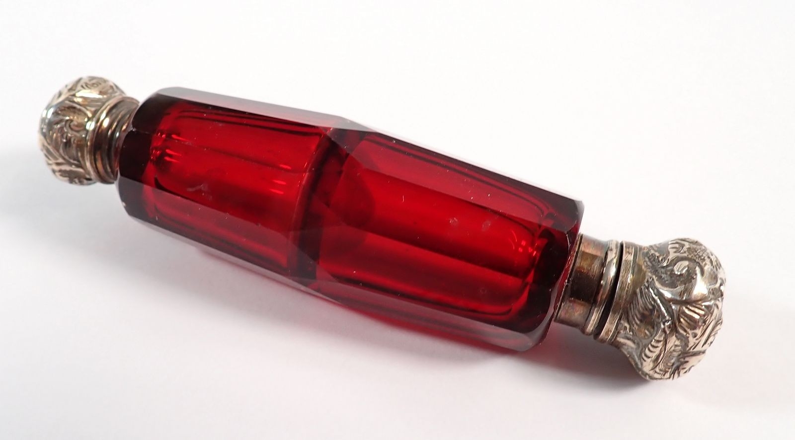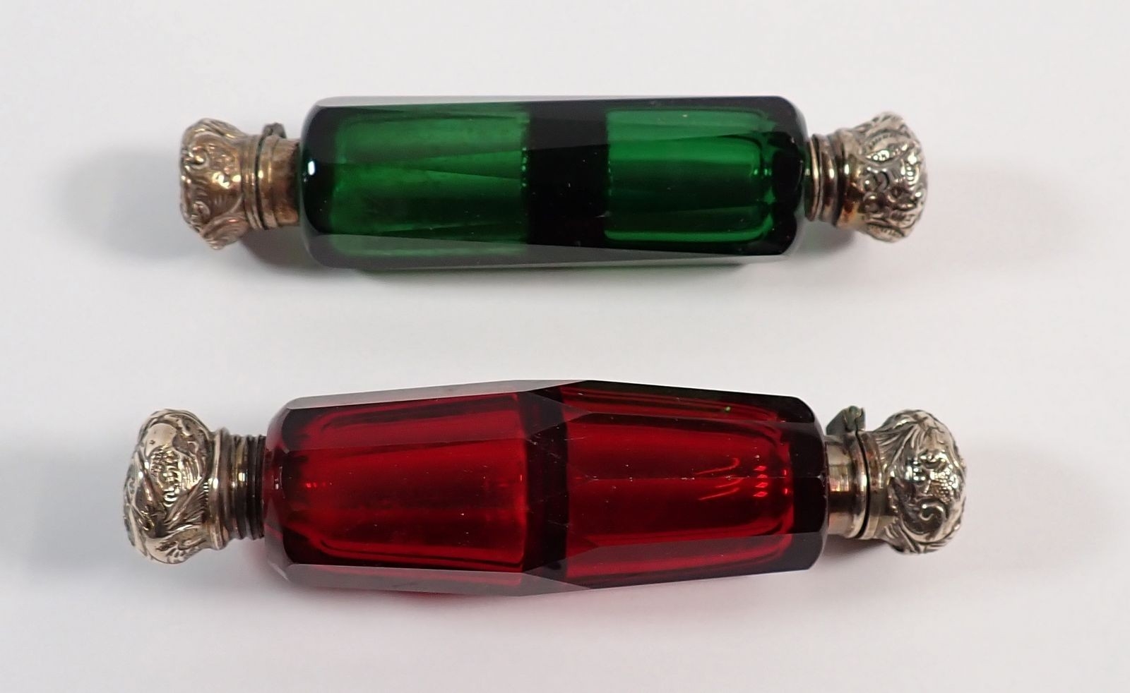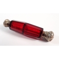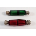 A Victorian red glass double ended scent bottle and a green glass one, both with silver plated lids, 10cm