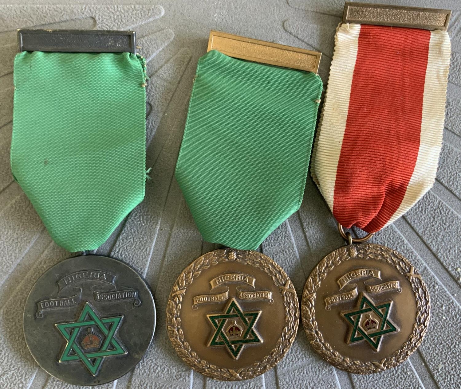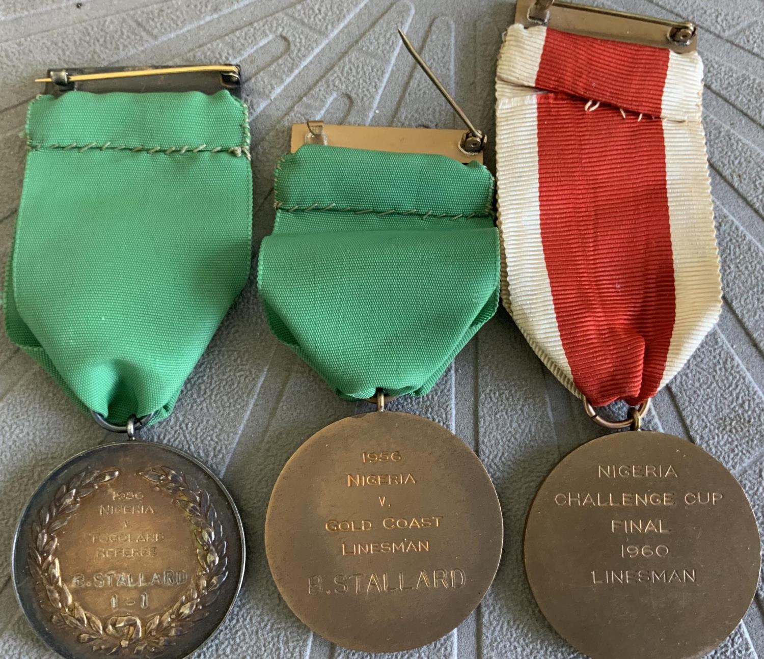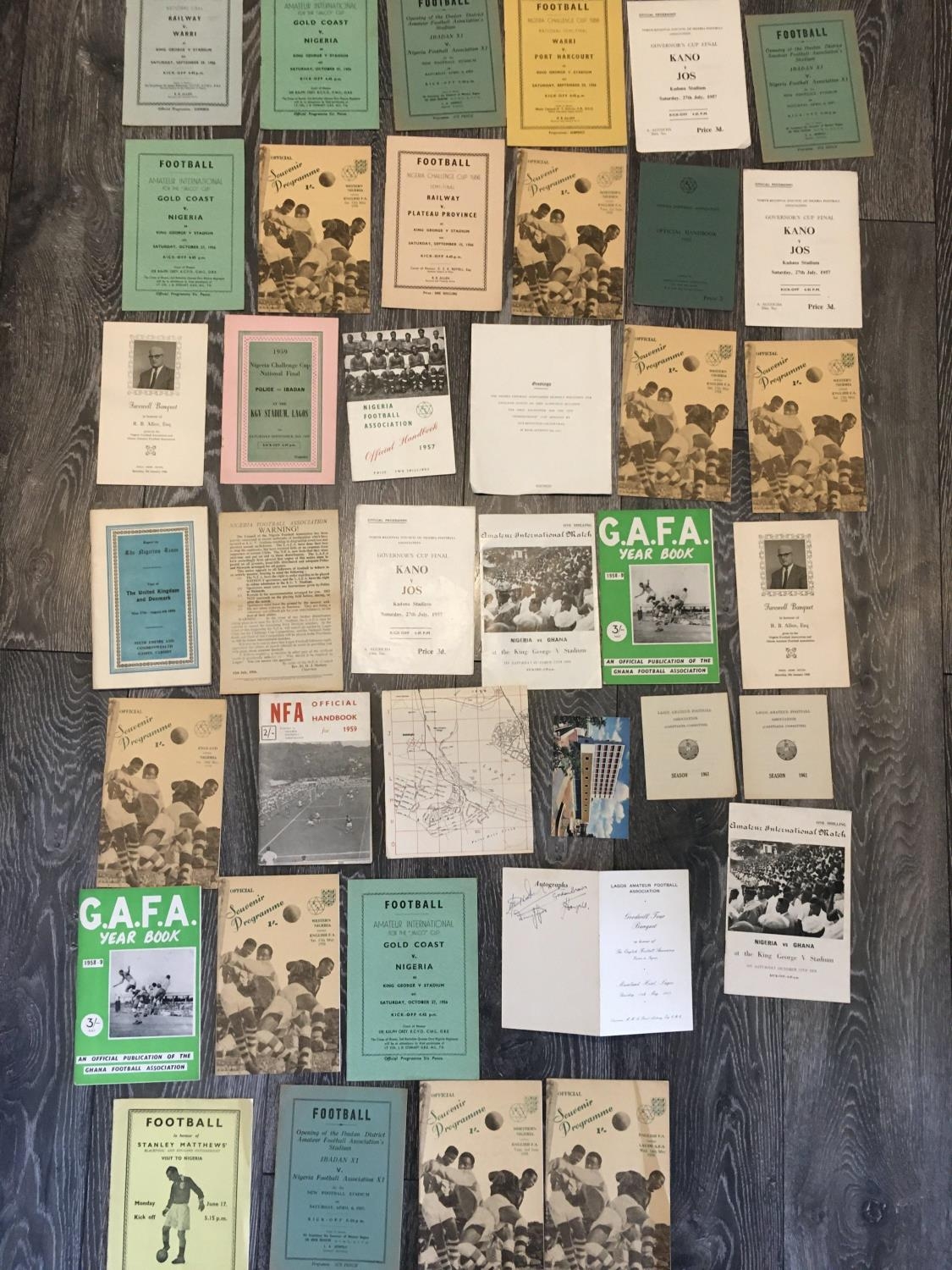 1950s Nigeria Football Programmes + Medals: Following crowd disturbances, English officials were sent to Nigeria in the mid to late 50s to help improve the situation. This collection is from a U.K. linesman from the mid to late 50s and includes many internationals cup finals and menus. 1957 Stanley Matthews playing for Nigeria FA v Lagos, 1958 English FA v North Nigeria, Lagos FA, Nigeria and West Nigeria. C/W 3 medals which are for being Linesman at the 1960 Cup Final, 1956 Nigeria v Gold Coast + Togo. Interesting lot indeed. Good. (36 programmes)