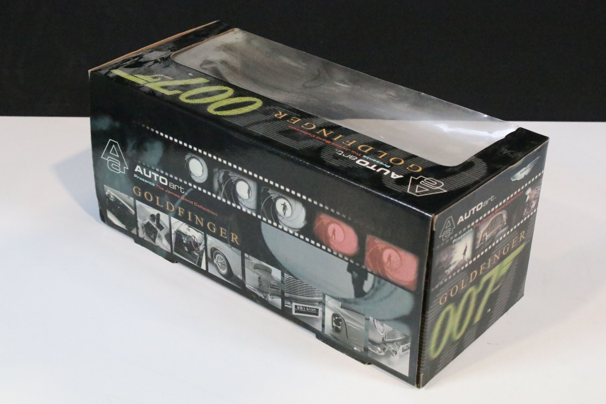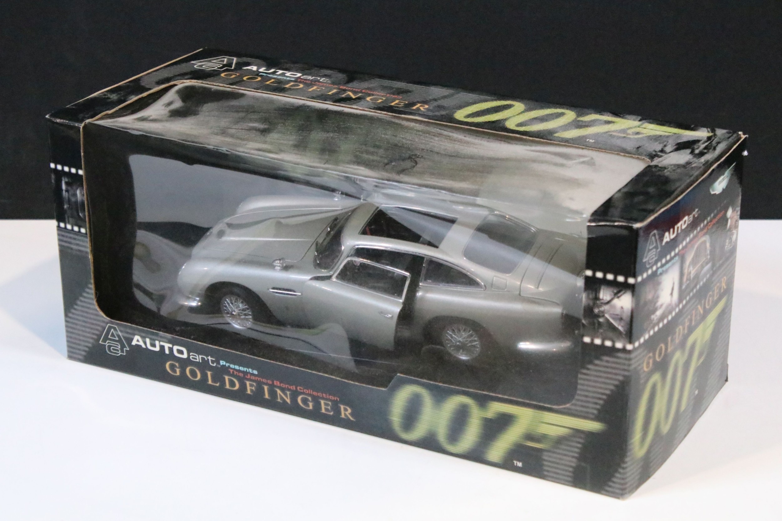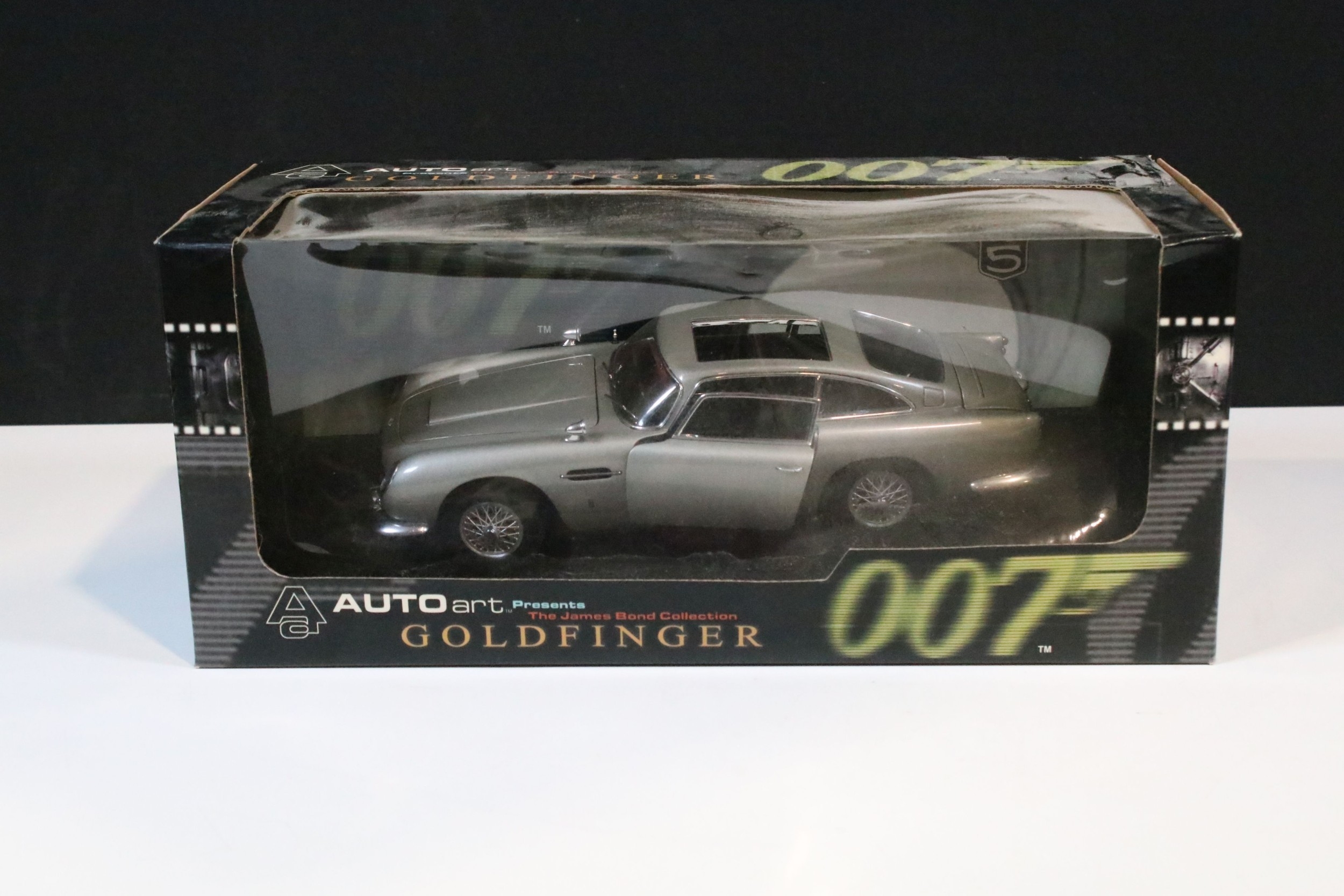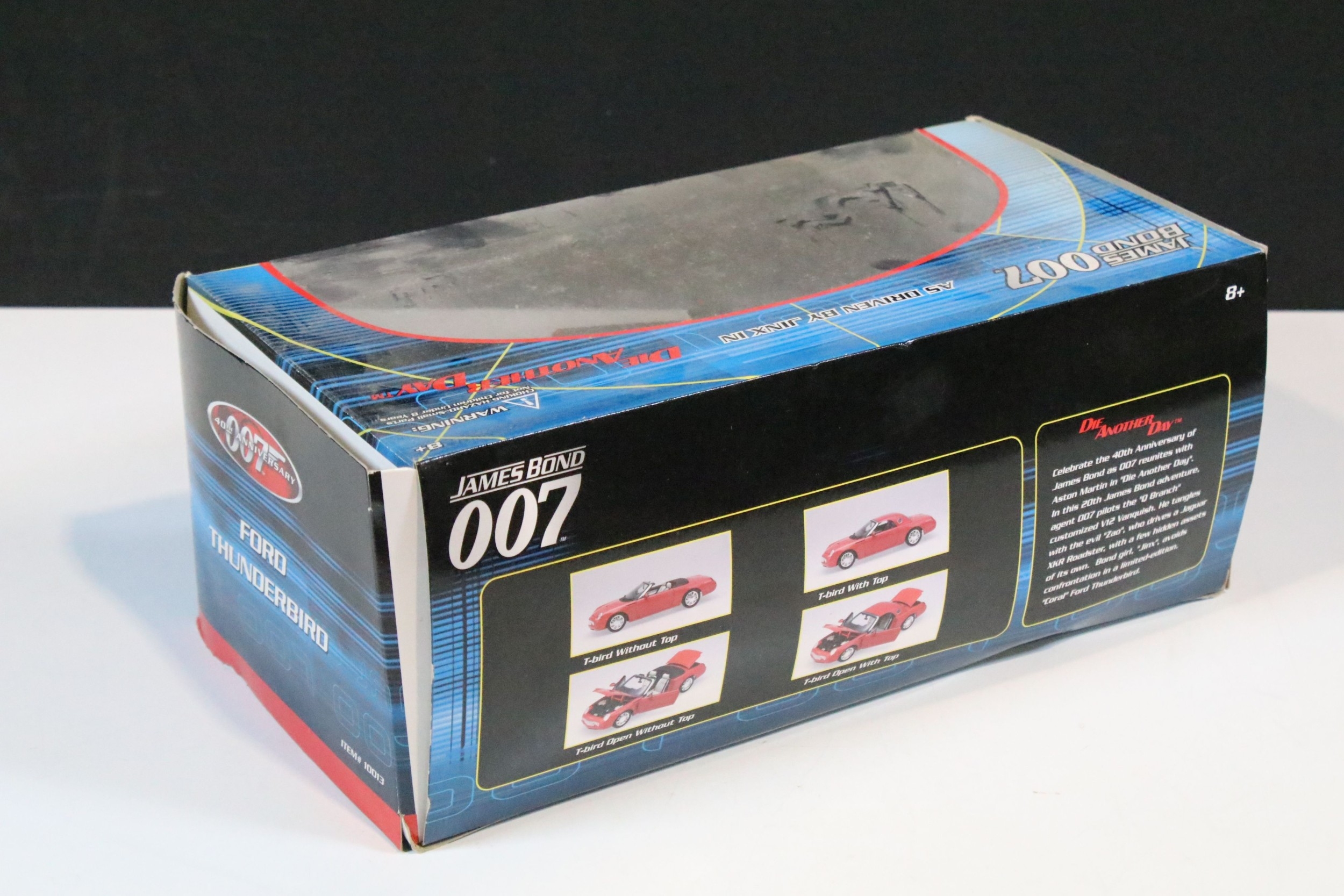 Two boxed 1/18 scale James Bond related diecast models to include AutoArt 70021 James Bond 007 Goldfinger Aston Martin DB5 and Paul's Model Art James Bond 007 Die Another Day Ford Thunderbird, diecast ex, boxes showing dustiness to plastic window and one window in need of re-gluing, but otherwise vg overall