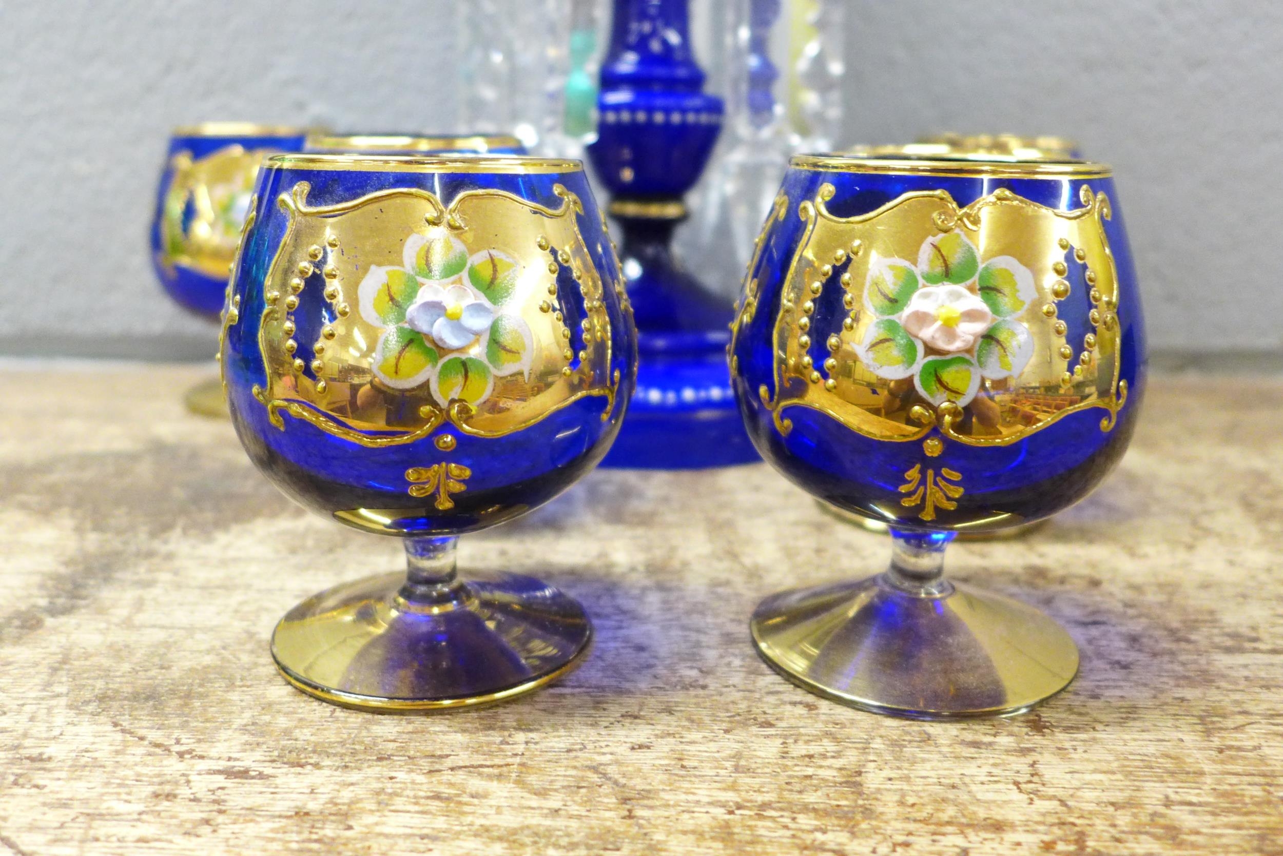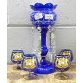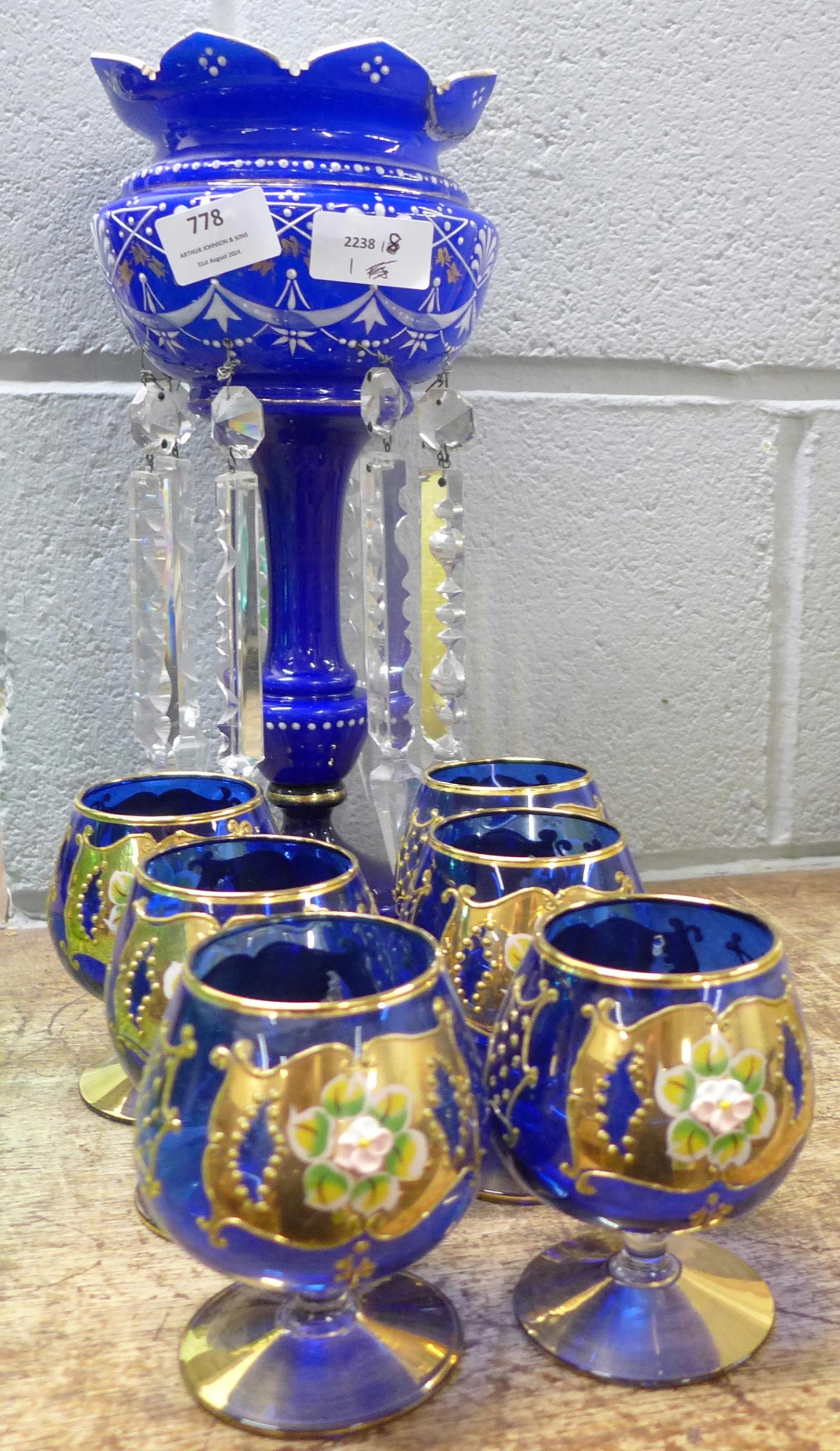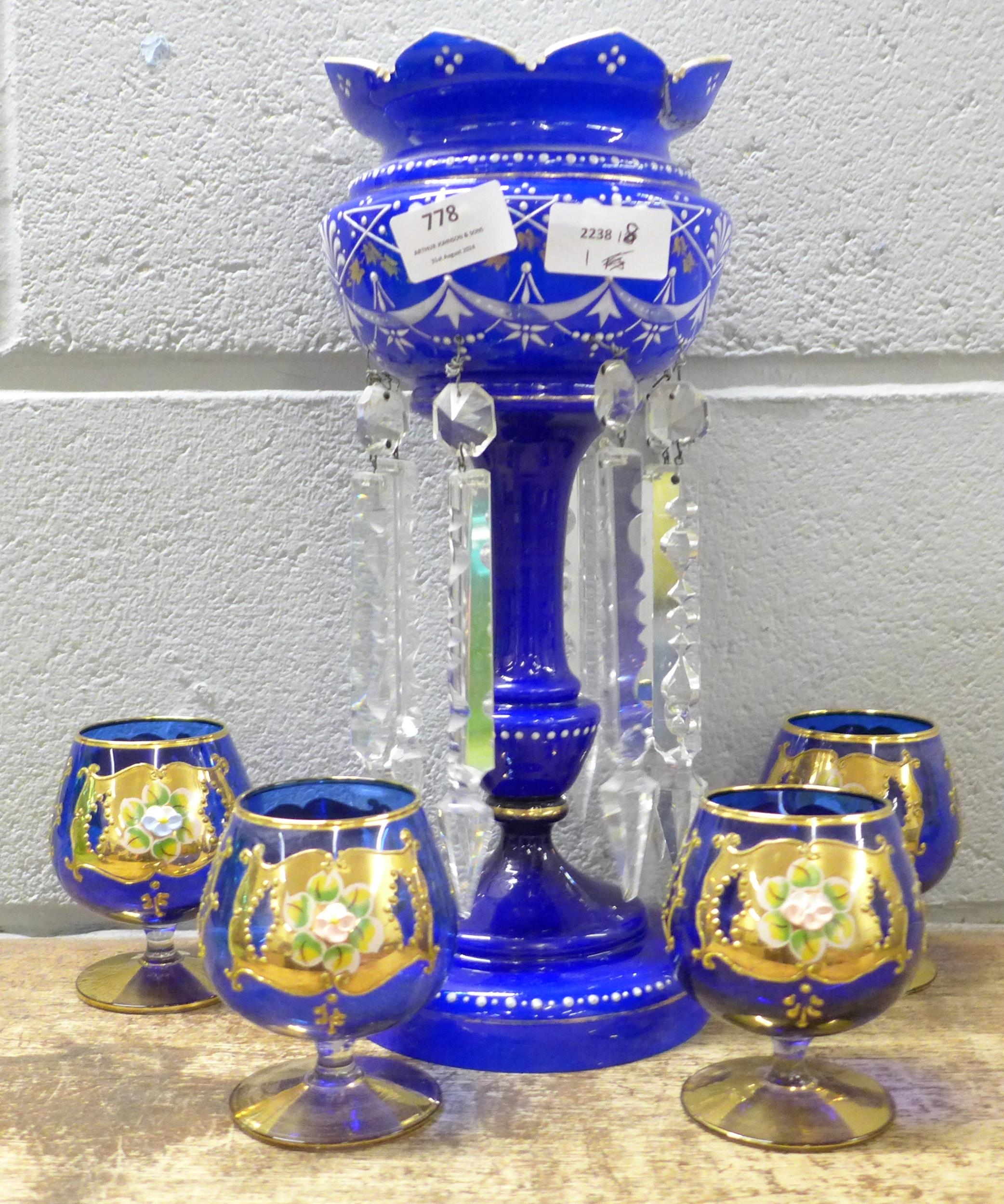 A glass lustre, a/f, and six blue glass liquer glasses