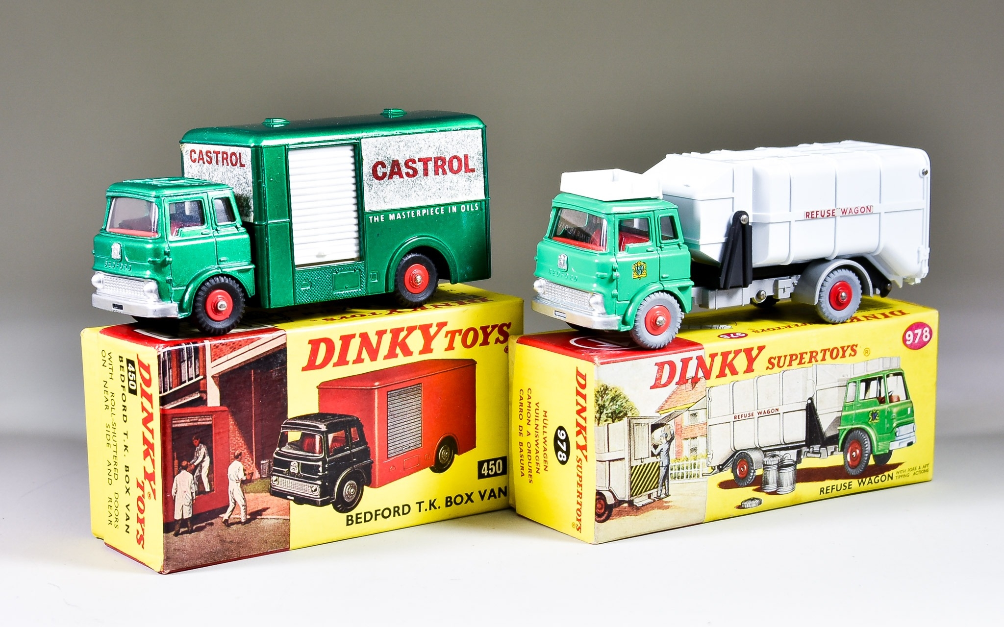 Two Dinky Toys Diecast Model Cars, comprising - No. 450 "Bedford T.K. Box Van", with metallic green body, plastic red spun hubs, white shutters, red interior and Castrol decal, and No. 978 "Refuse Wagon", with green cab, plastic red spun hubs, white wagon, grey carriage and red interior, both in original boxes