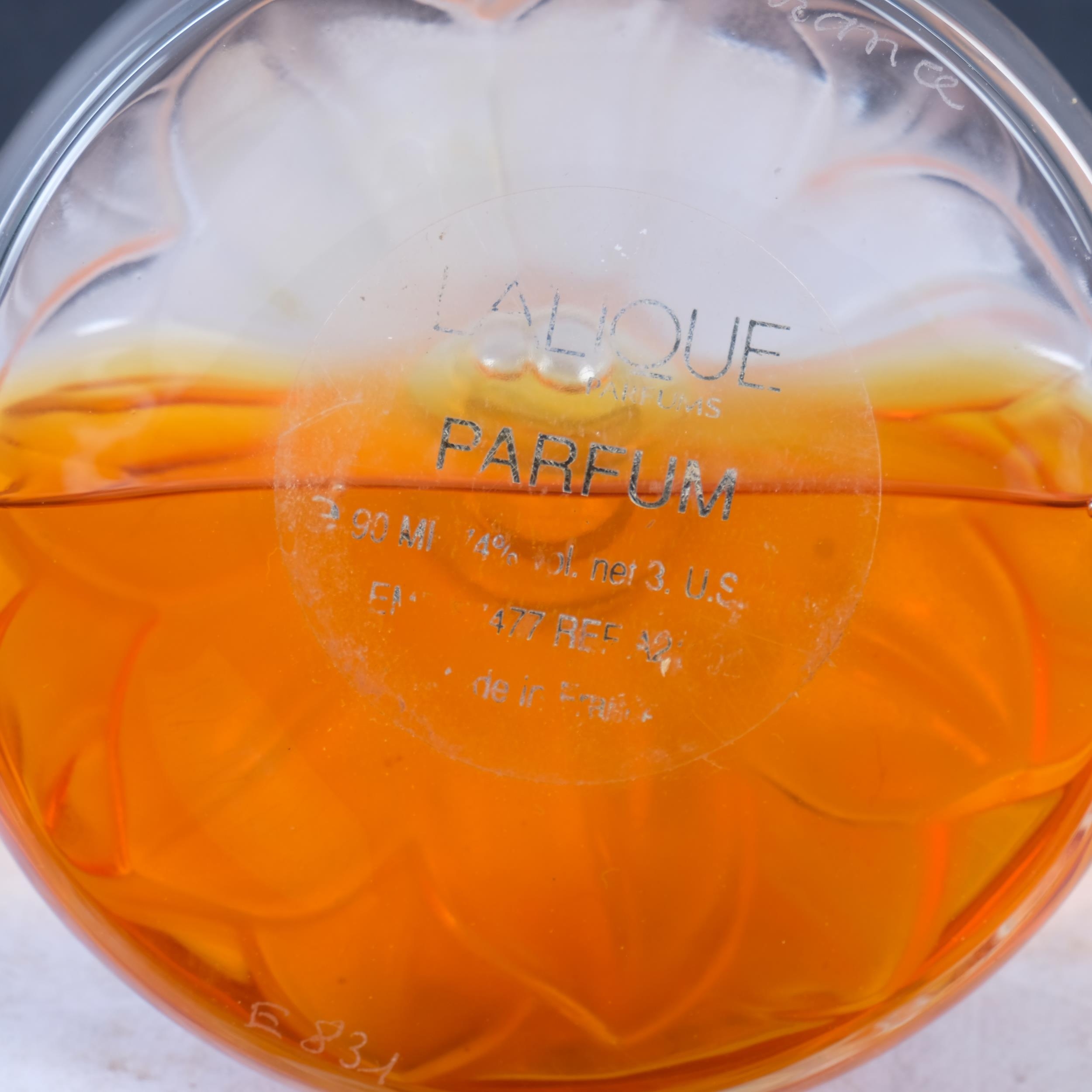 LALIQUE PARFUMS - A moulded glass "Le Nu" perfume bottle with contents, signed to base. Height 10.5cm.