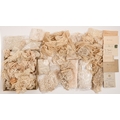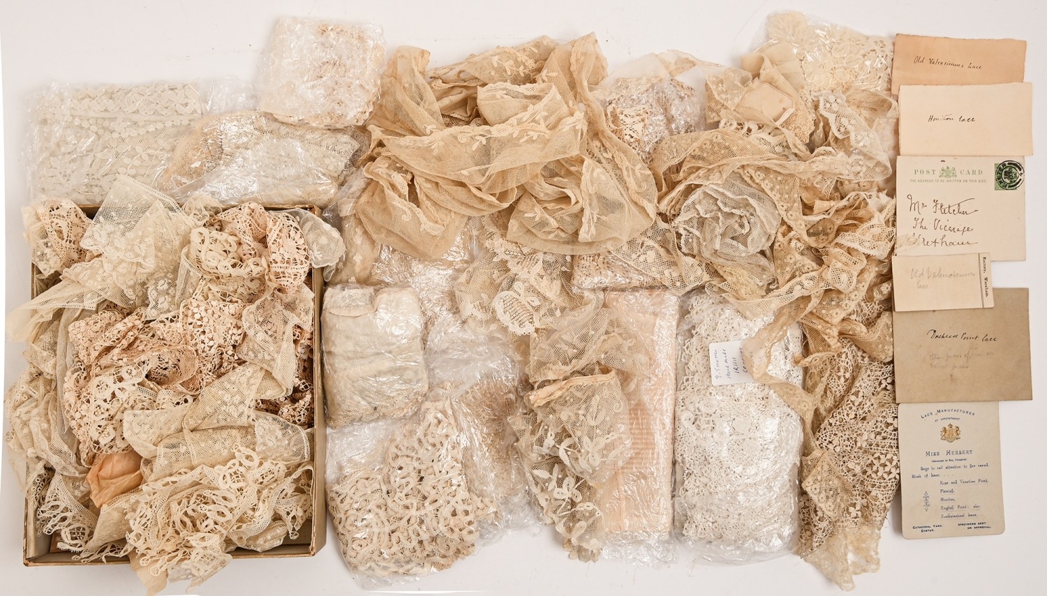 A collection of lace, 19th and early 20th c, including flounces and collars of Duchesse point, Irish and many others, with Victorian trade card of Miss Herbert, Lace Manufacturer, Cathedral Yard, Exeter and reply of the same on handwritten postcard to Mrs Fletcher, 1906