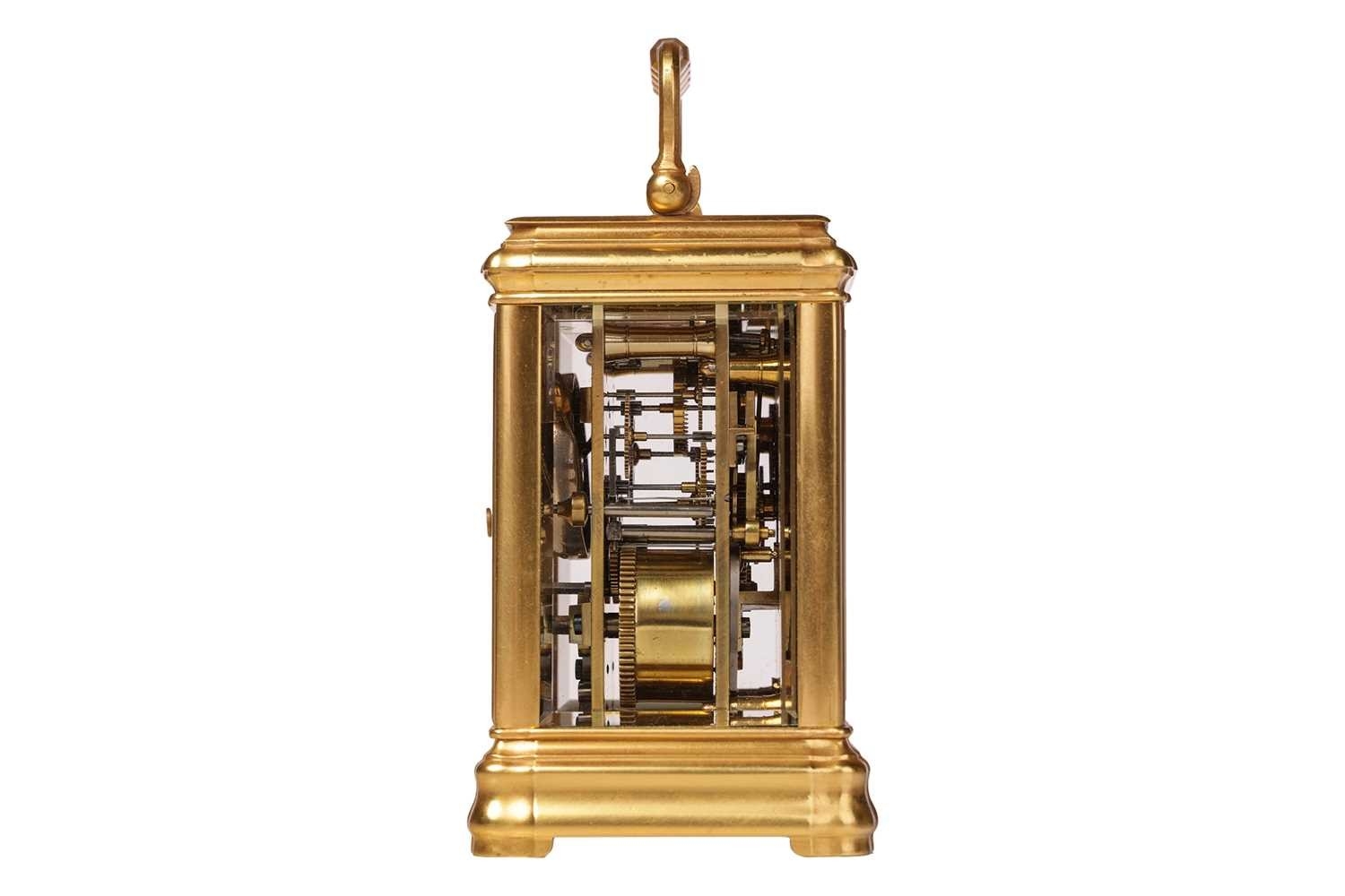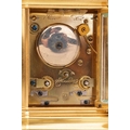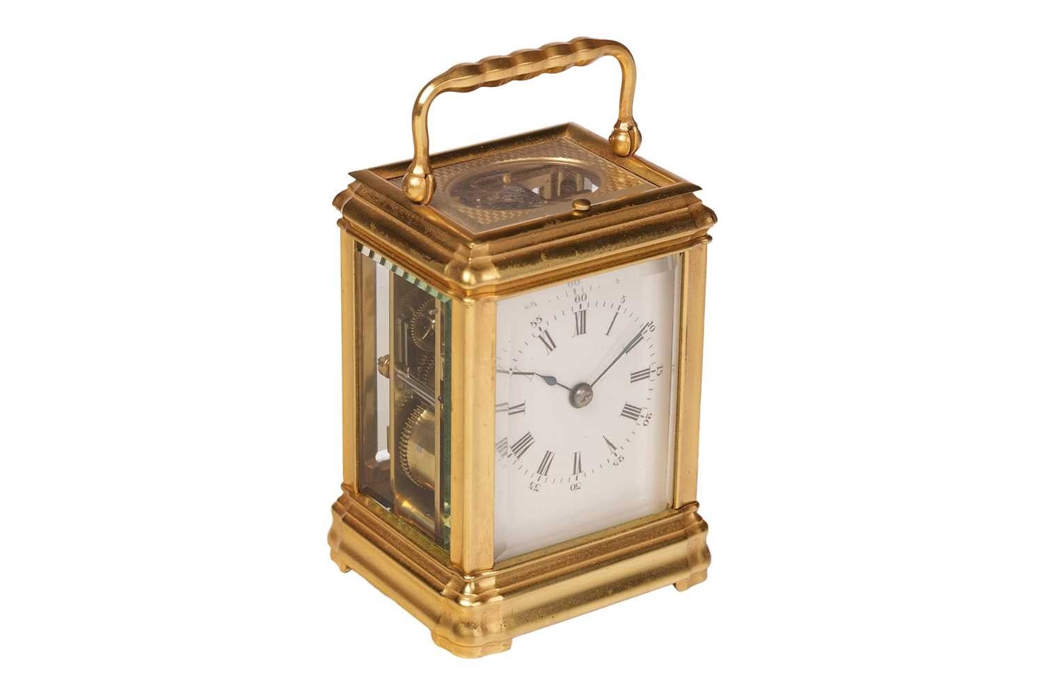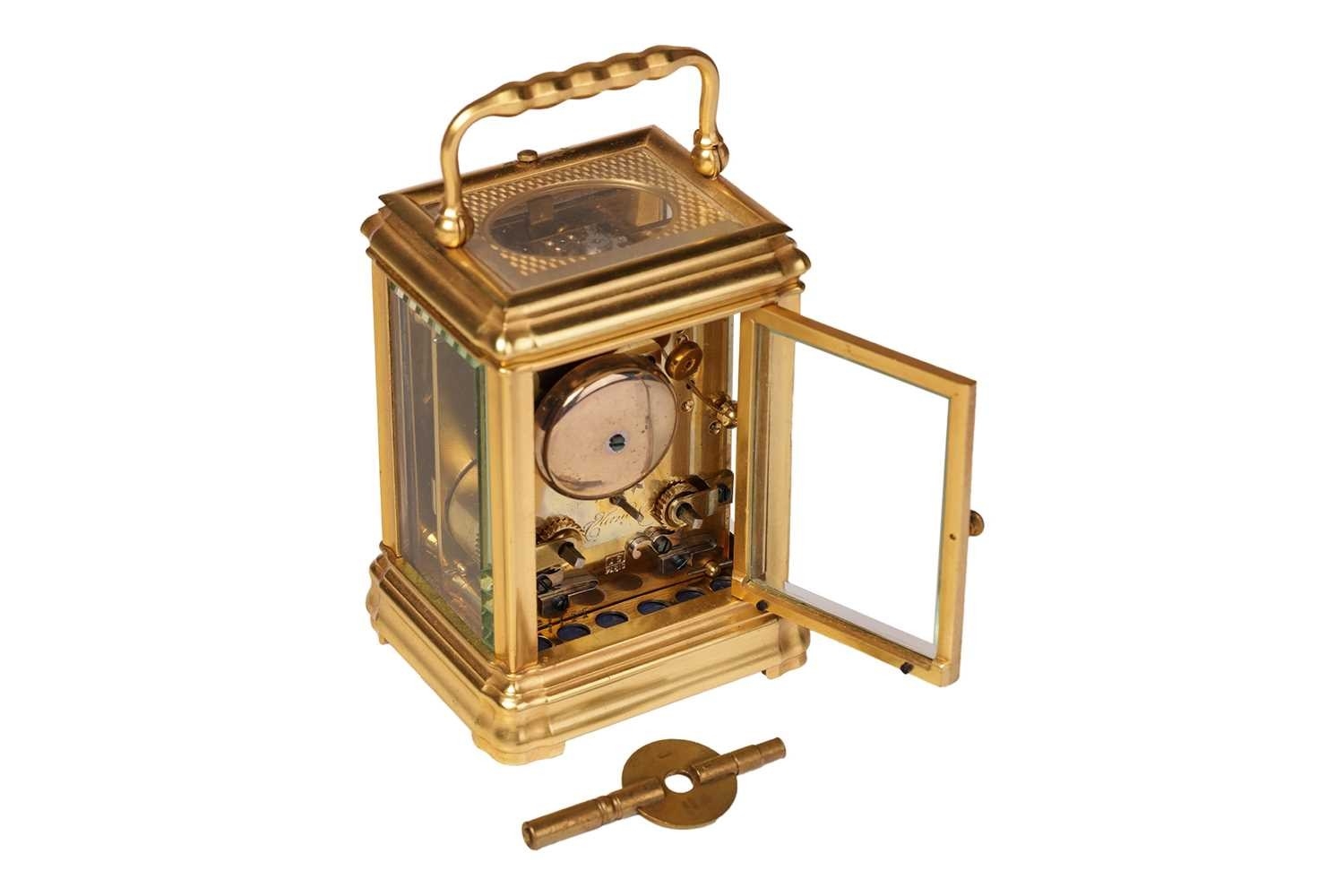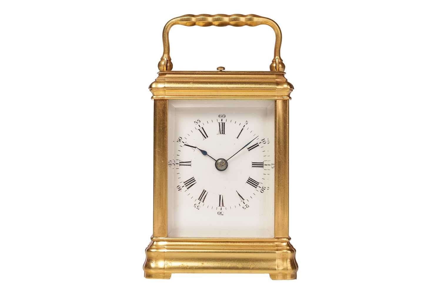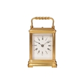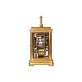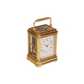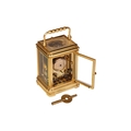 A small Gorge cased 8-day hour repeating carriage clock, with a simple moulded gilt brass case, fitted with a one-piece enamel Roman dial, the movement chiming on a single bell and stamped JS, Paris, the movement and case numbered: 1133. Accompanied by a double-ended key, 12.5 cm high (handle up). The chiming train winds, but the going train is wound solid, the repeat activates as expected.. The balance does not move even under agitation. All lenses are free from chips or cracks.