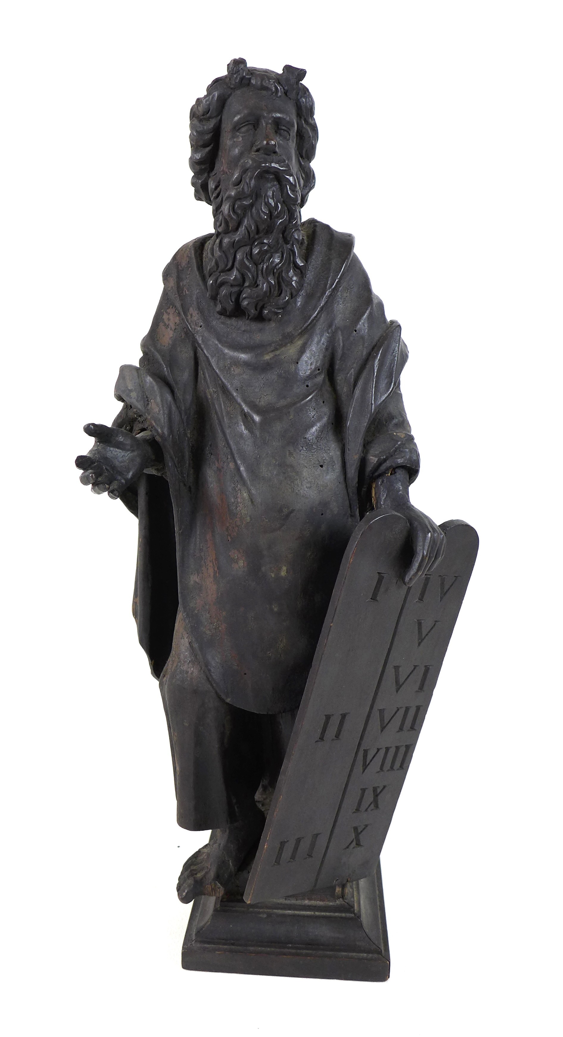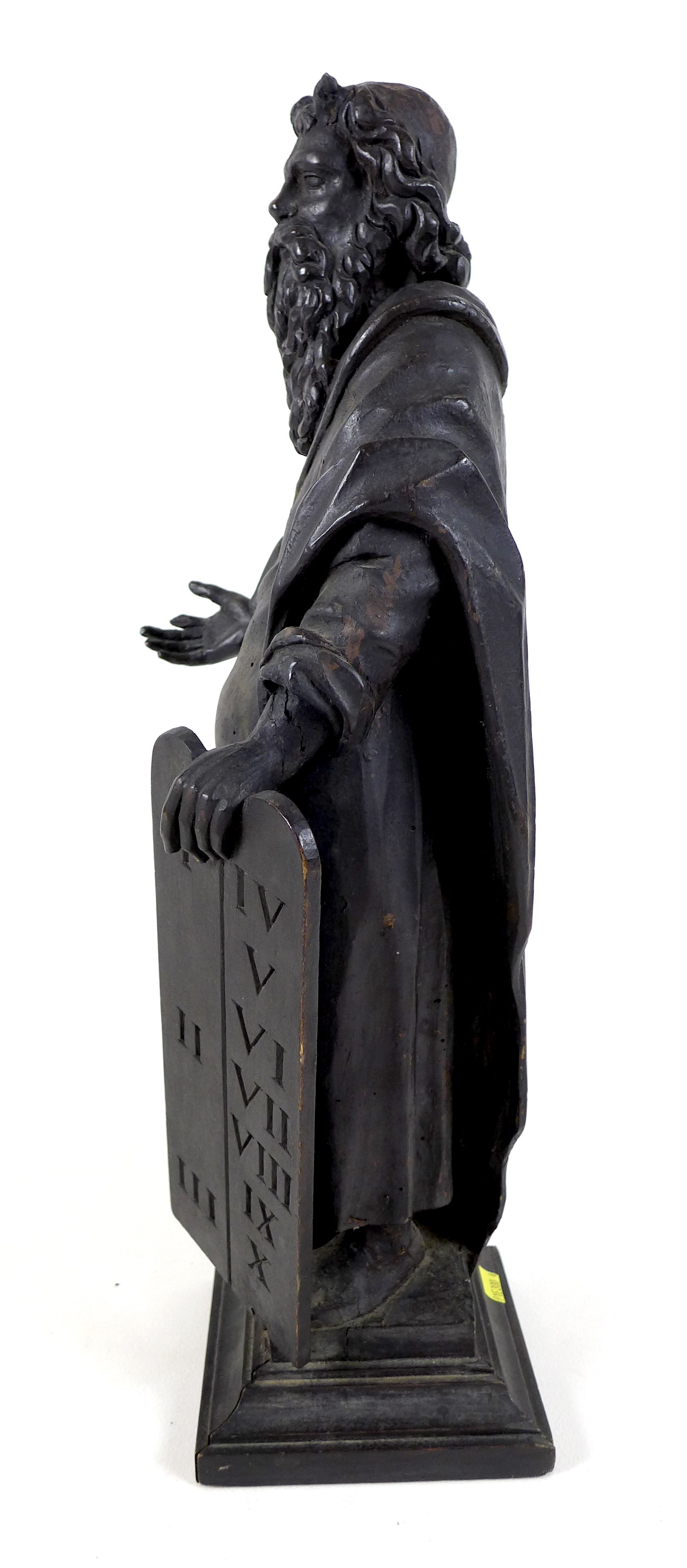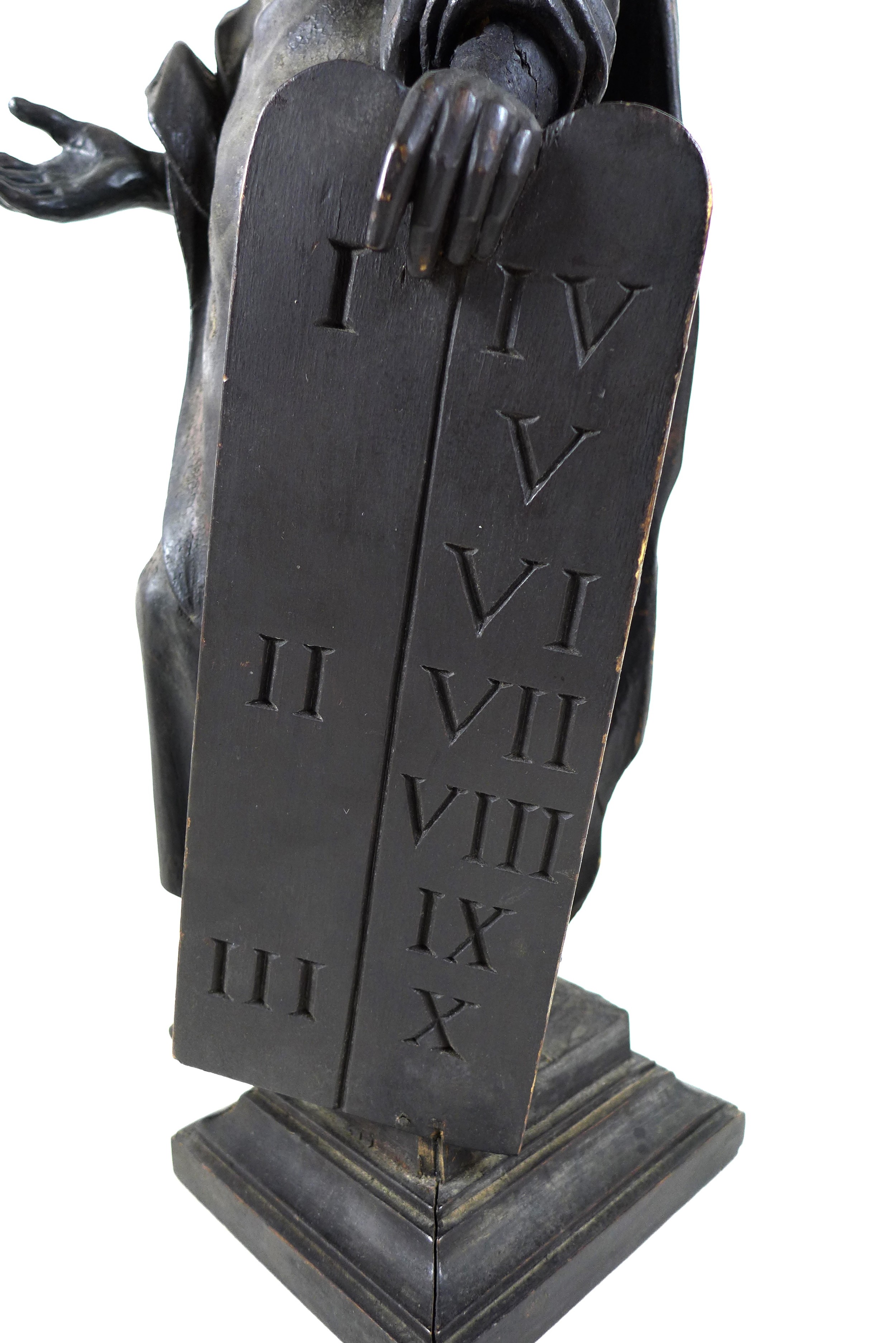 An 18th century carved wooden sculpture of Moses and the Ten Commandments, raised on square plinth, 53cm high.