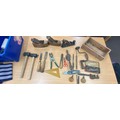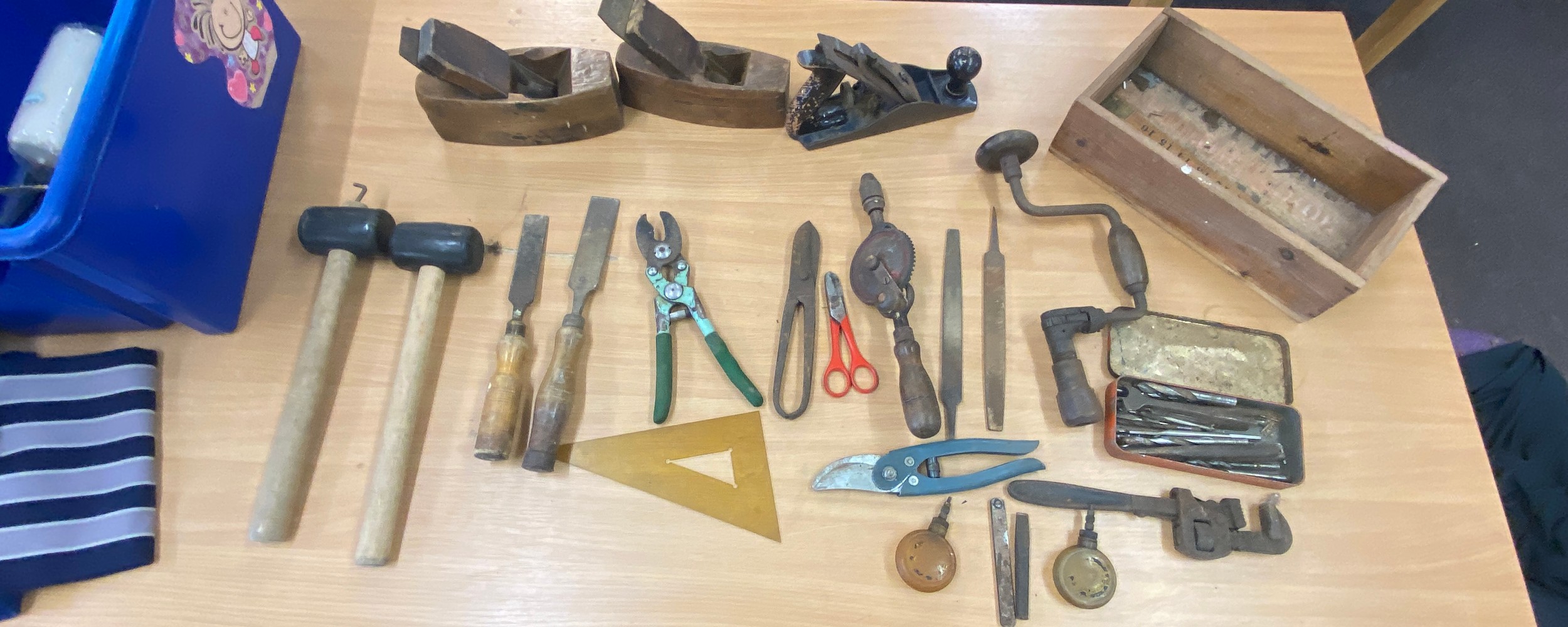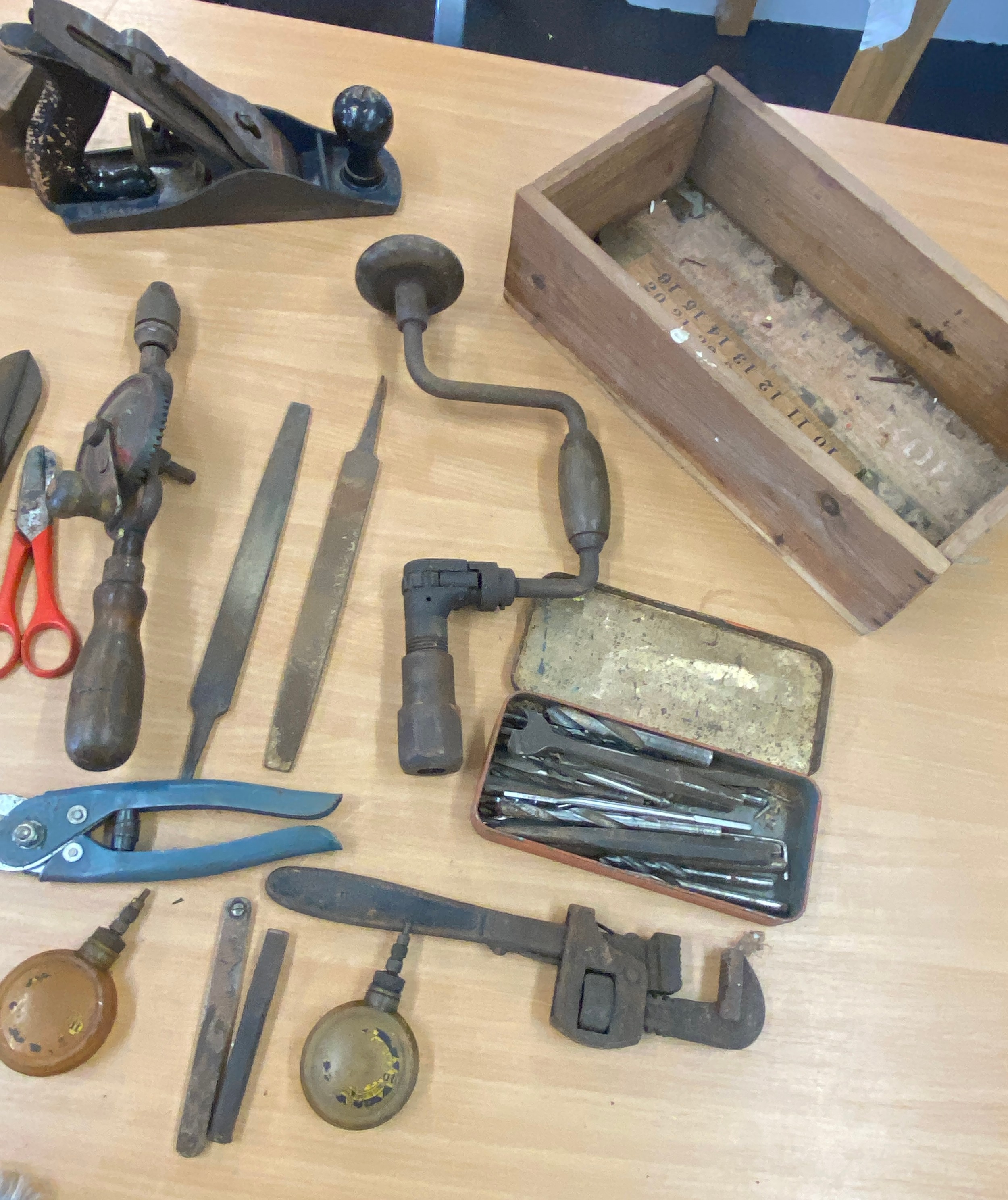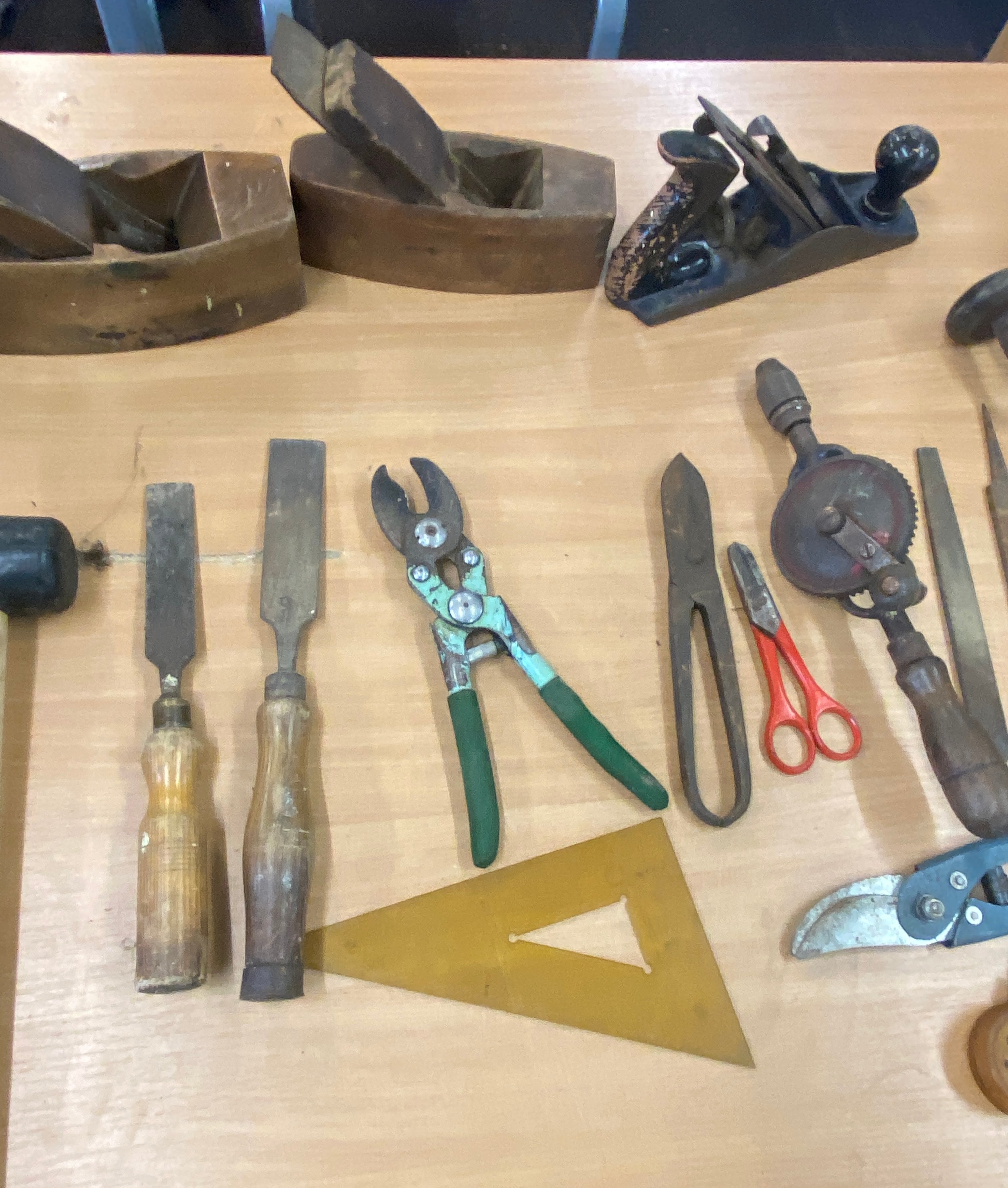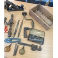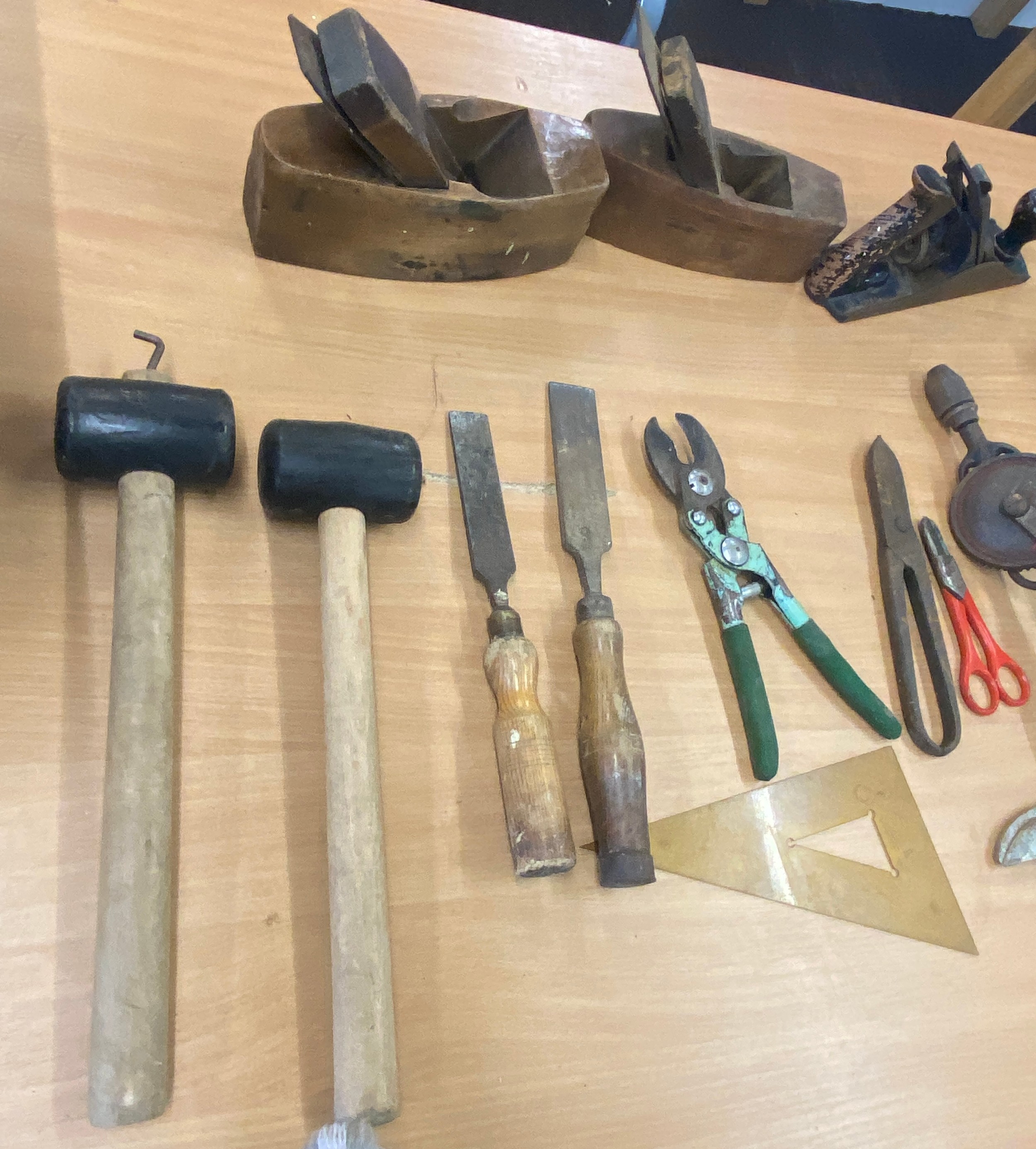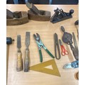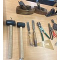 Selection of vintage tools includes wood working planes, hand drills, mallet etc