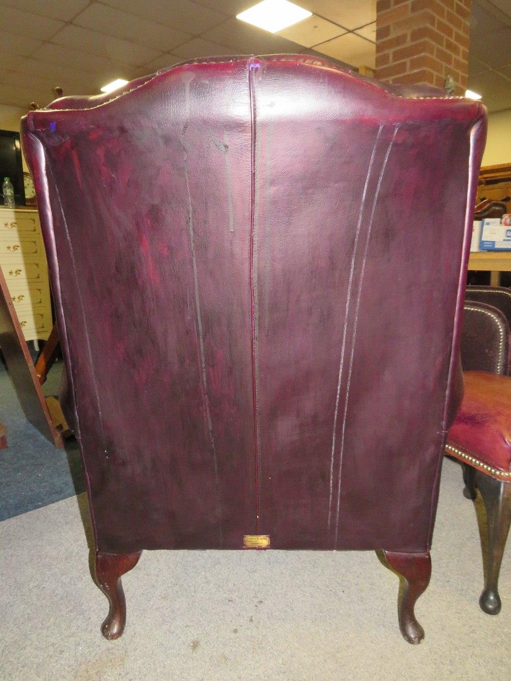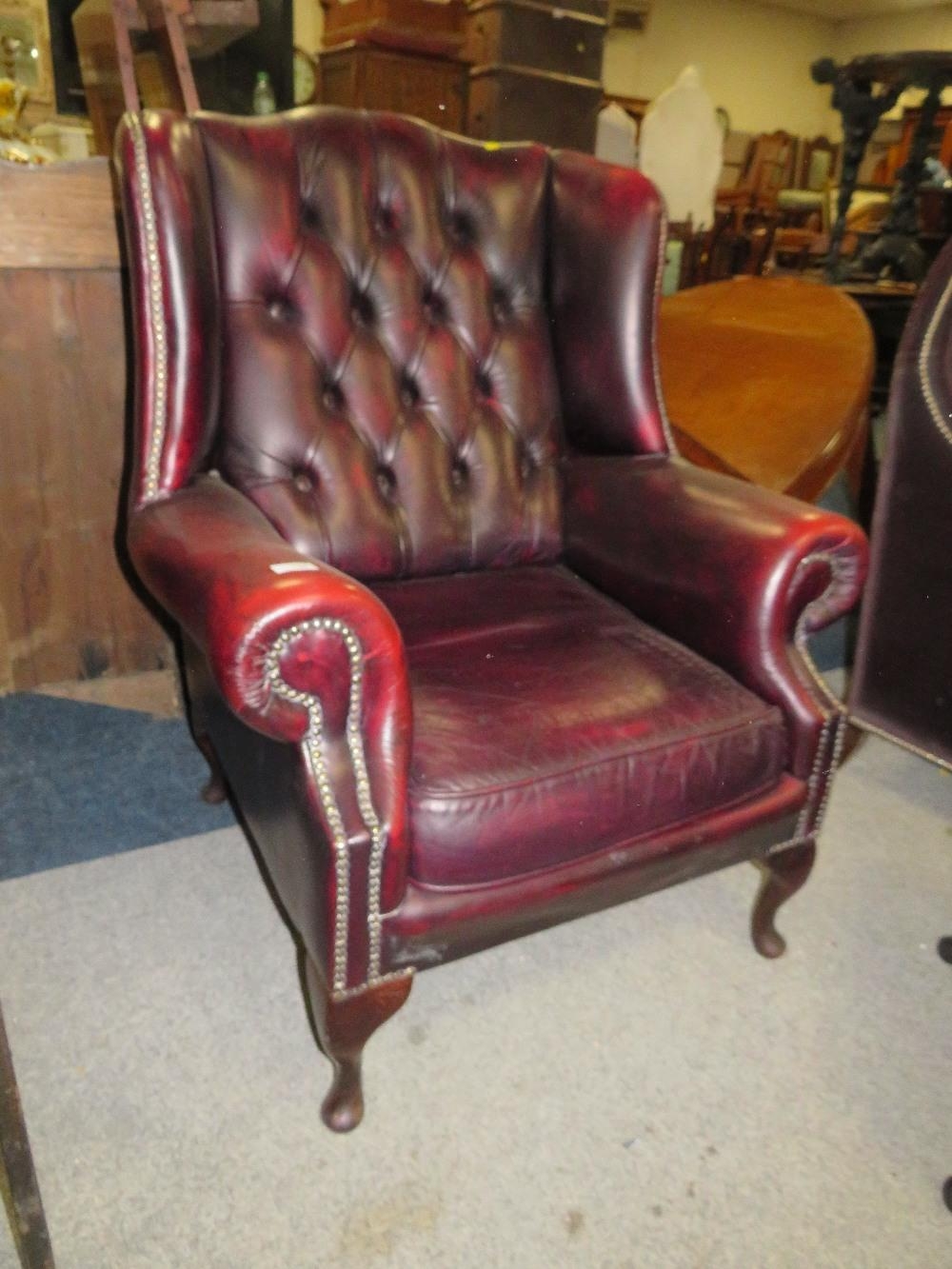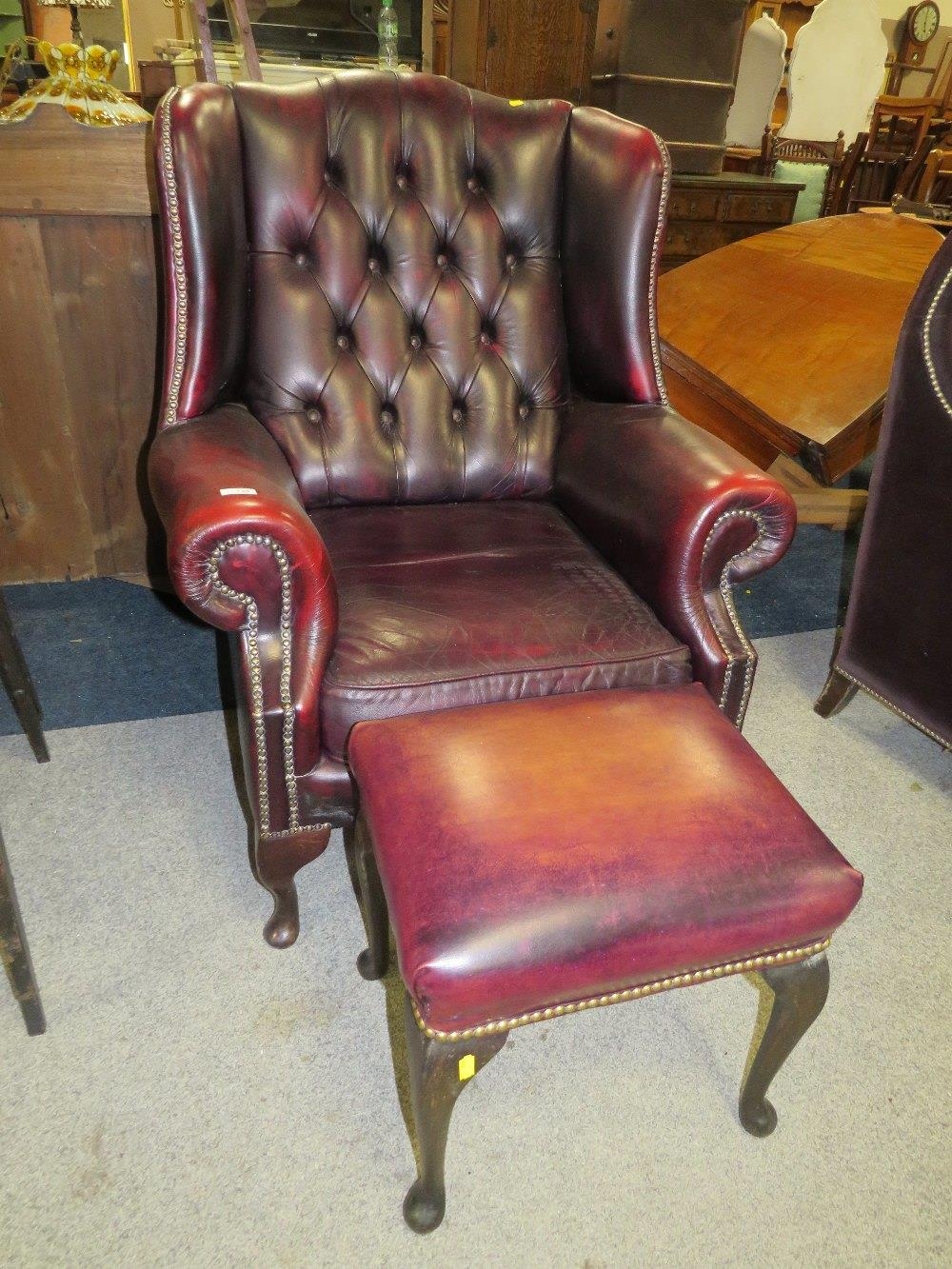 AN OXBLOOD RED LEATHER WINGBACK ARMCHAIR BY MARTIN BARNES LONDON TOGETHER WITH A STOOL