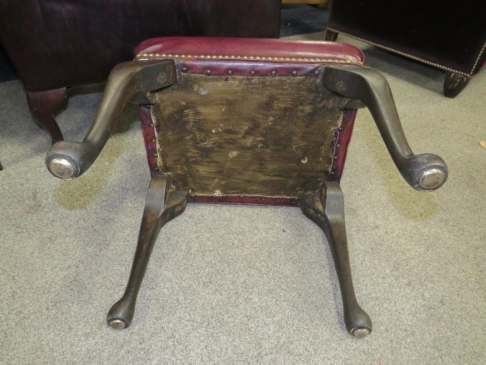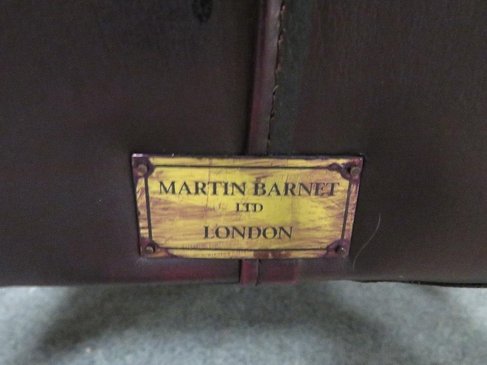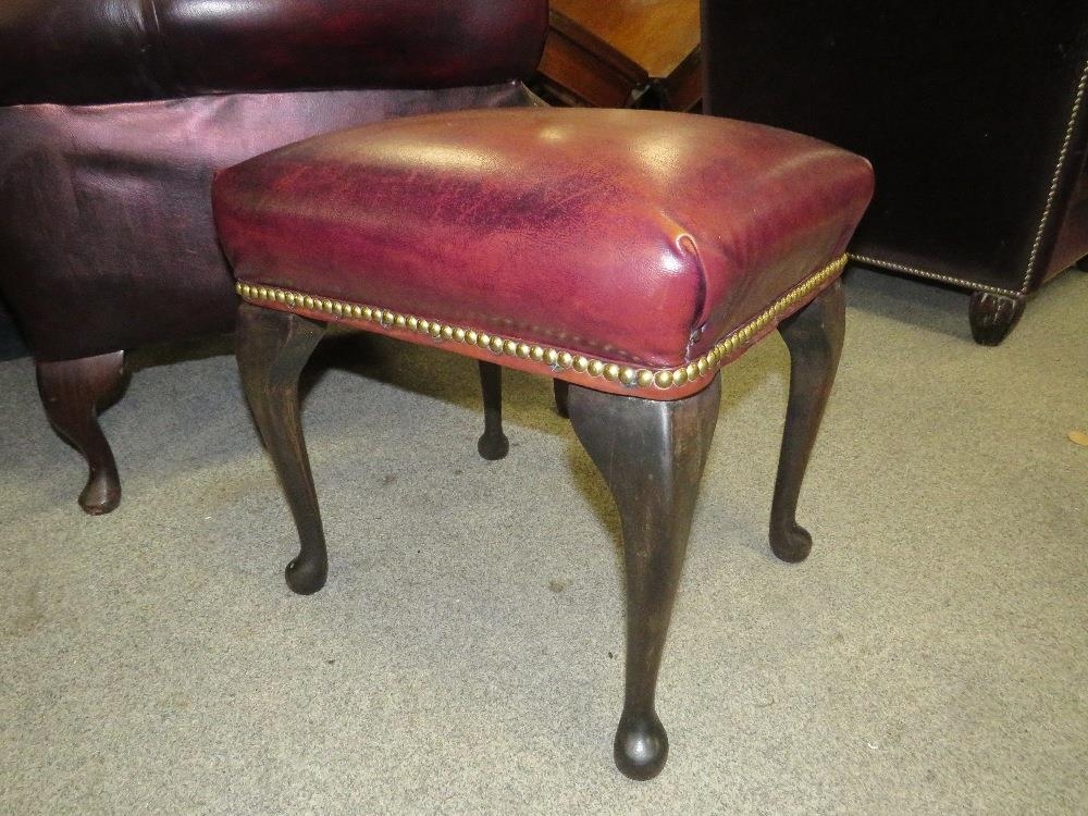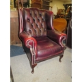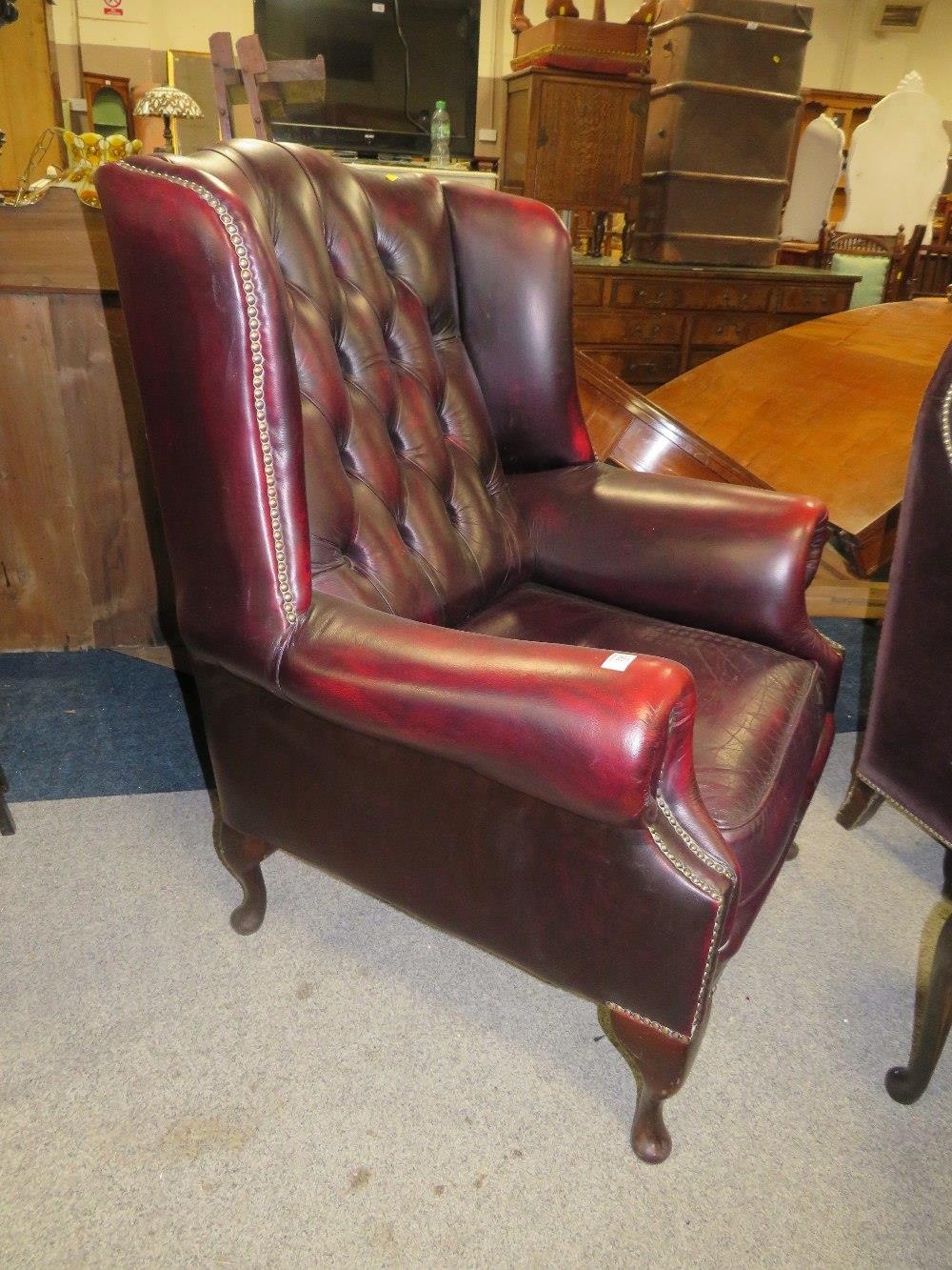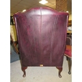 AN OXBLOOD RED LEATHER WINGBACK ARMCHAIR BY MARTIN BARNES LONDON TOGETHER WITH A STOOL