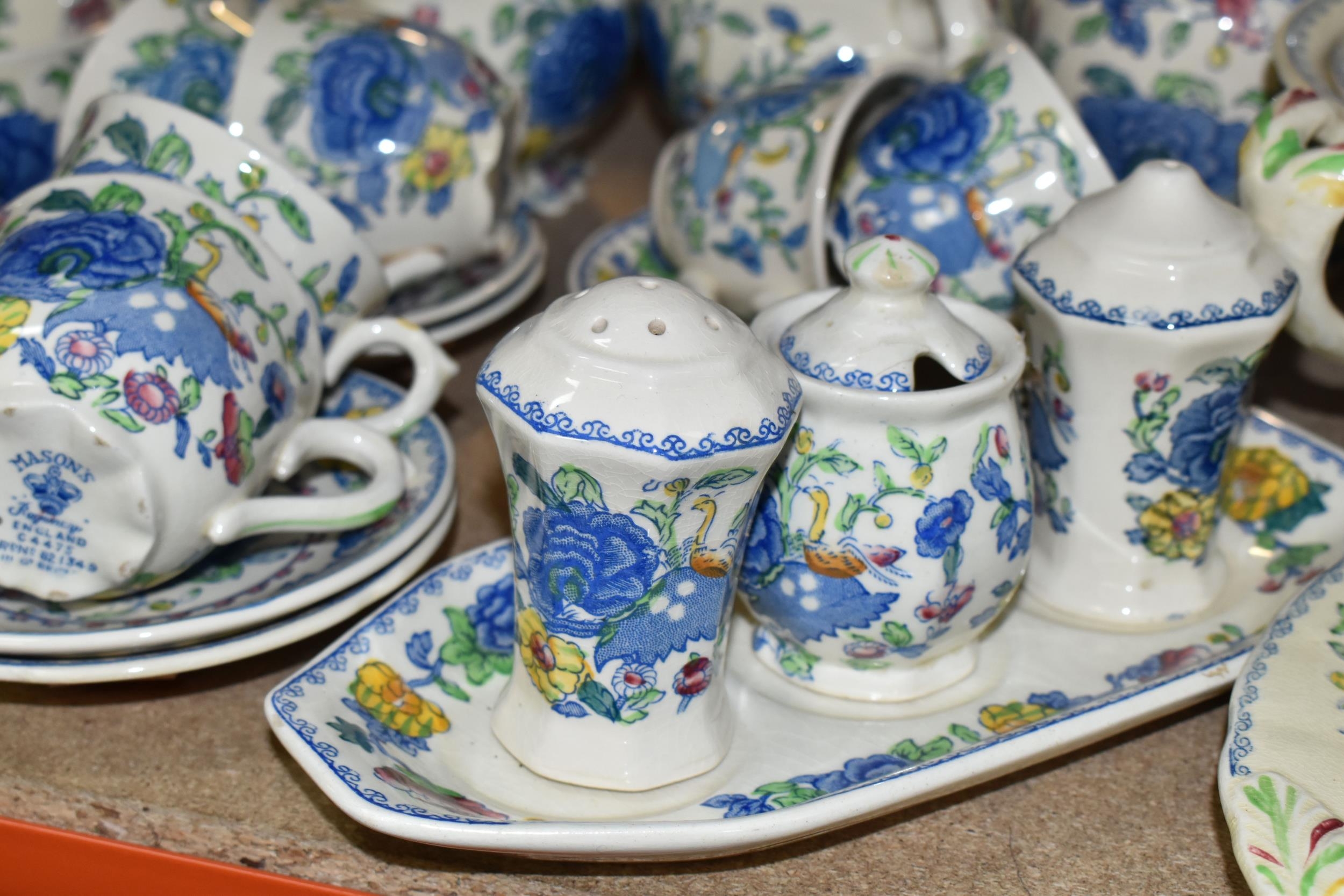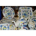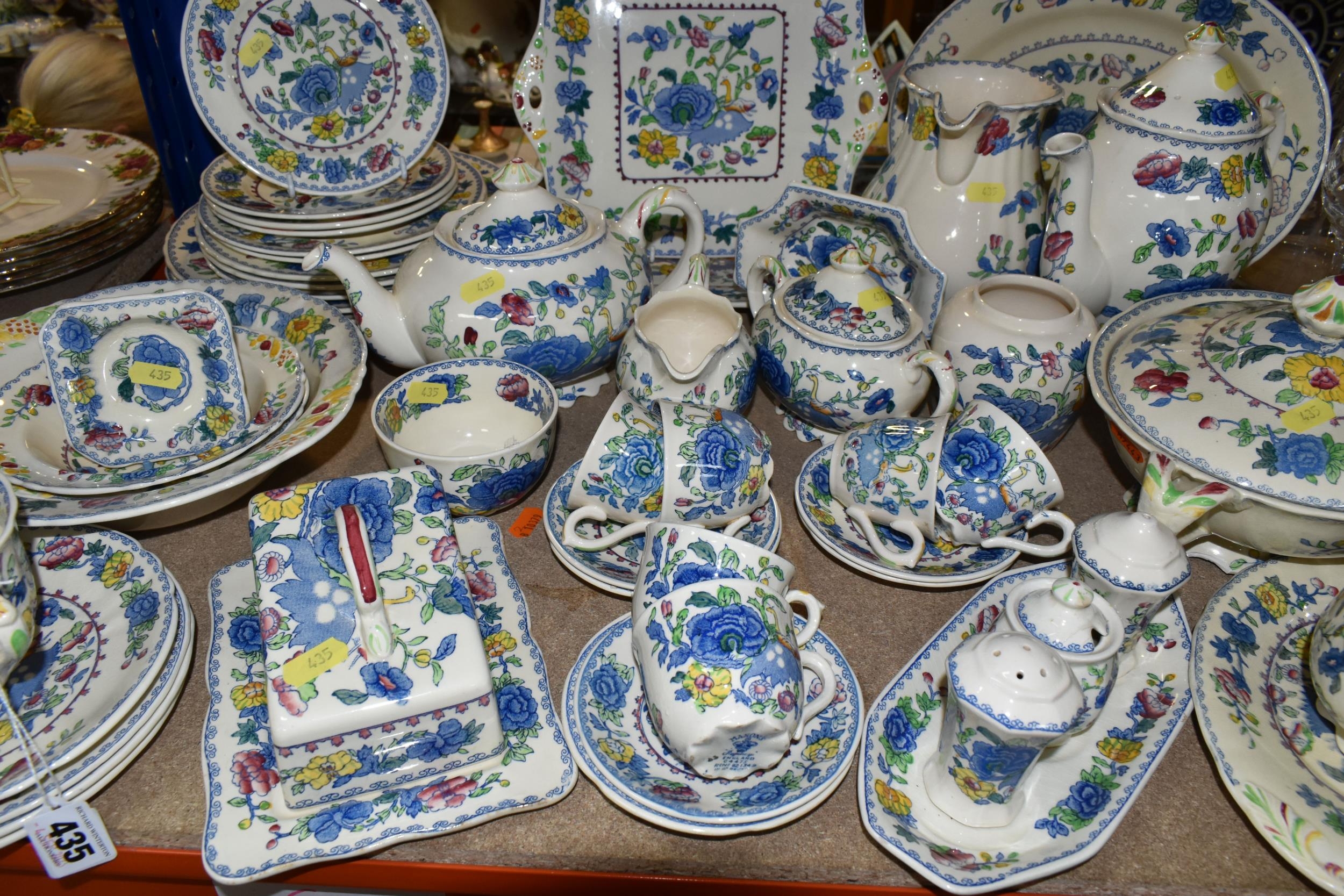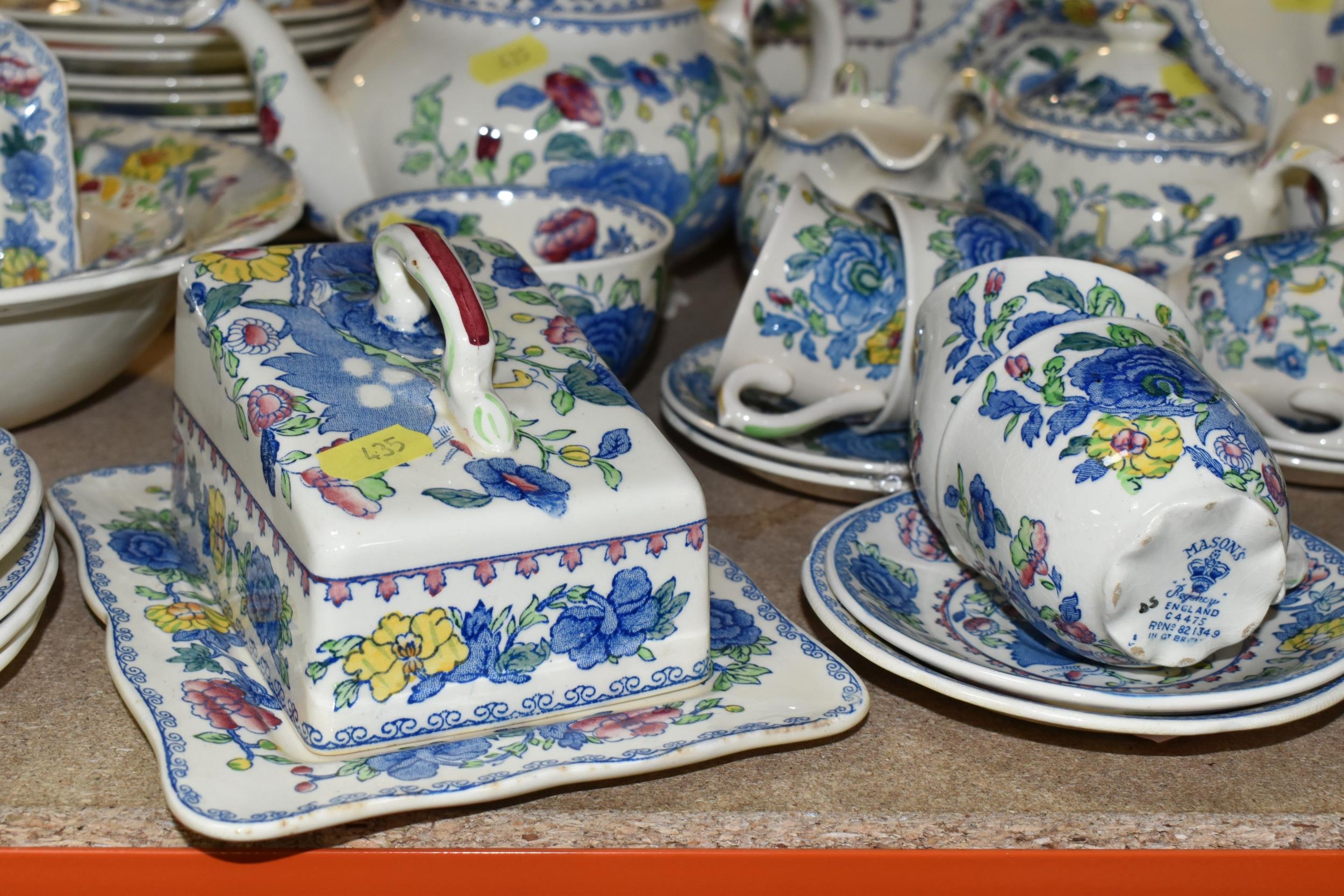 A QUANTITY OF MASON'S 'REGENCY' PATTERNED TEAWARE, comprising one large breakfast cup and saucer, teapot, two square cake plates, covered cheese dish (some staining to rim of lid), covered sugar bowl, milk jug, sugar bowl, coffee pot, pitcher (cracked), oval meat plate, covered tureen, gravy/sauce jug, four piece cruet set (mustard pot lid is cracked), dessert serving bowl and two dessert dishes, ashtray, vase, trinket dish, small oval plate, four dinner plates, three side plates, two salad plates, seven tea plates, six coffee cups, six saucers (52) (Condition Report: crazing to most pieces in varying degrees, obvious damage mentioned in description)
