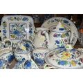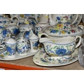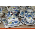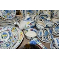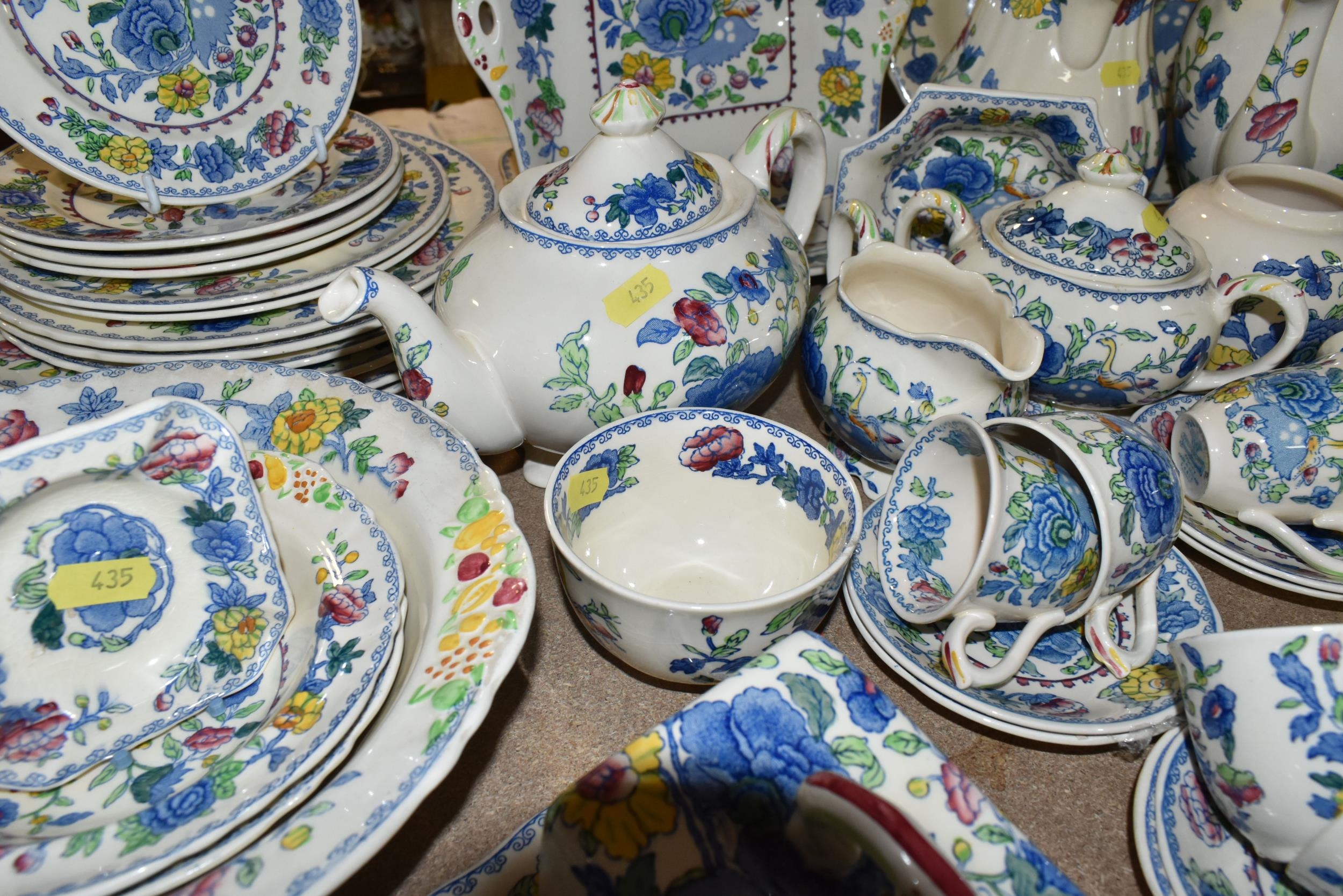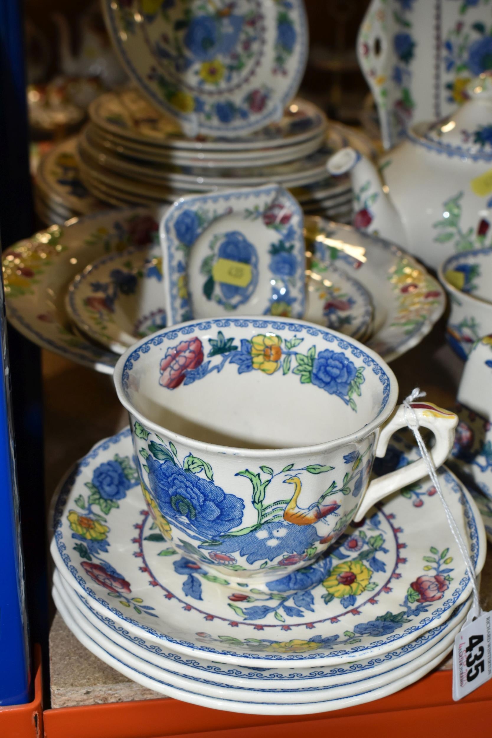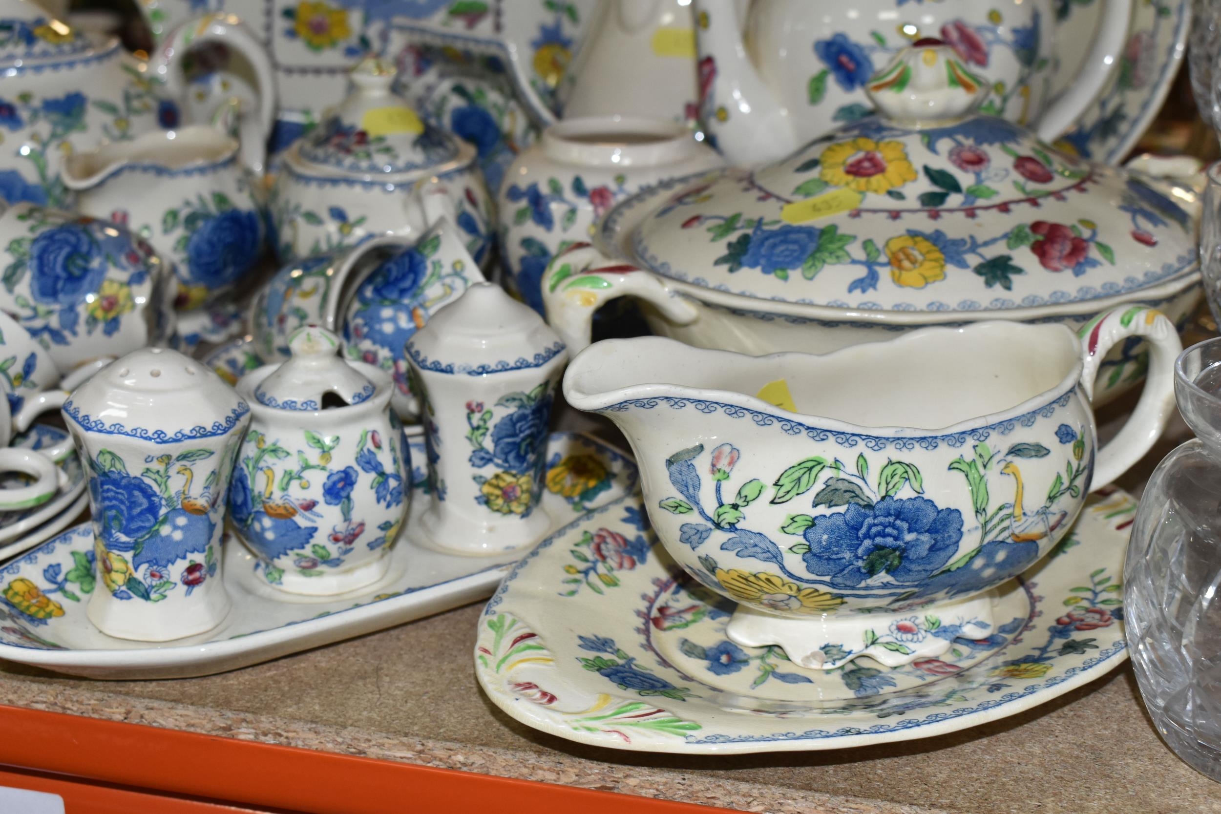 A QUANTITY OF MASON'S 'REGENCY' PATTERNED TEAWARE, comprising one large breakfast cup and saucer, teapot, two square cake plates, covered cheese dish (some staining to rim of lid), covered sugar bowl, milk jug, sugar bowl, coffee pot, pitcher (cracked), oval meat plate, covered tureen, gravy/sauce jug, four piece cruet set (mustard pot lid is cracked), dessert serving bowl and two dessert dishes, ashtray, vase, trinket dish, small oval plate, four dinner plates, three side plates, two salad plates, seven tea plates, six coffee cups, six saucers (52) (Condition Report: crazing to most pieces in varying degrees, obvious damage mentioned in description)
