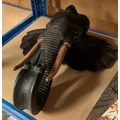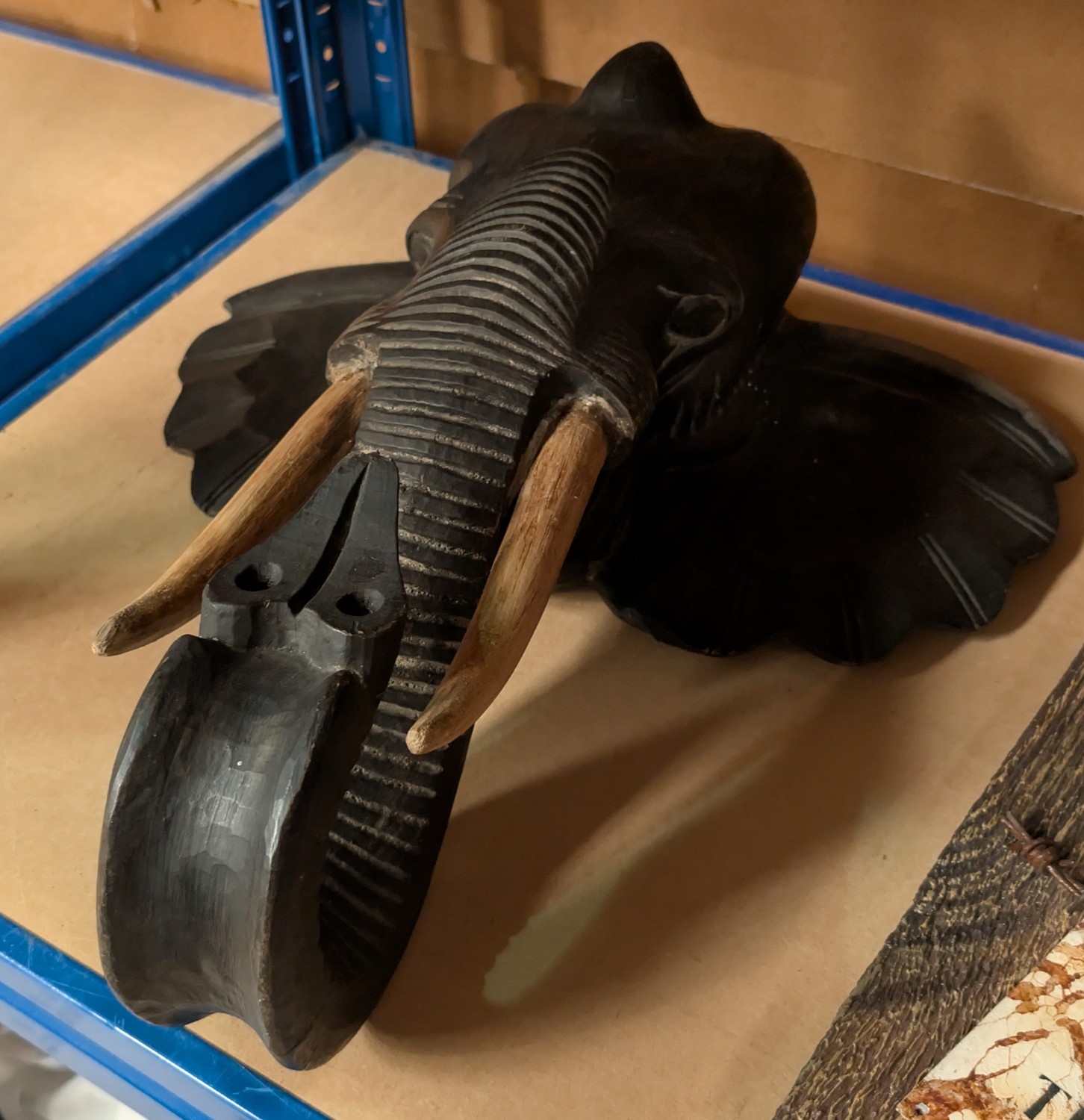 A carved wooden wall hanging elephant head