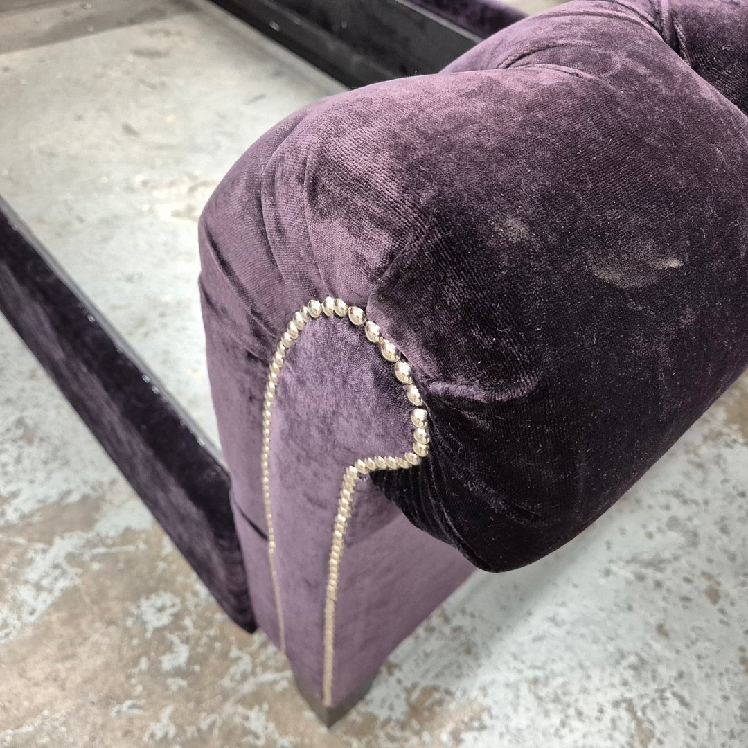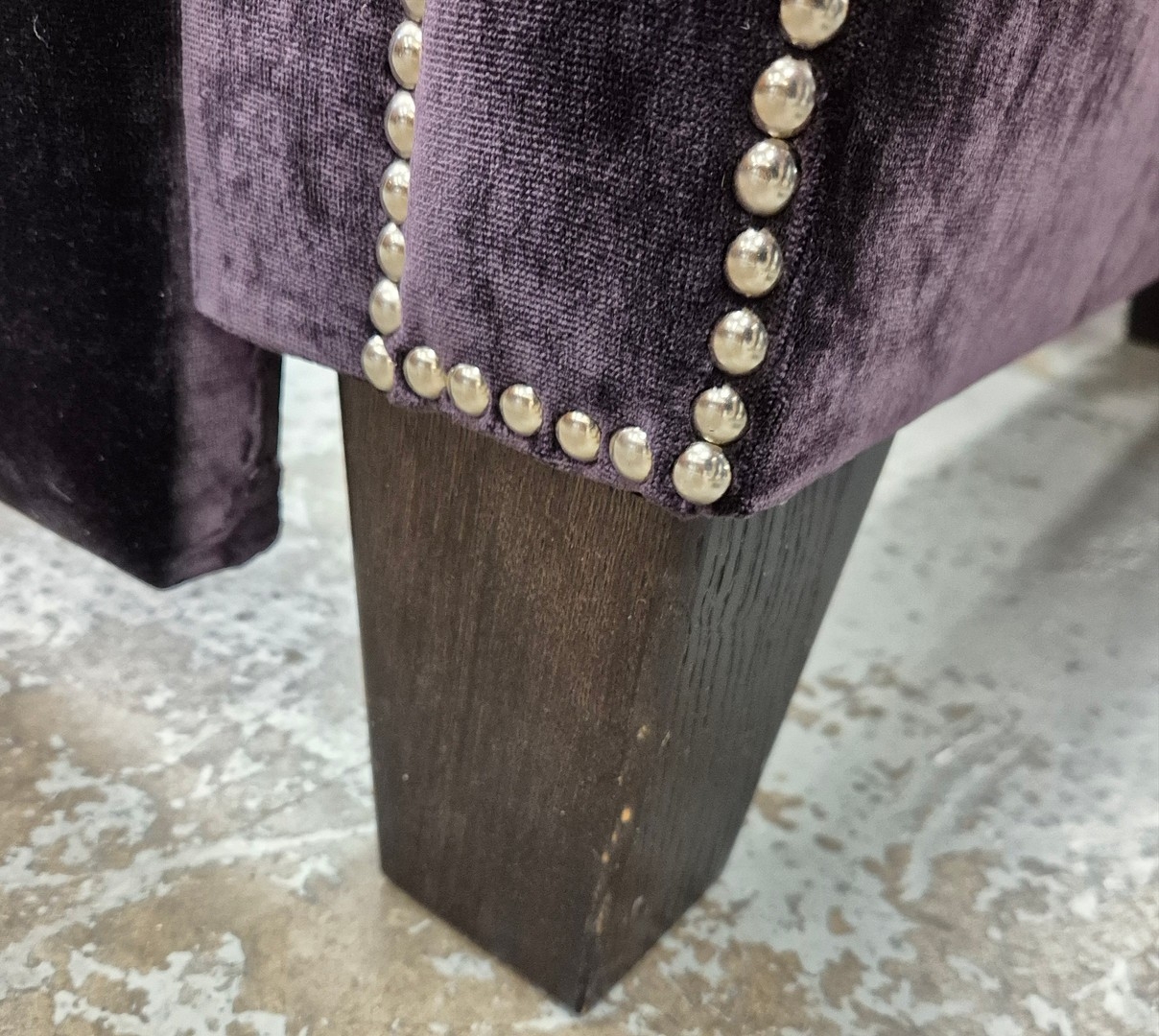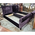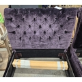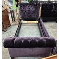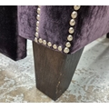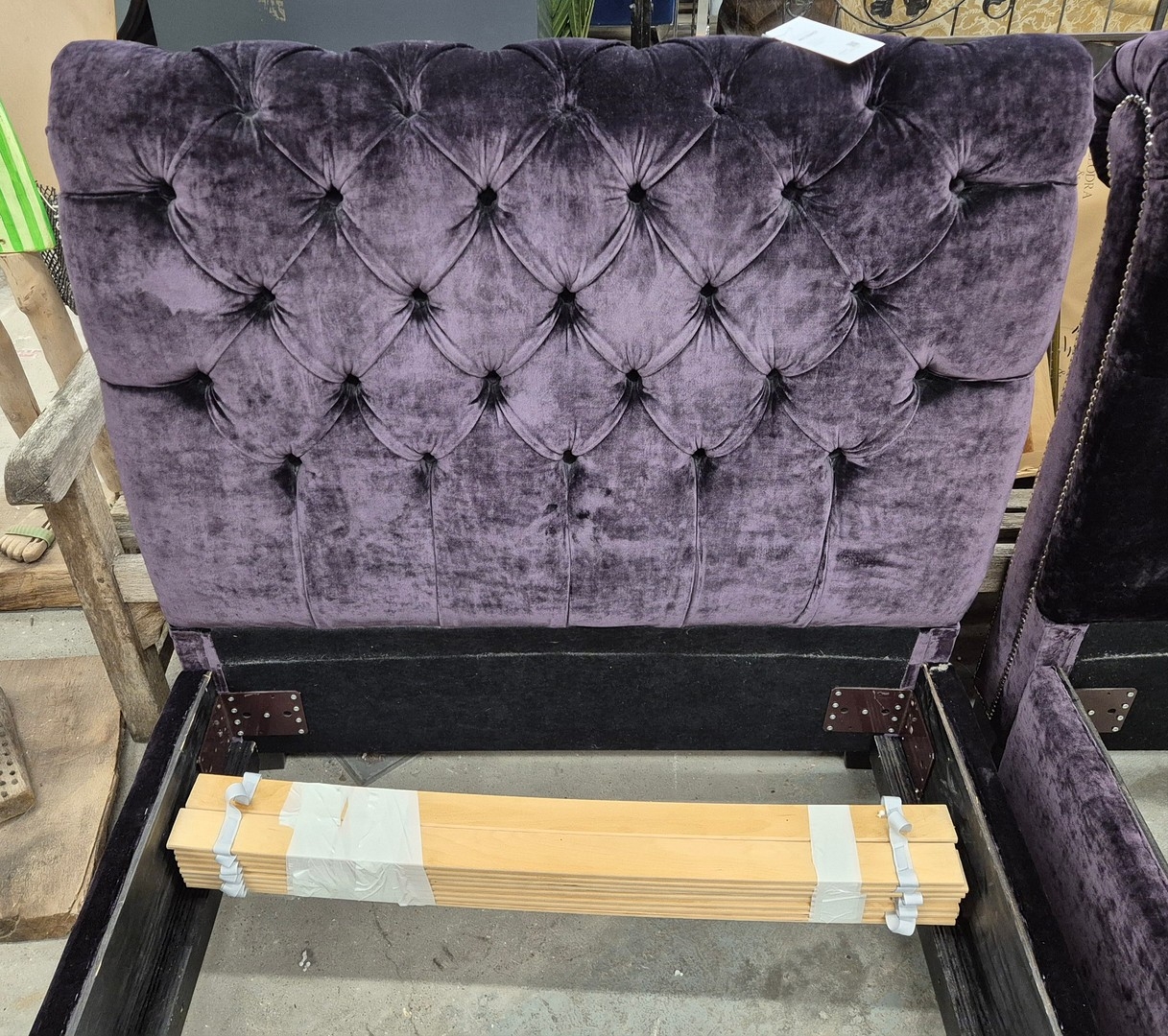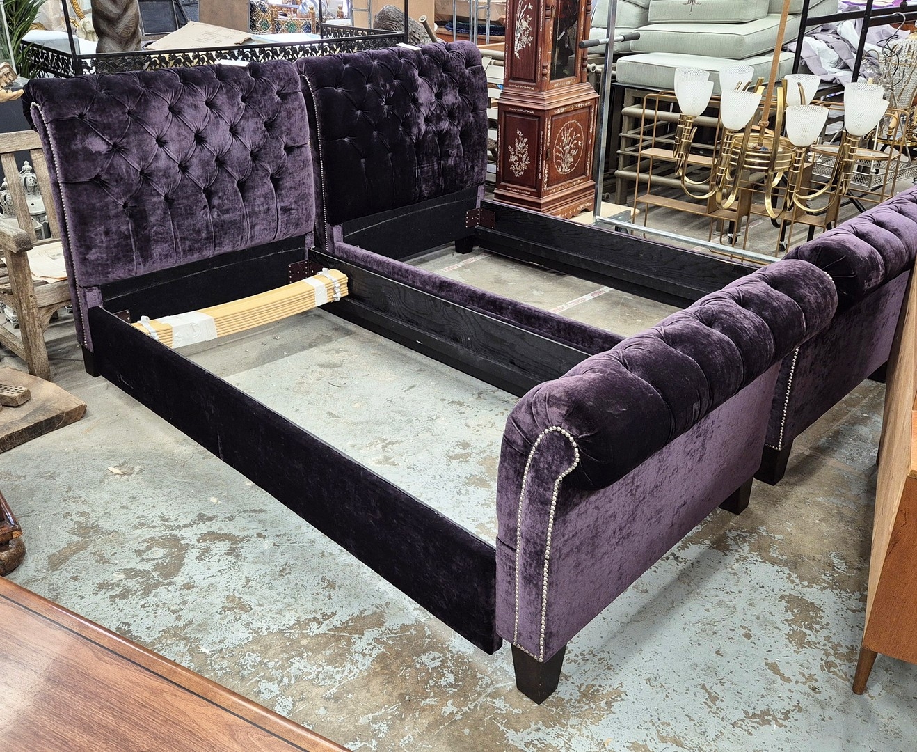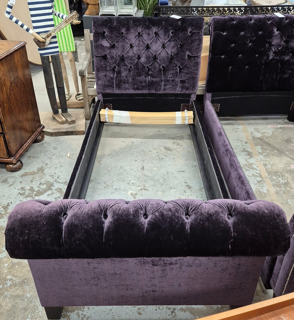 PAIR OF SINGLE BED FRAMES. in buttoned purple velvet each 100cm w x 105cm t.