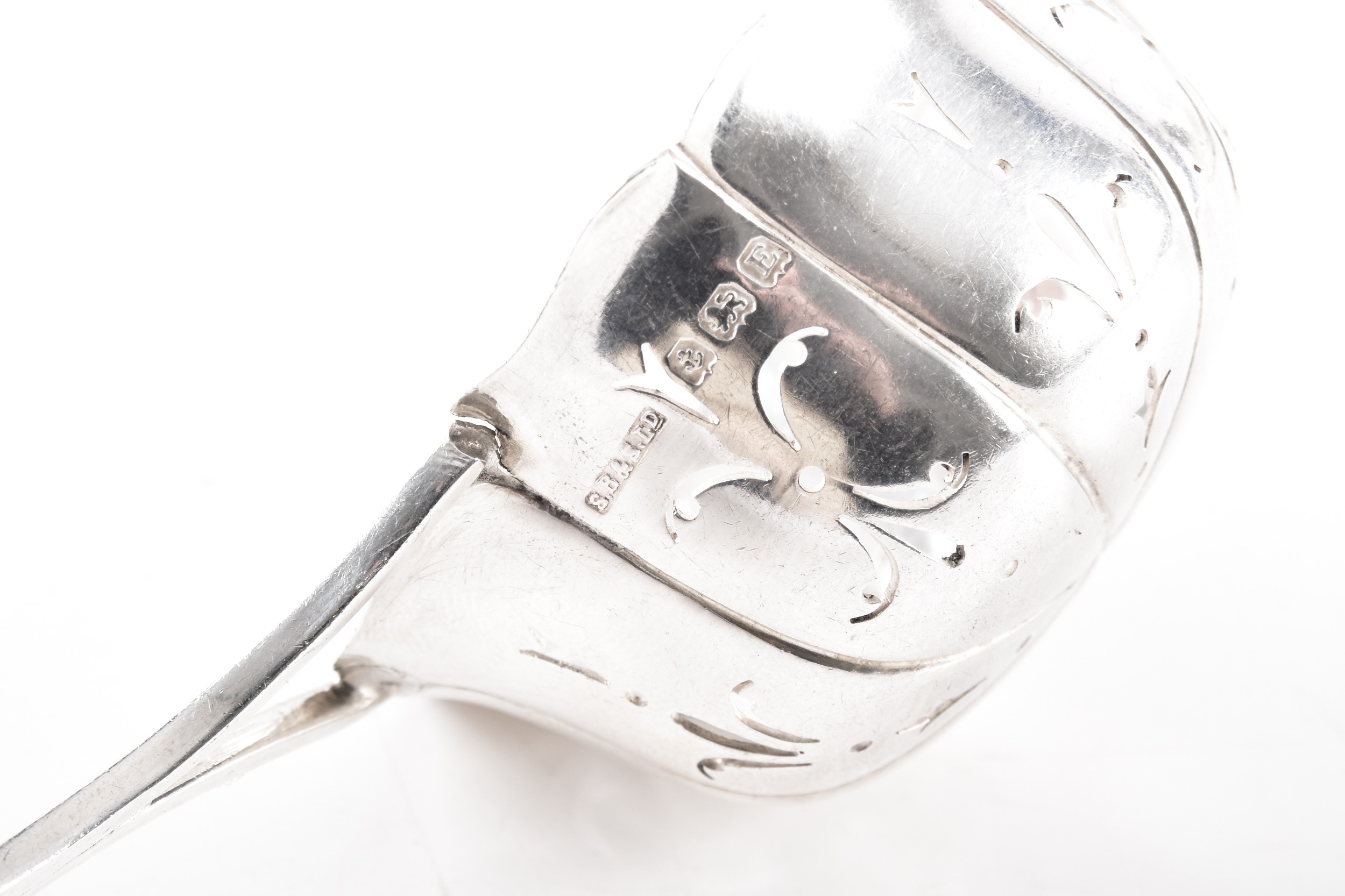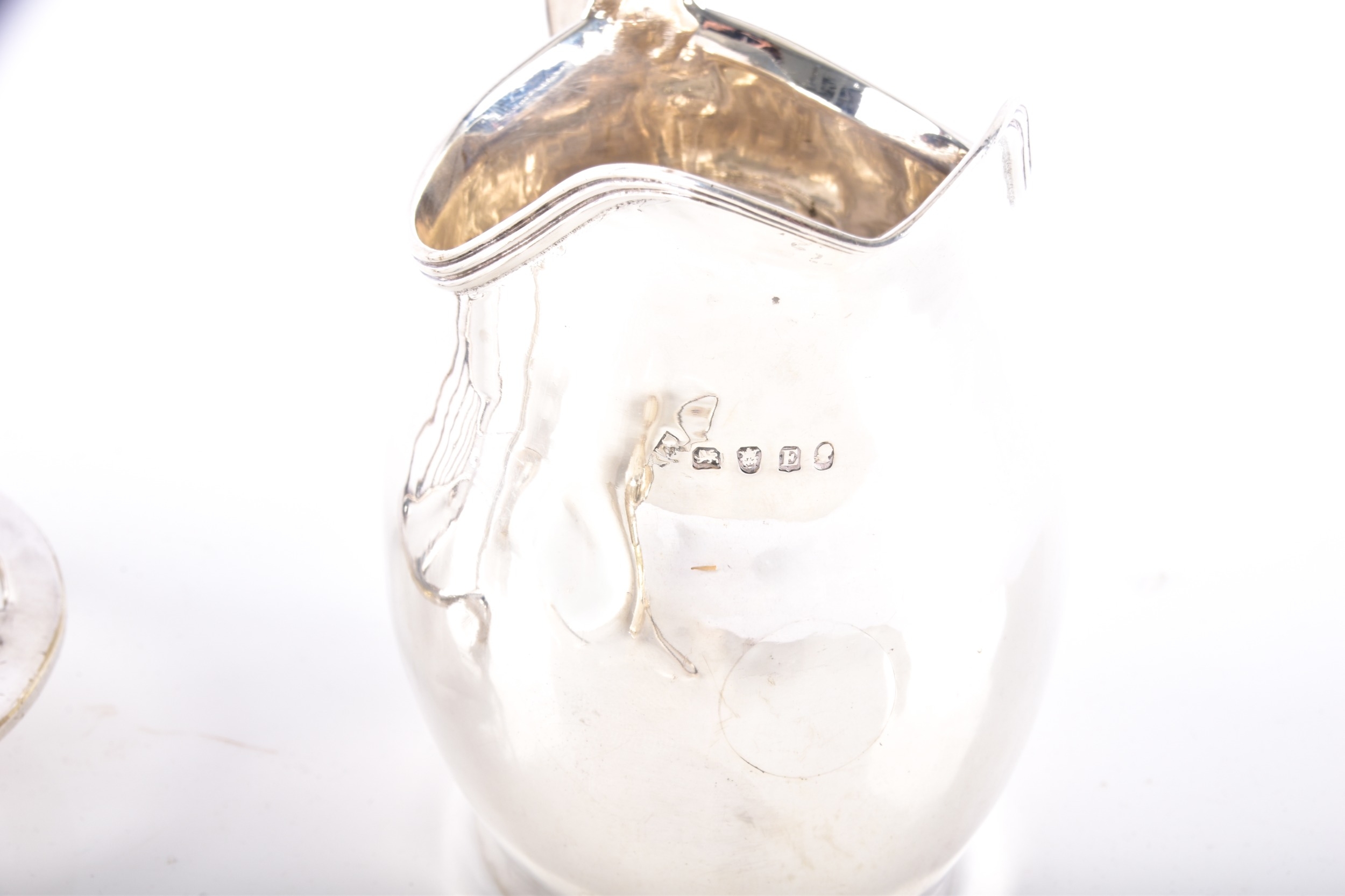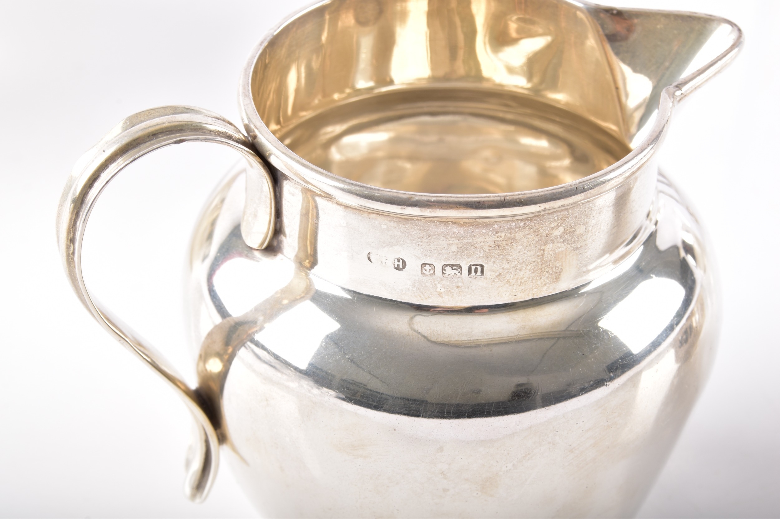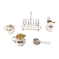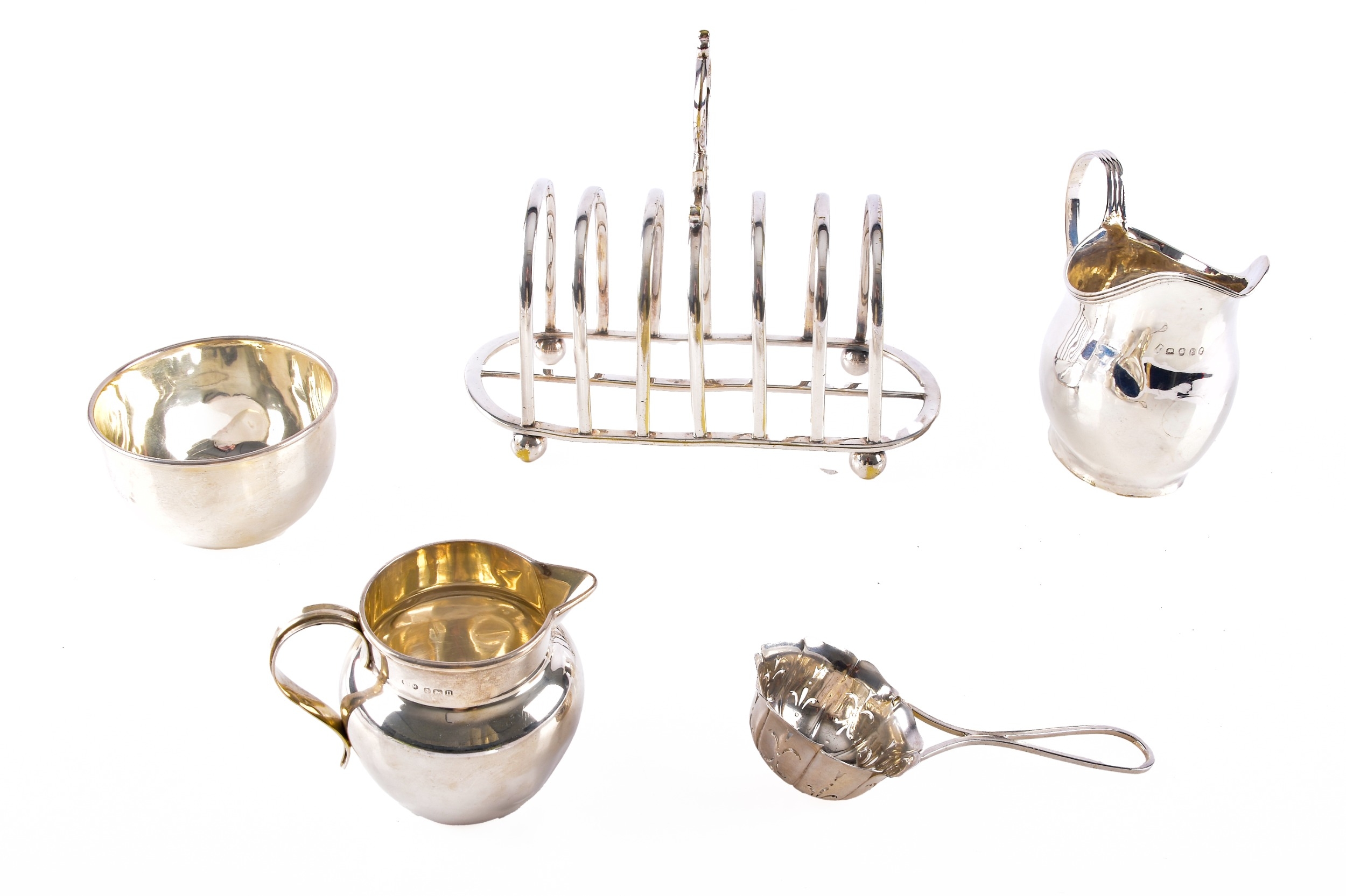 A George V silver creamer hallmarked for Birmingham 1912 by T H Hazlewood & Co, 6.5 cm high, a George III silver milk jug hallmarked for 1800, indistinct maker's mark, 10 cm high, a George V silver tea strainer, hallmarked for Birmingham 1929 by S Blanckensee & Son Ltd, a 925 sterling sugar bowl, name and date engraved for 1939, 5 cm high, together with a silver plated toast rack and teapot. (5)