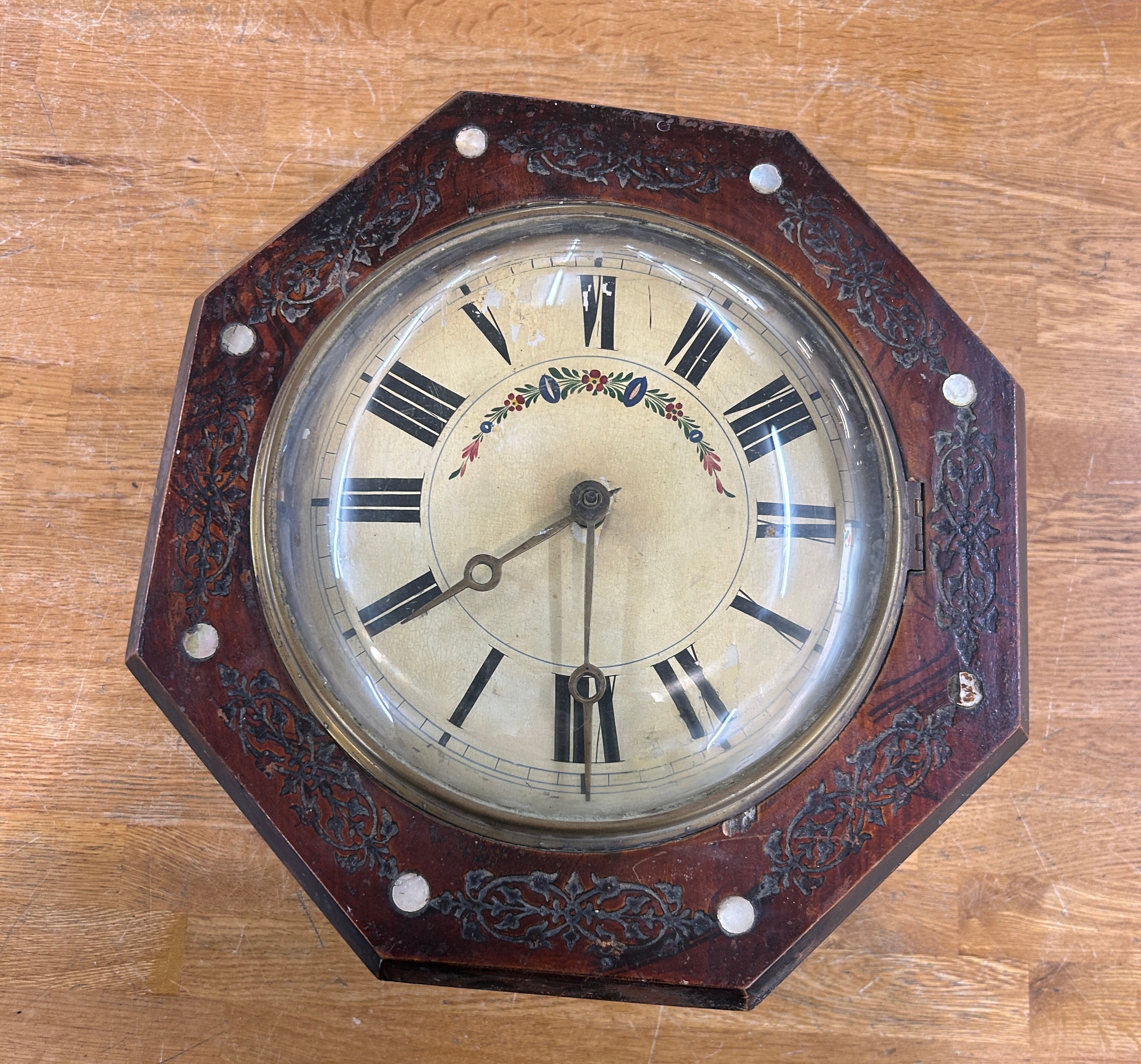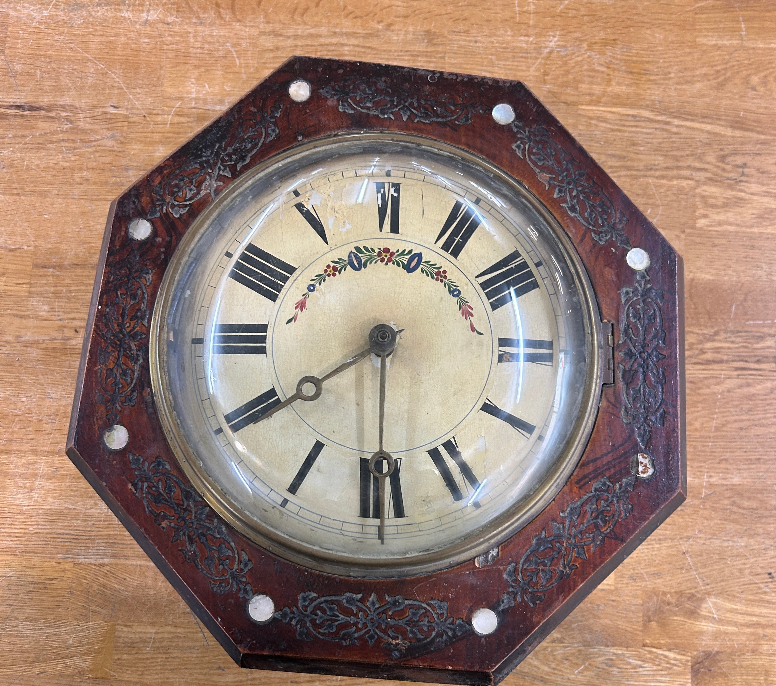 19th Century ' Wag on The Wall' clock measures approximately: 13 inches tall x 13 inches wide, as found not complete
