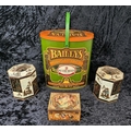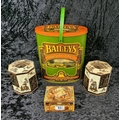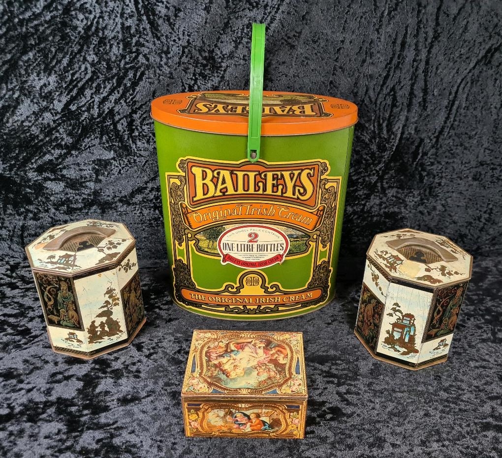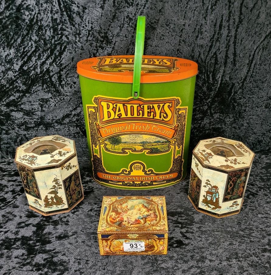 Selection of vintage tins including a 1970s Baileys Original Irish Cream advertising tin bucket with plastic handle.