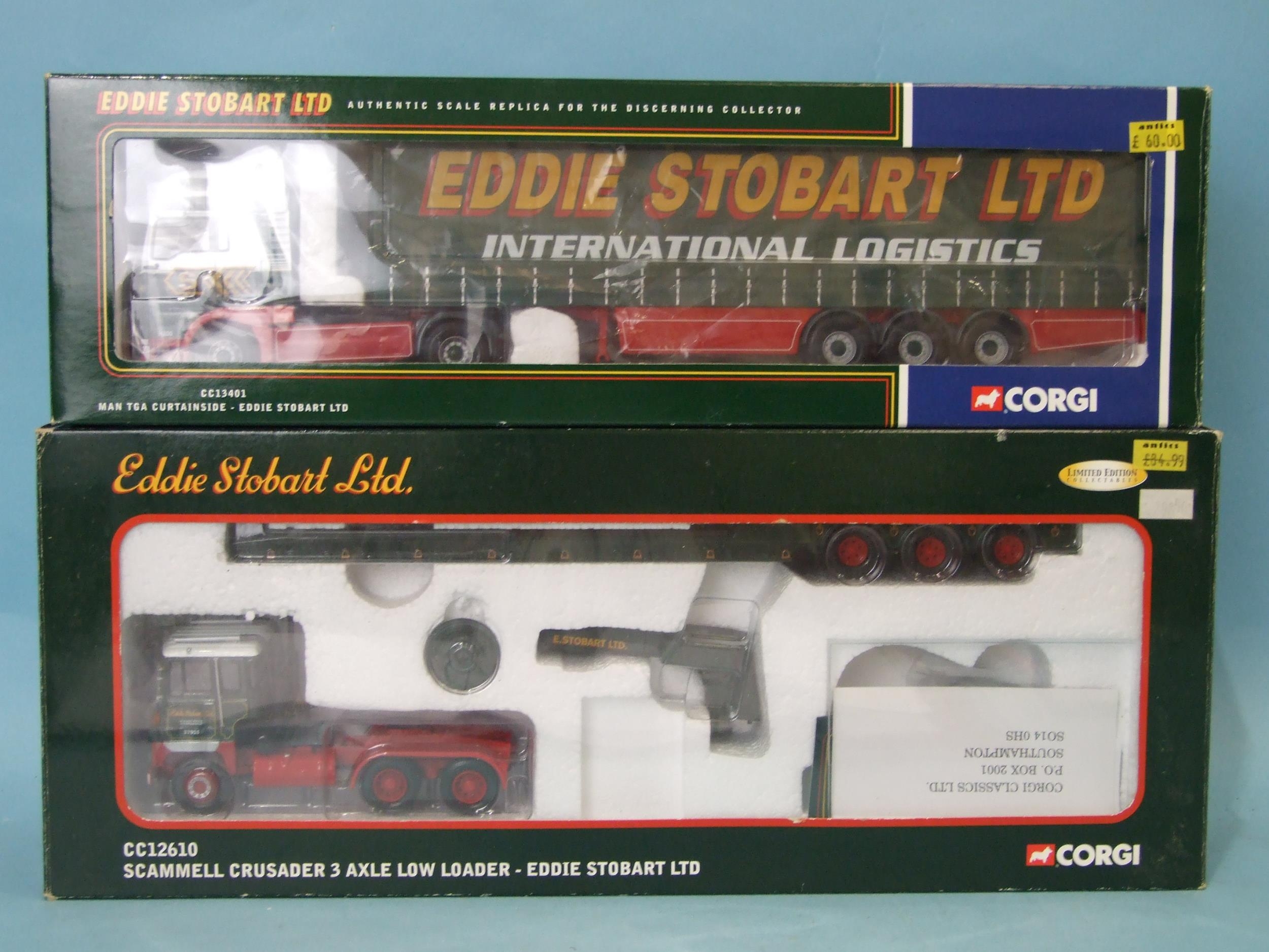 Corgi, CC12610 Scammell Crusader 3-axle Loader and CC13401 Man TGA Curtainside, both "Eddie Stobart Ltd", boxed, (2).