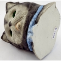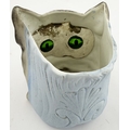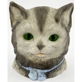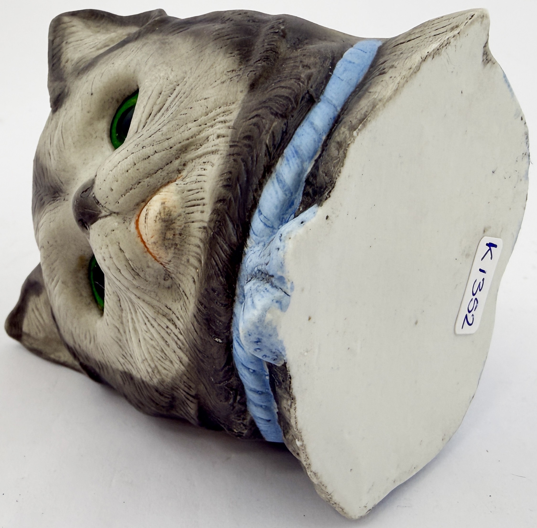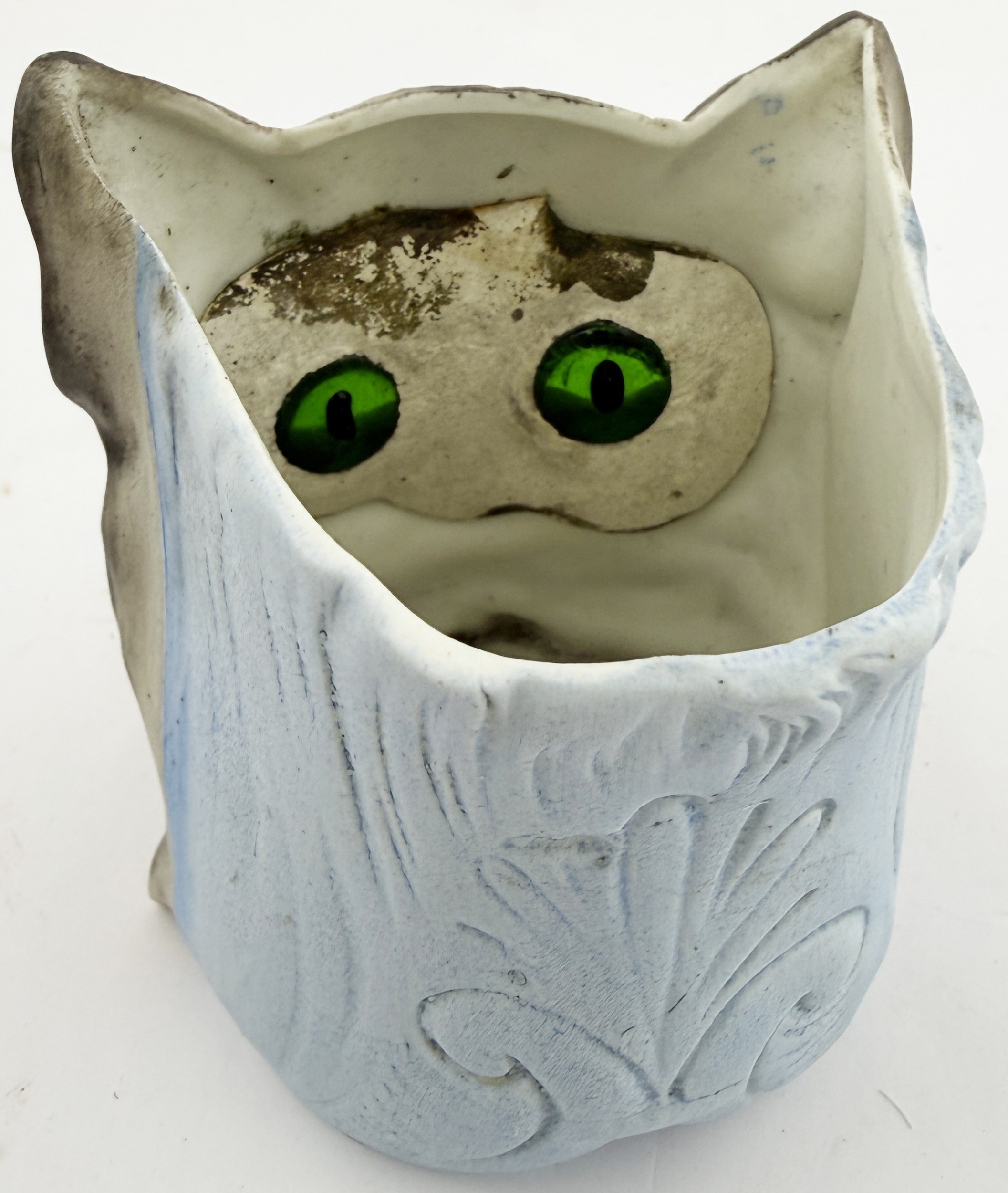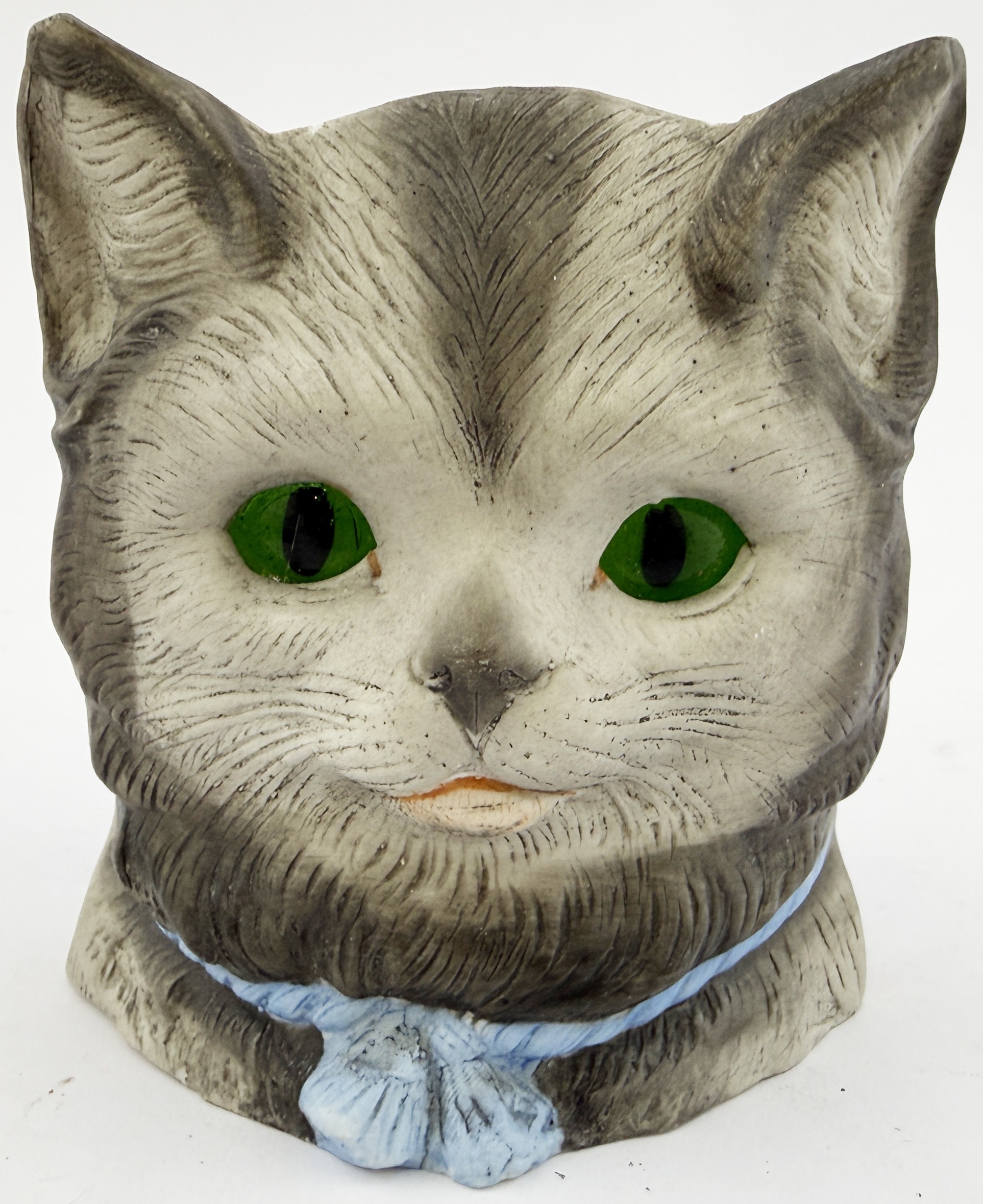 CAT NIGHT LIGHT. 3.5ins tall. Bisque nursery night light holder modelled as cat, with inset green glass eyes which would’ve glowed when a candle light was placed within. Probably German manufacture, but unmarked.
