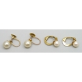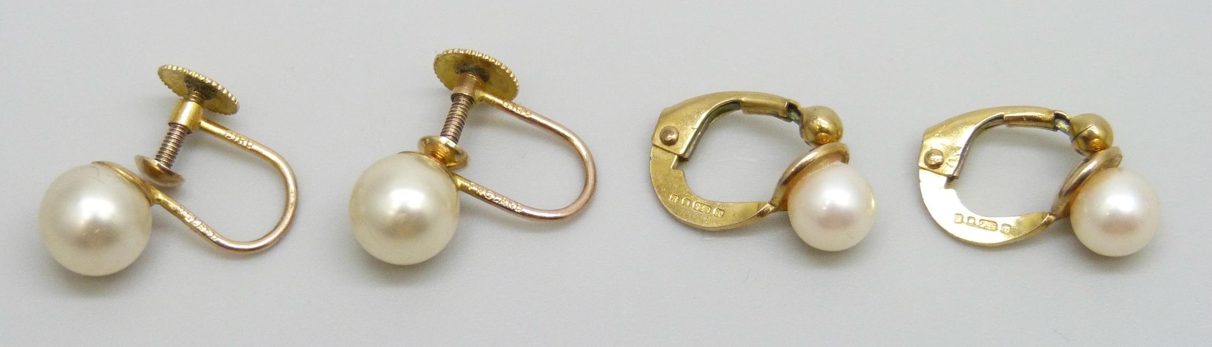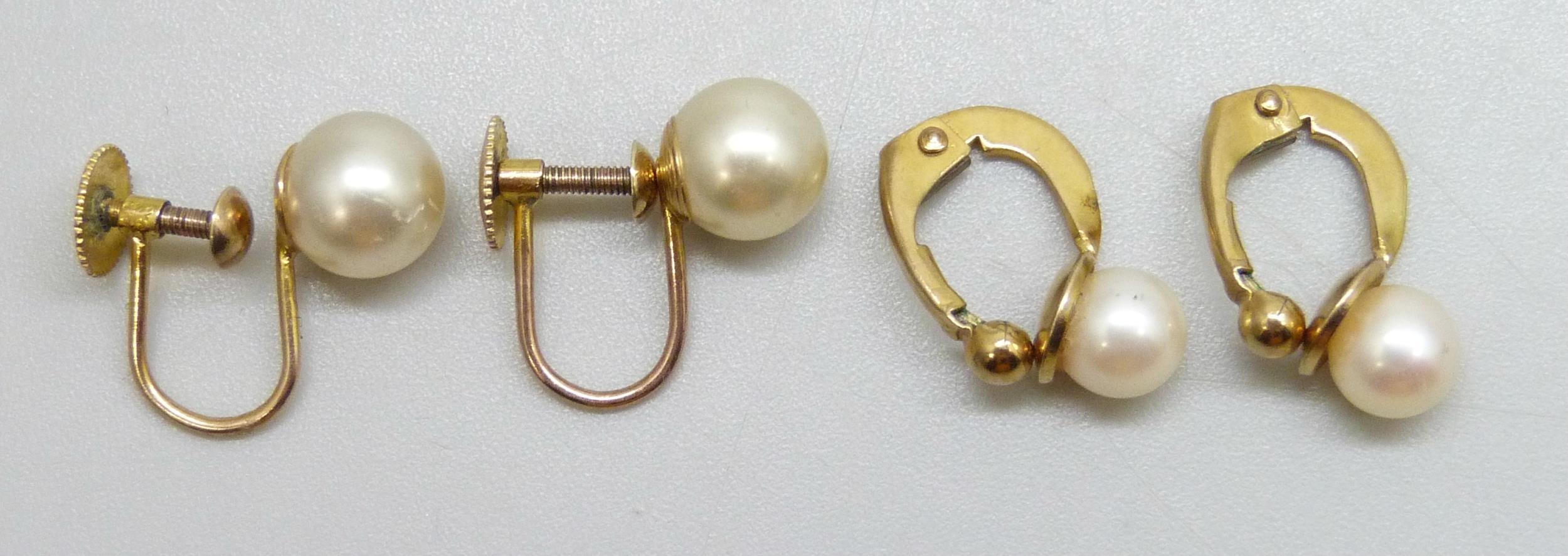Two pairs of 9ct gold mounted pearl earrings, one faux pair, 3.8g total