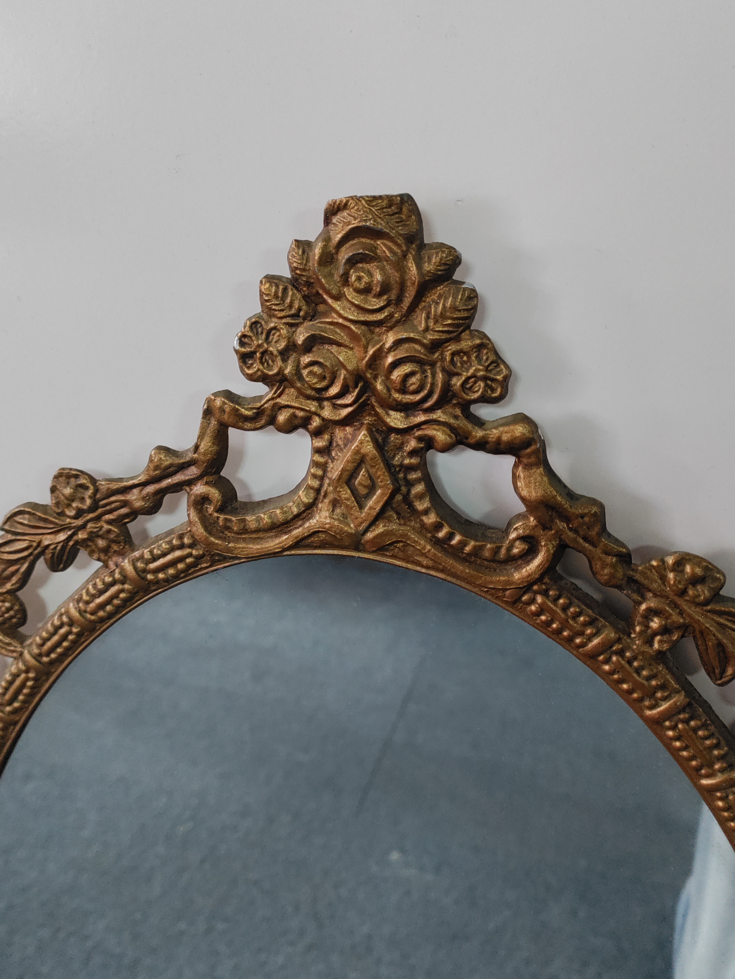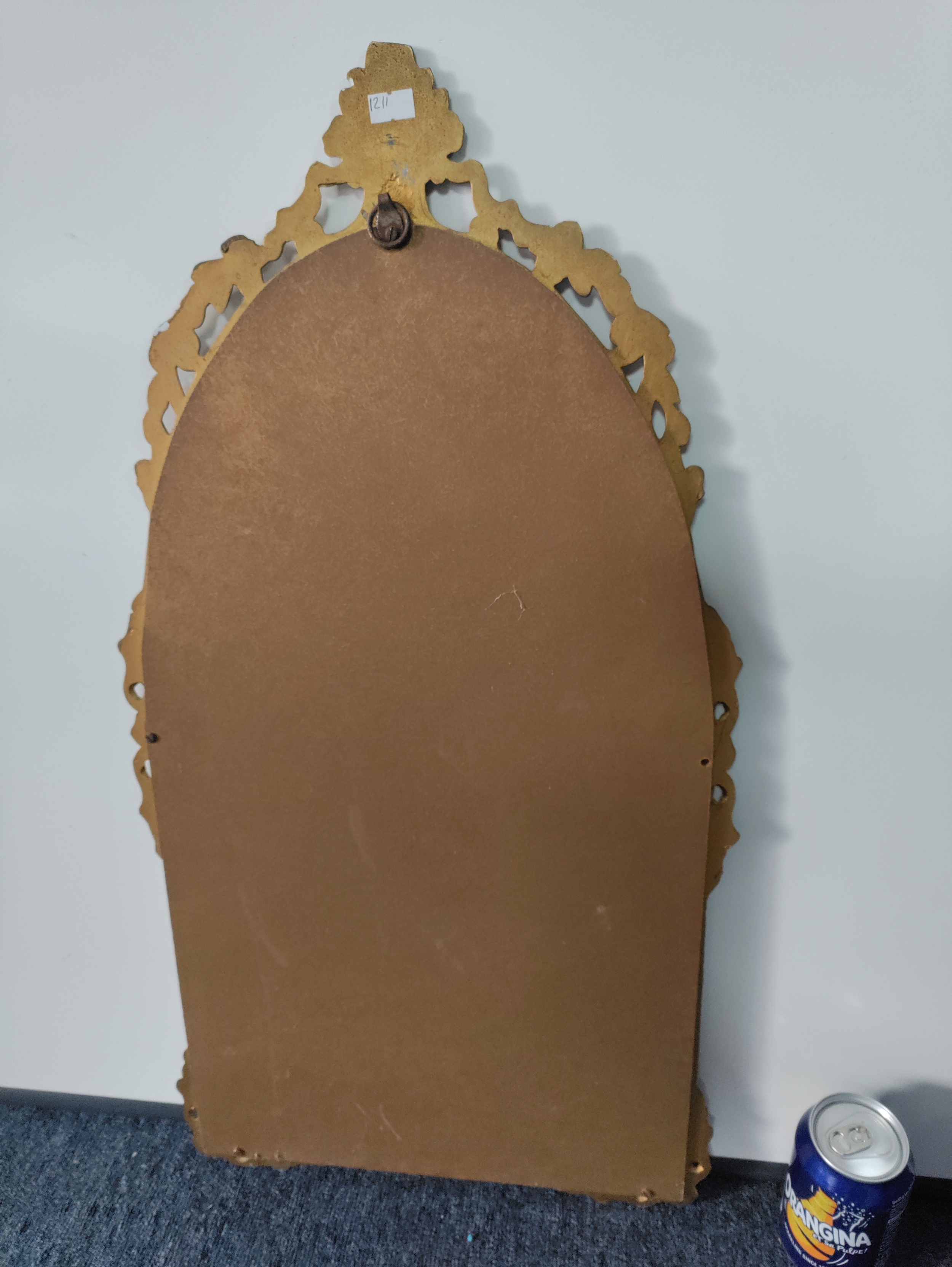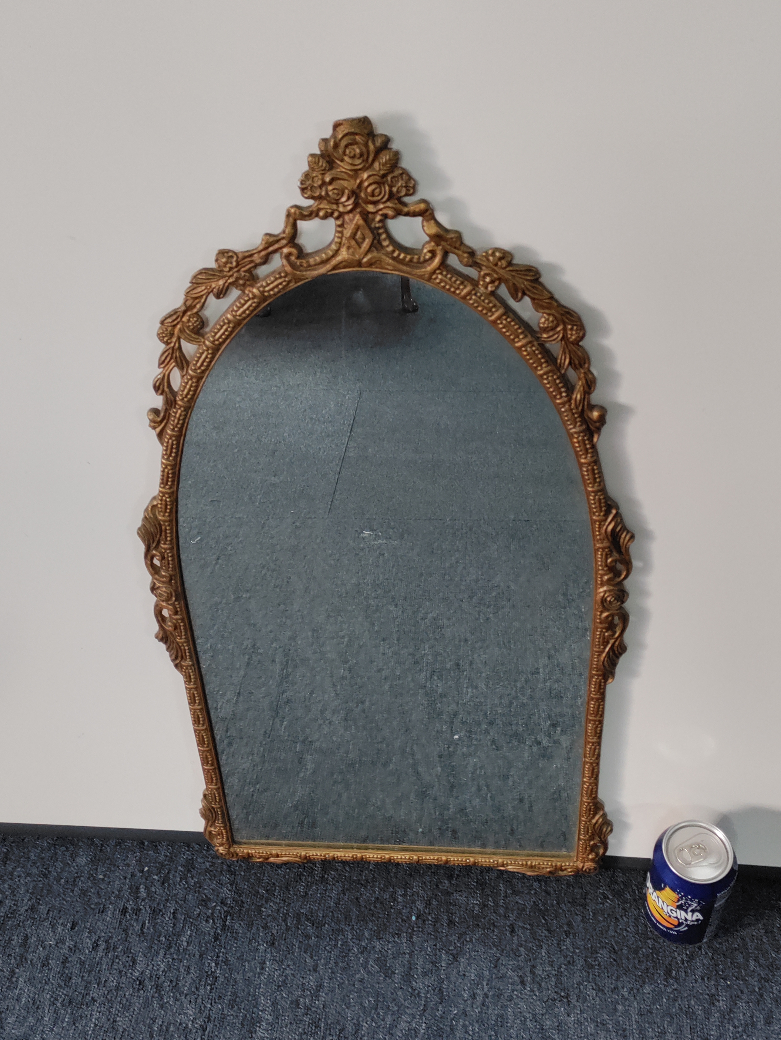 A vintage ornate gold gilt frame wall mirror. H 68cm x 35cm.