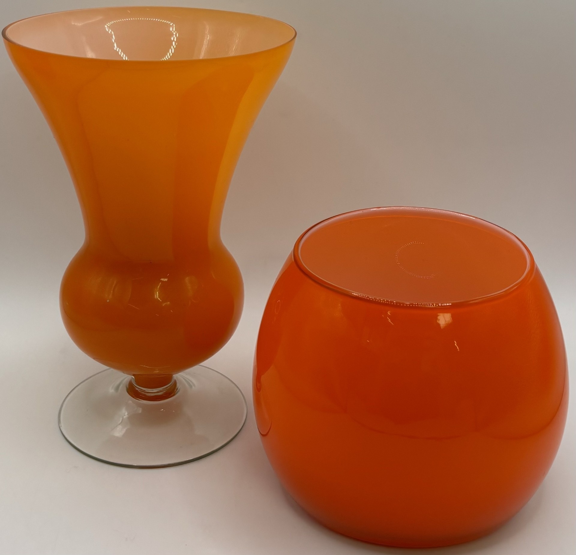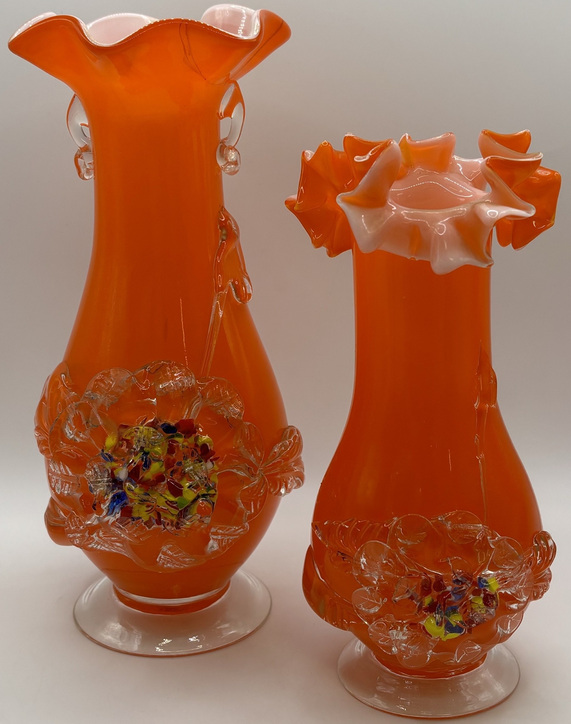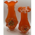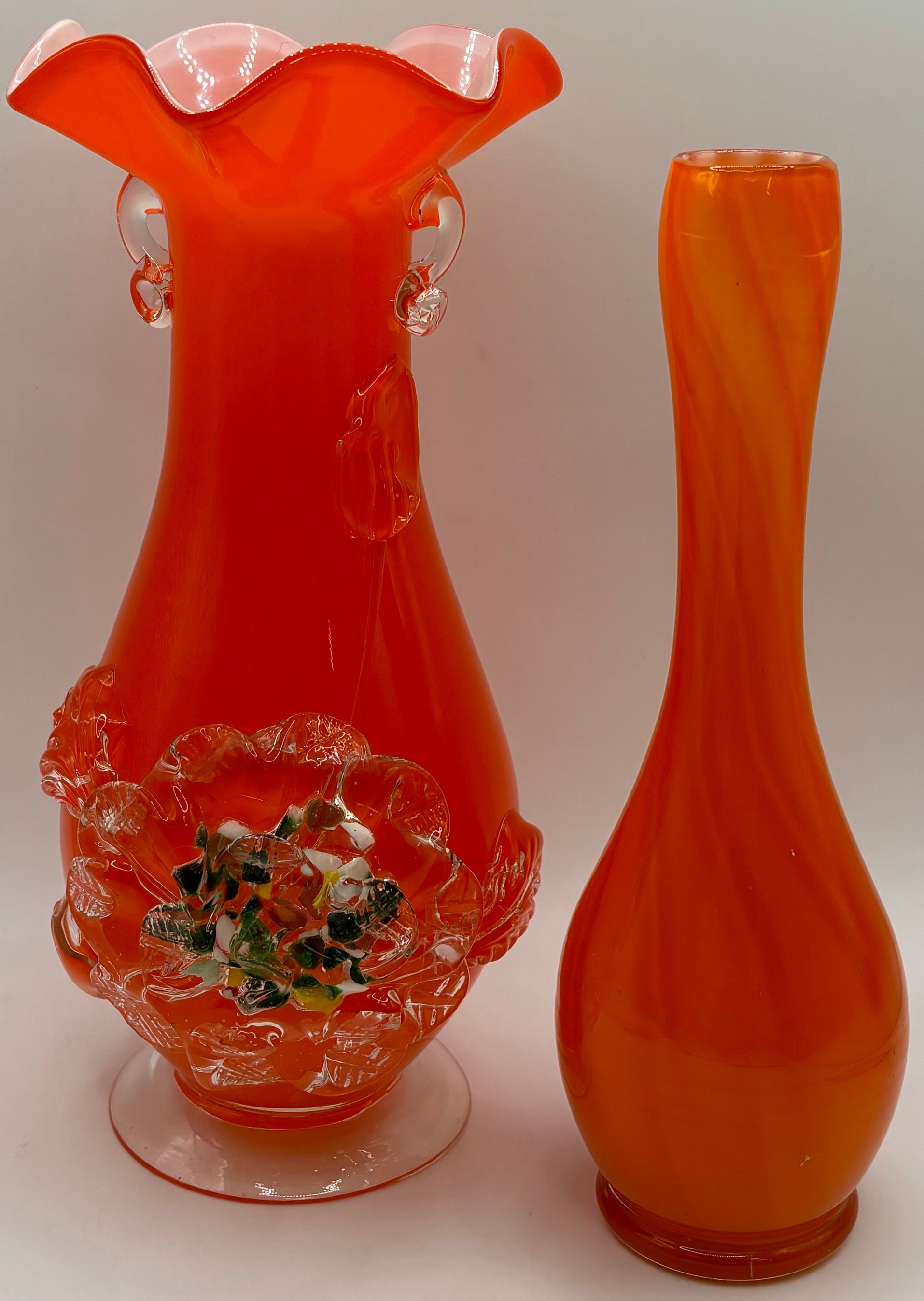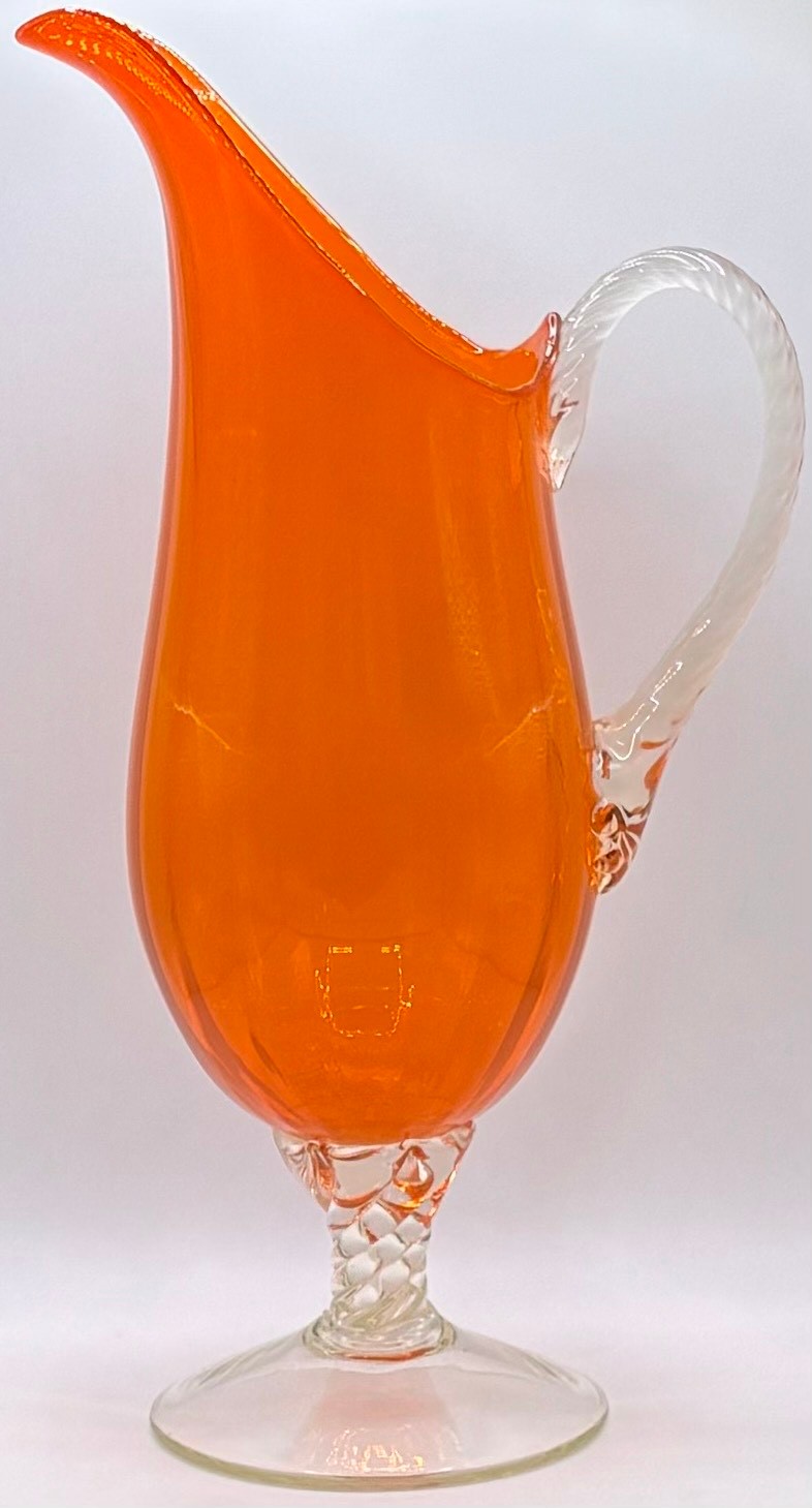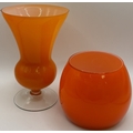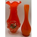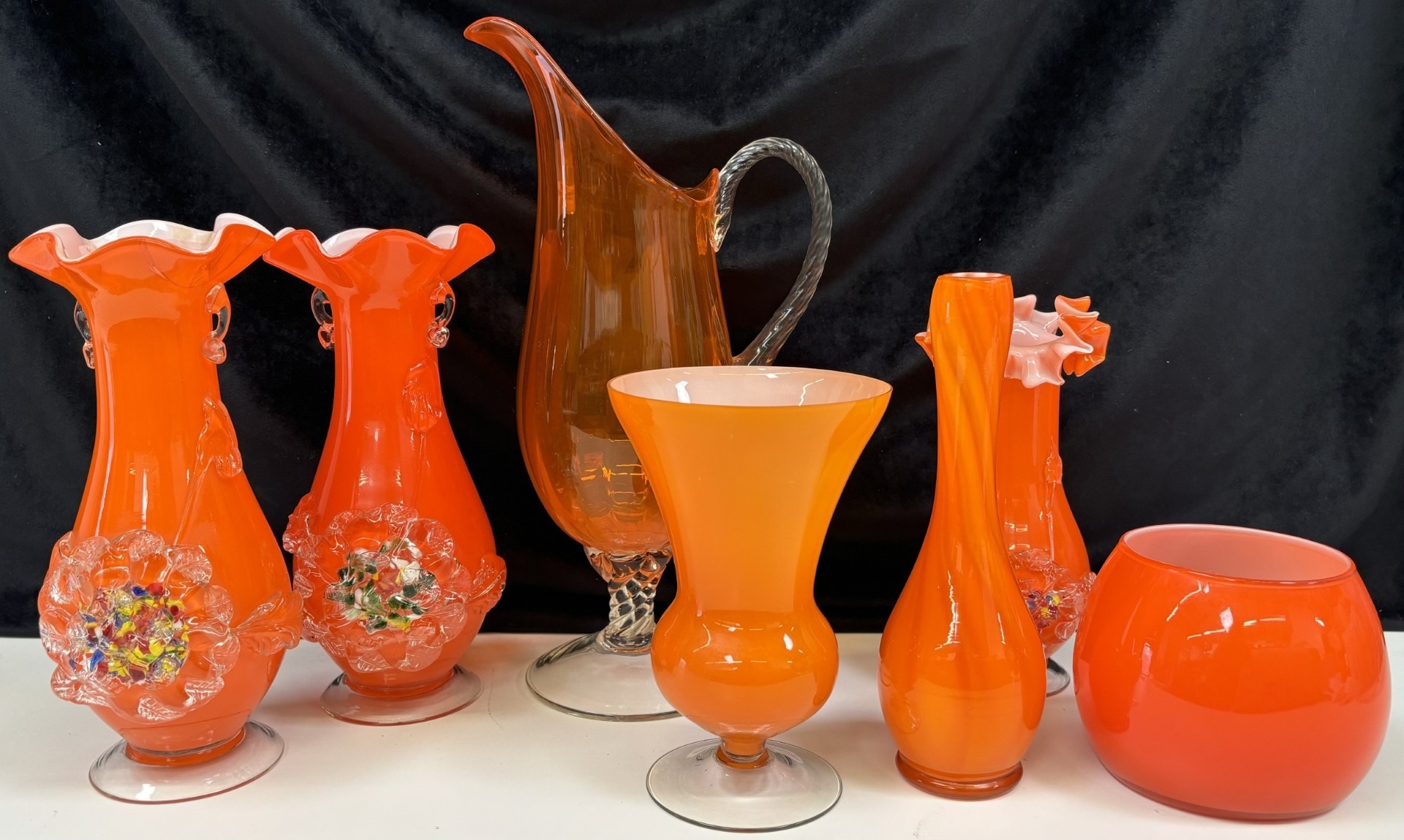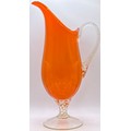 Collection of 7 pieces of mid-century orange art glass. To include 3 plum blossom vases (one pair); pitcher; vase; bull vase & bud vase. Tallest 33cm.